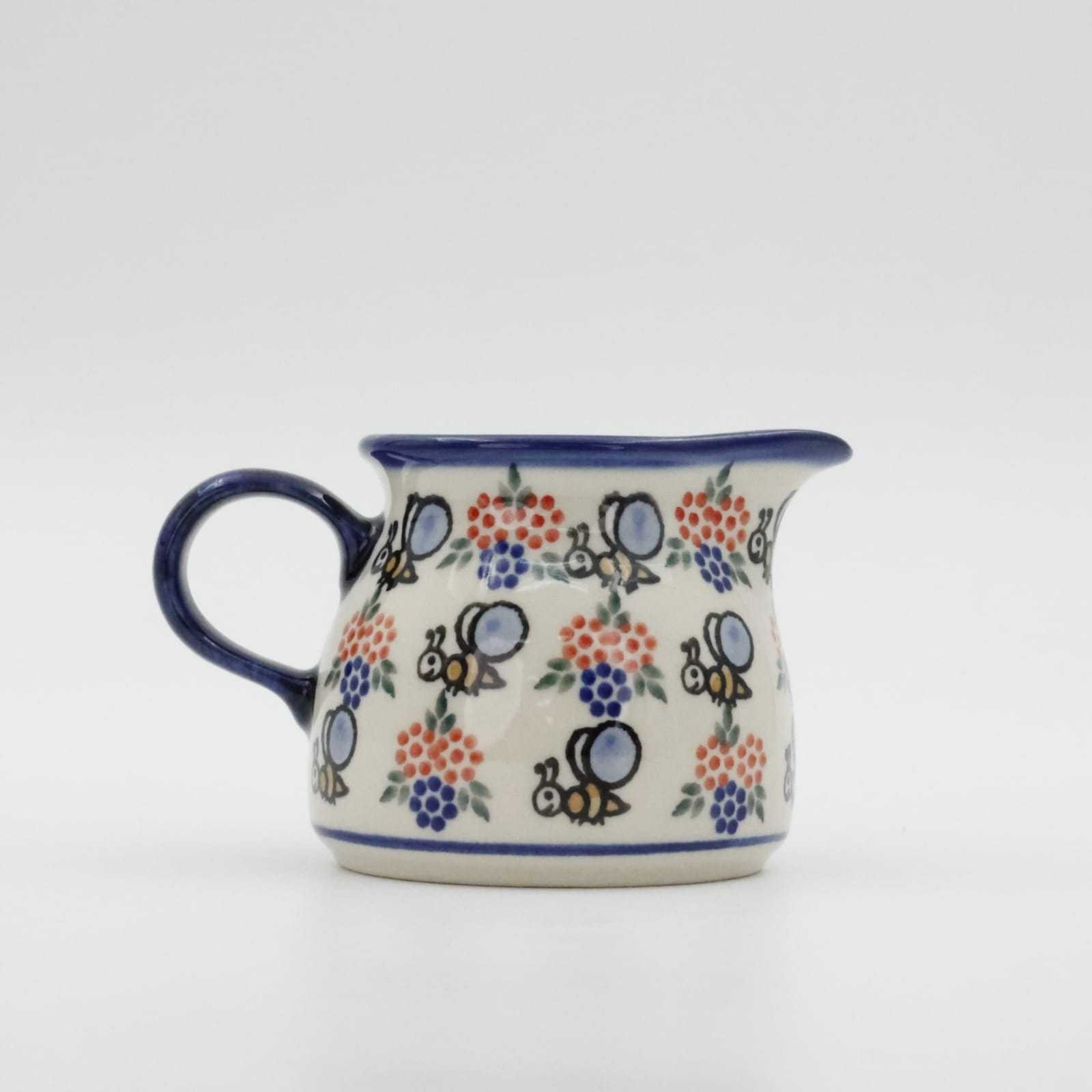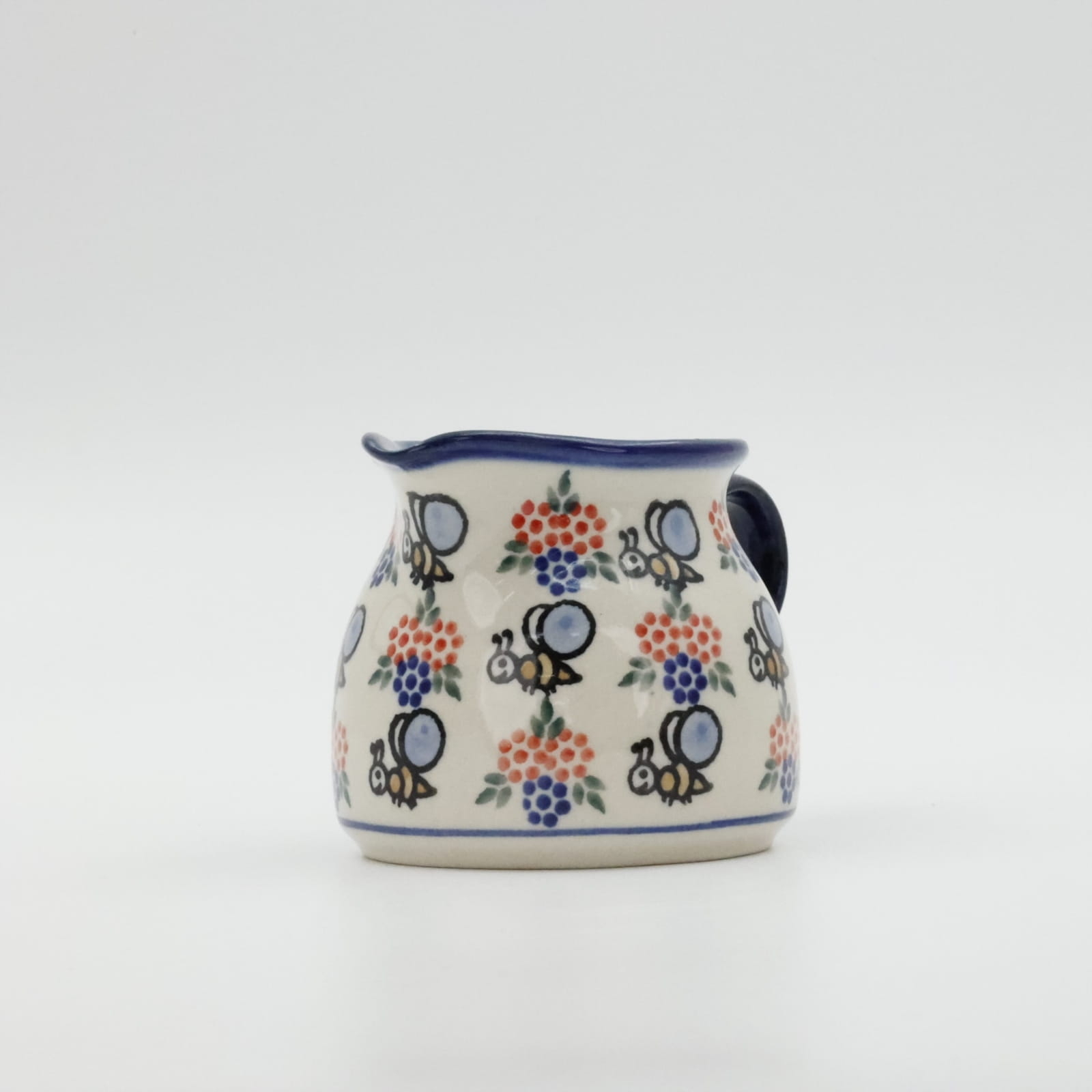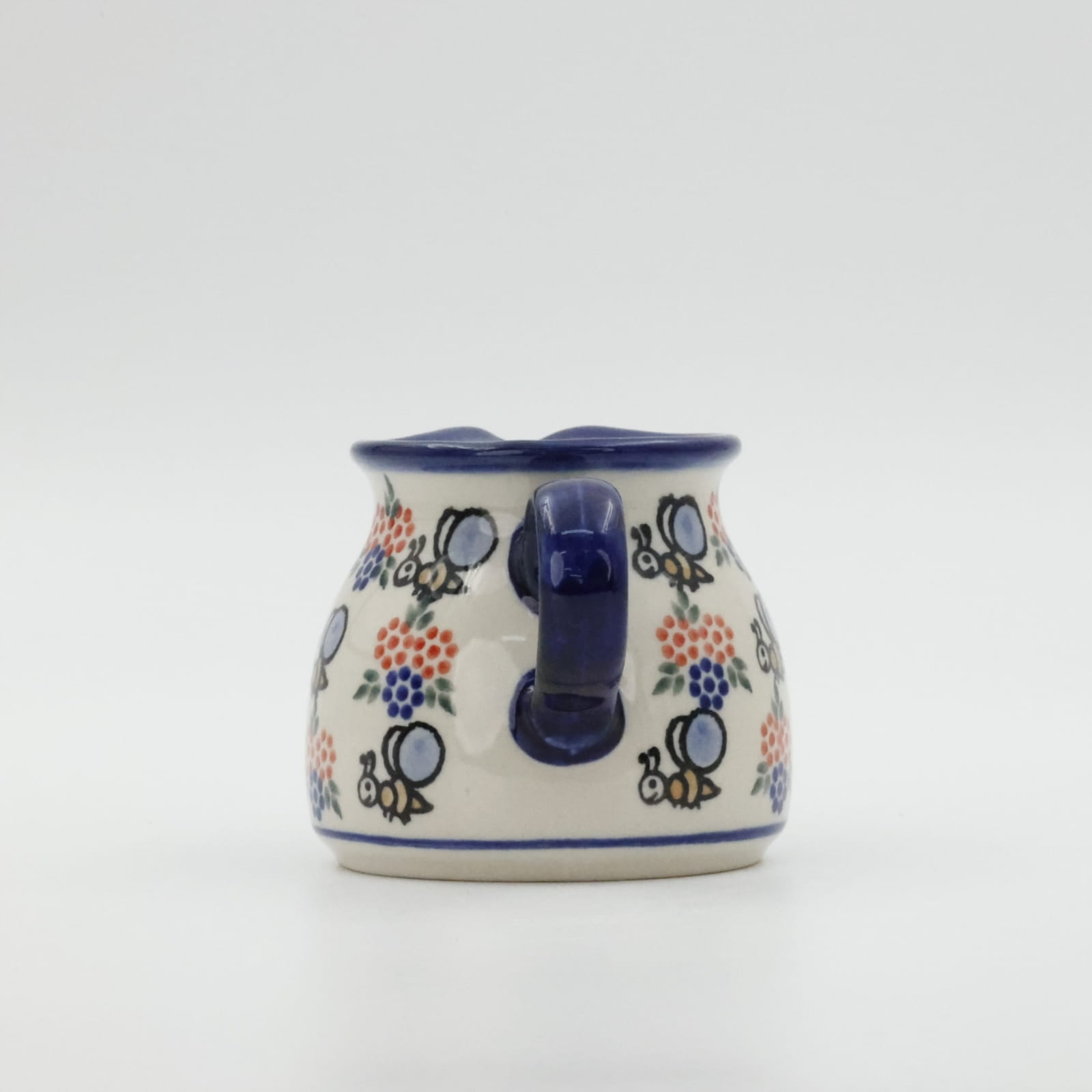 Mlecznik (dzbanek, dzbanuszek) ceramiczny pękaty, ręcznie malowany o pojemności 250 ml, z uchem do wygodnego przenoszenia i dziubkiem do łatwego nalewania mleka.