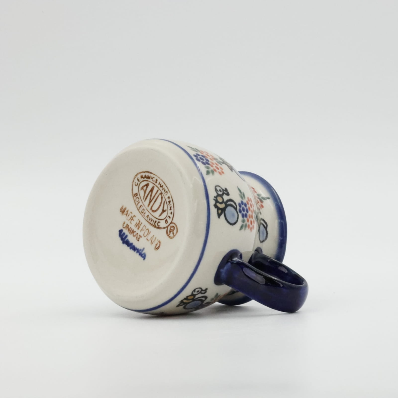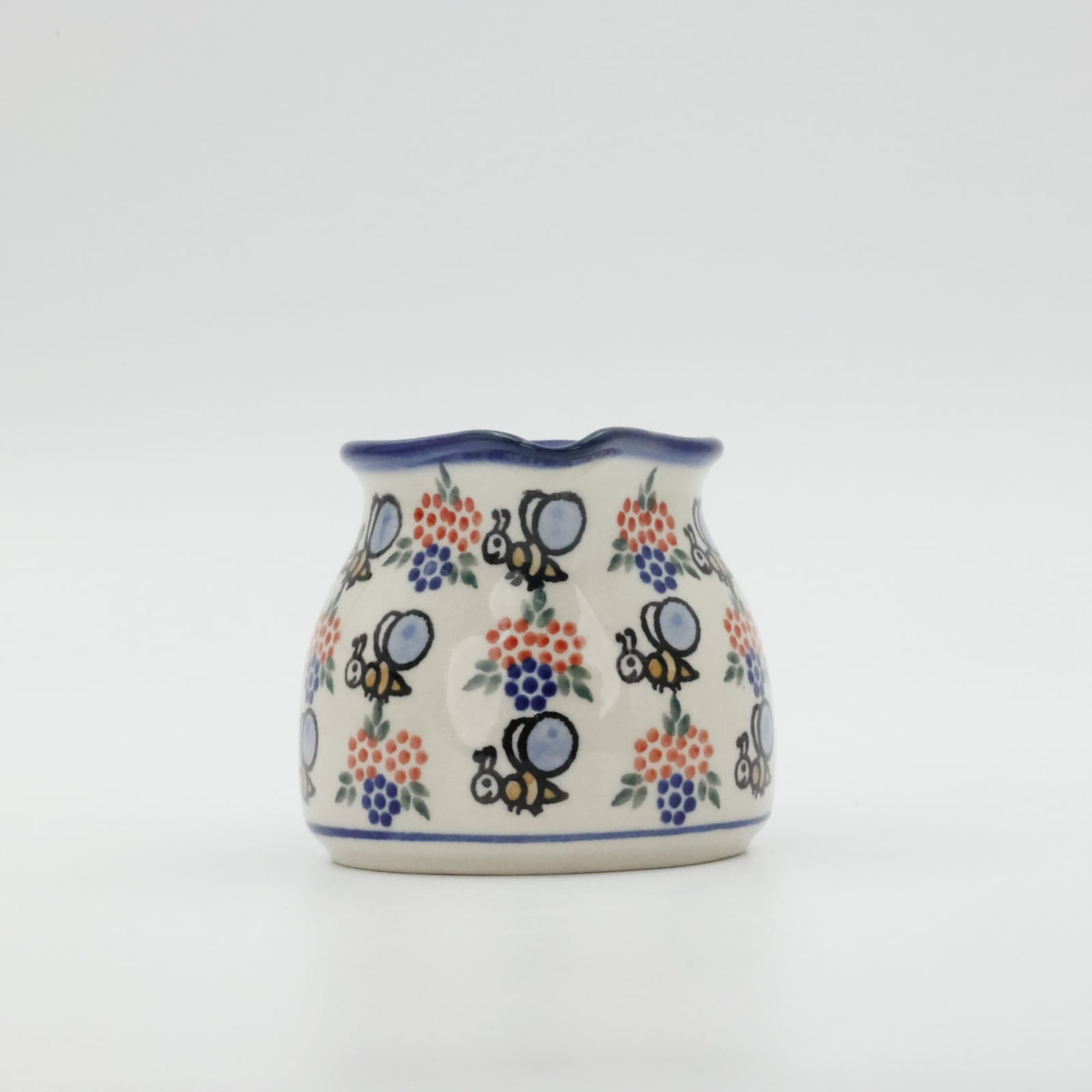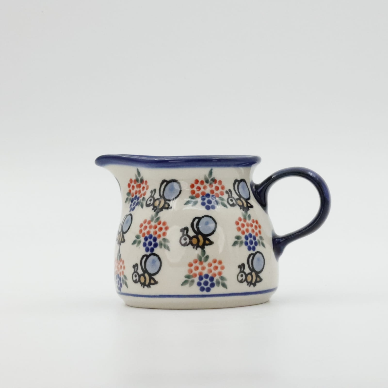 Mlecznik (dzbanek, dzbanuszek) ceramiczny pękaty, ręcznie malowany o pojemności 250 ml, z uchem do wygodnego przenoszenia i dziubkiem do łatwego nalewania mleka.