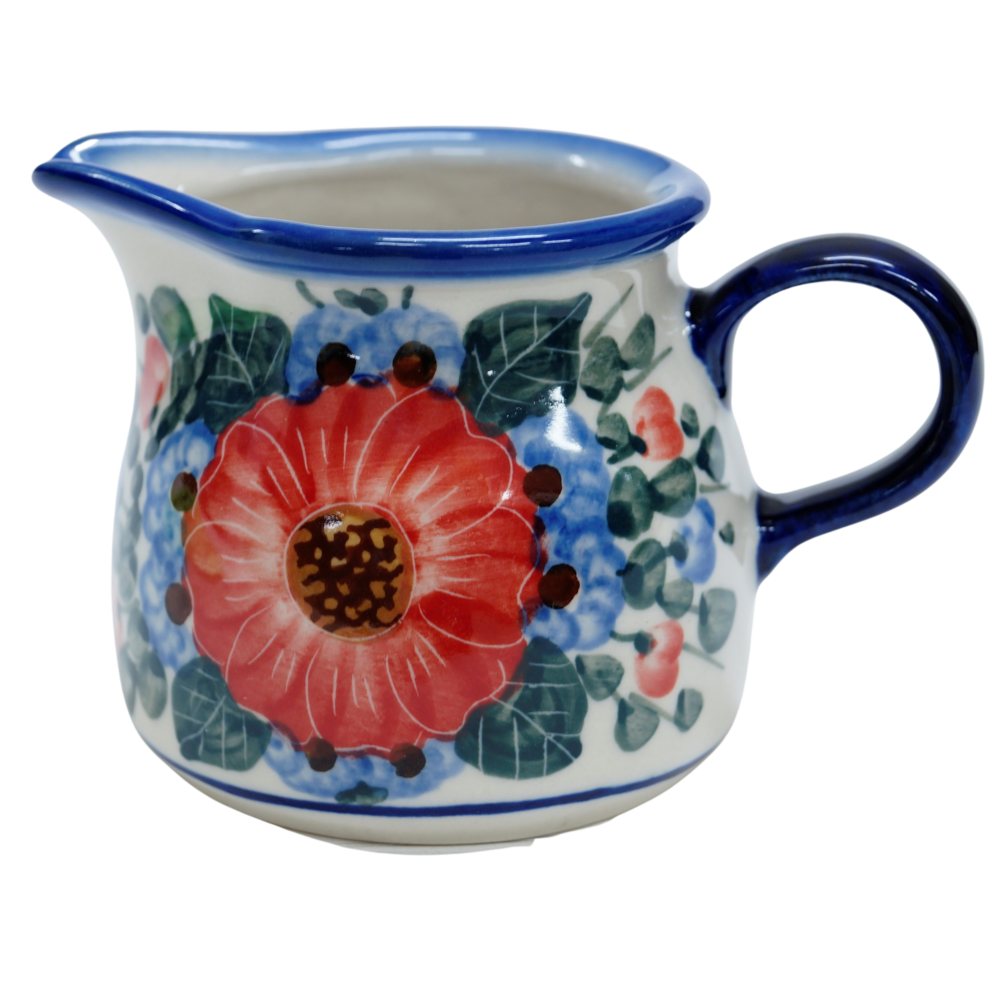 Mlecznik (dzbanek, dzbanuszek) ceramiczny pękaty, ręcznie malowany o pojemności 250 ml, z uchem do wygodnego przenoszenia i dziubkiem do łatwego nalewania mleka.