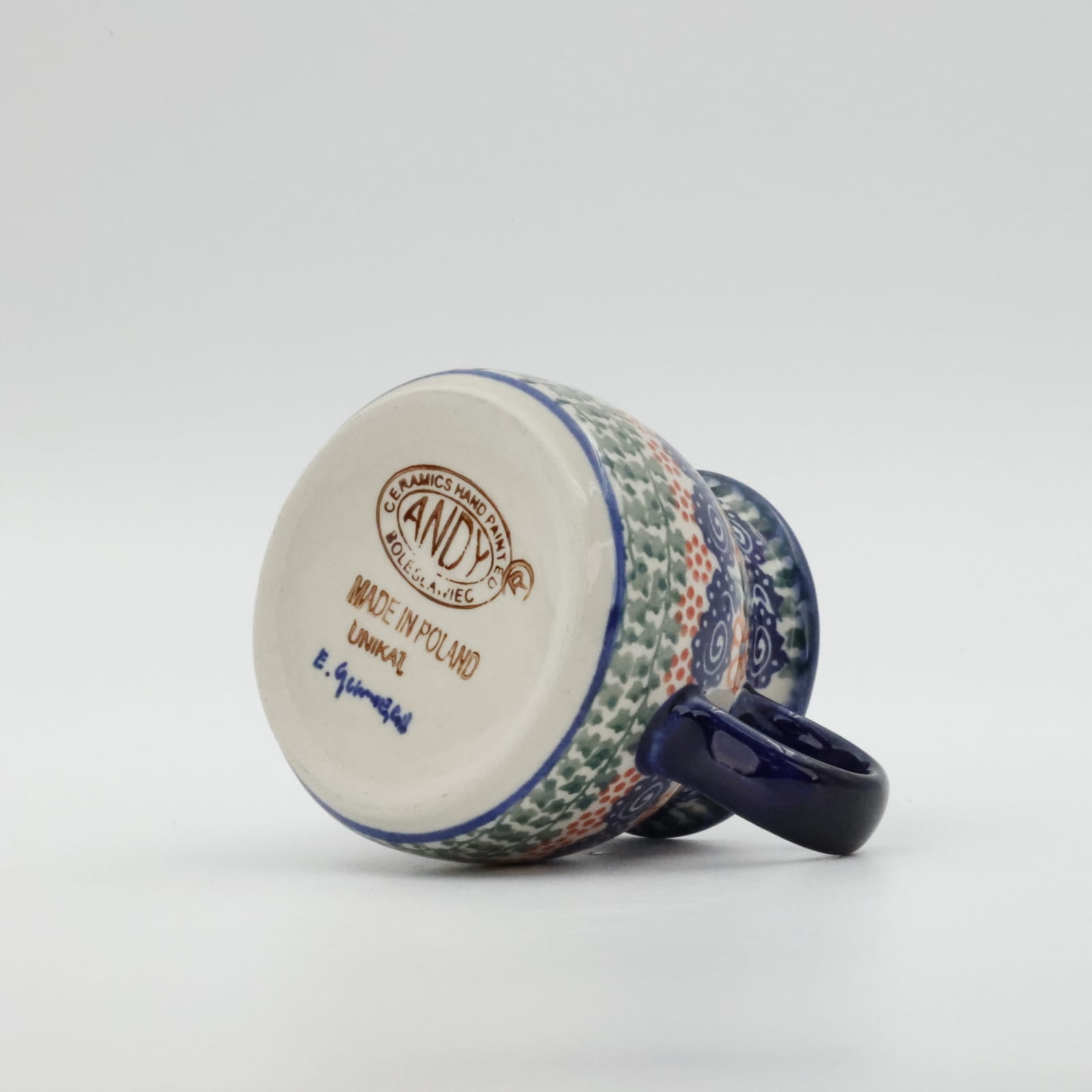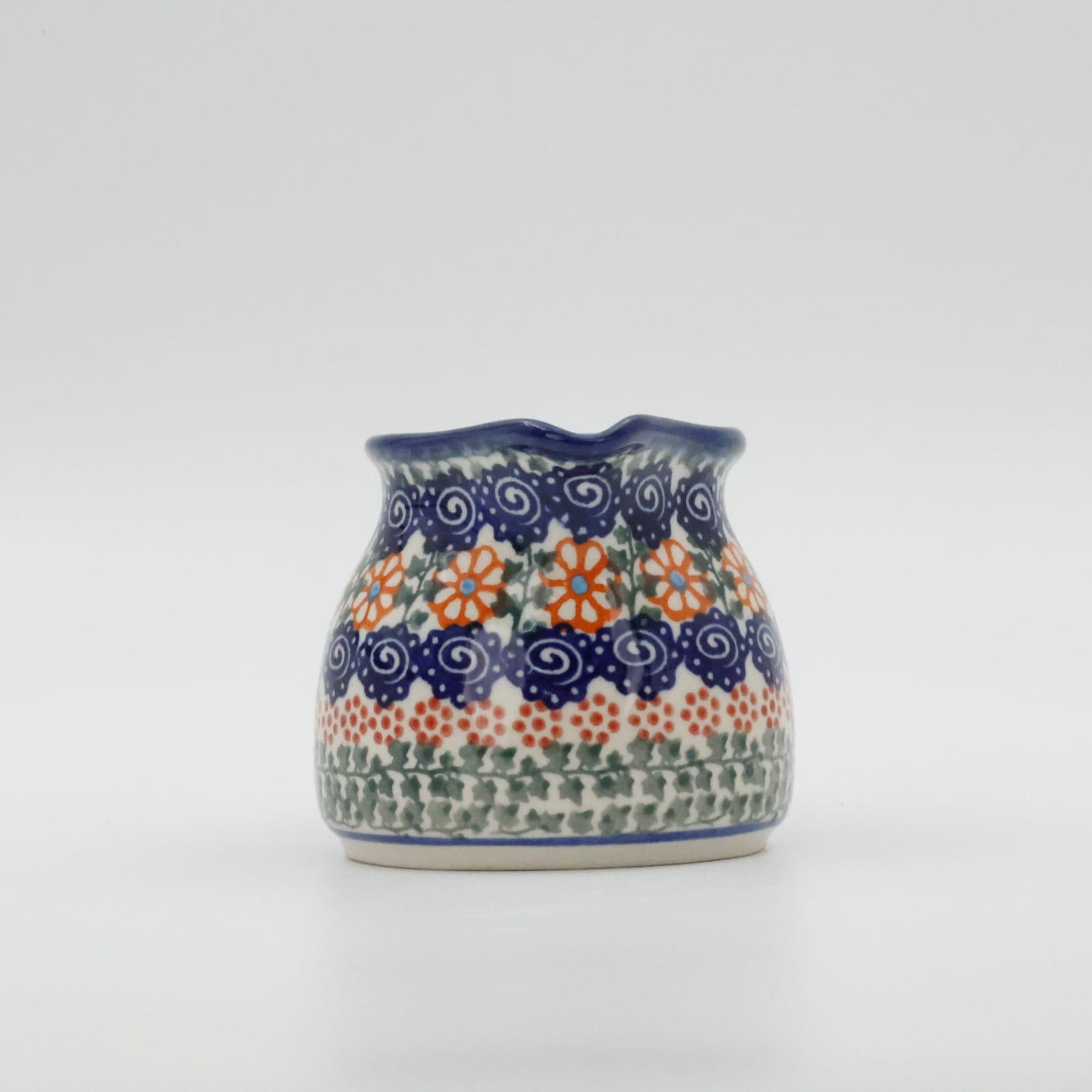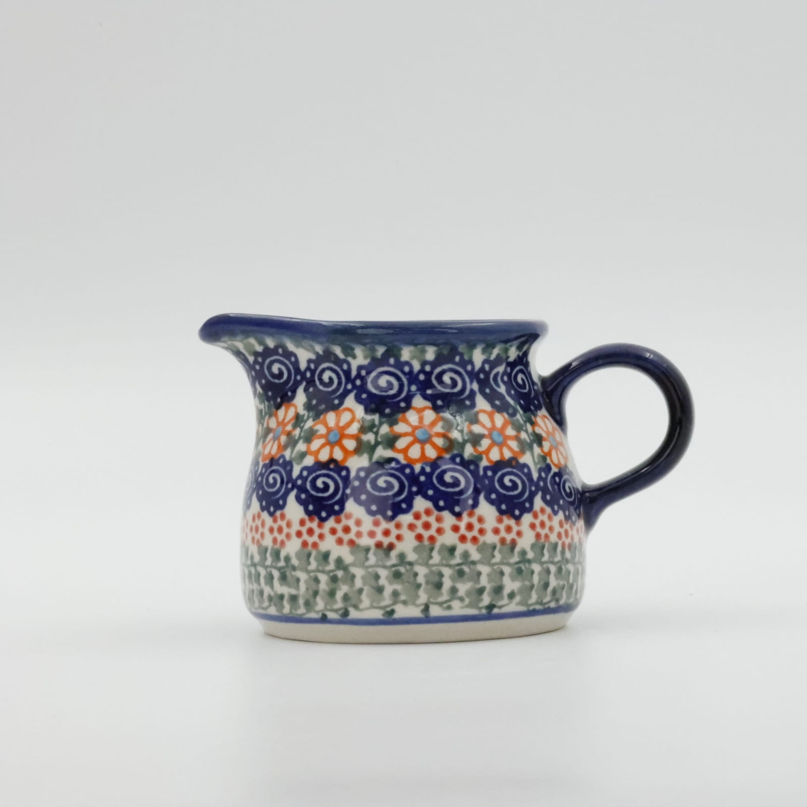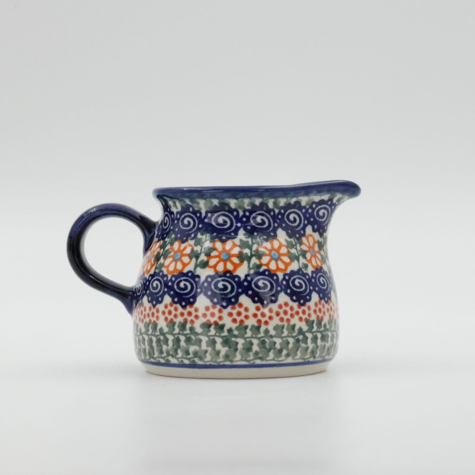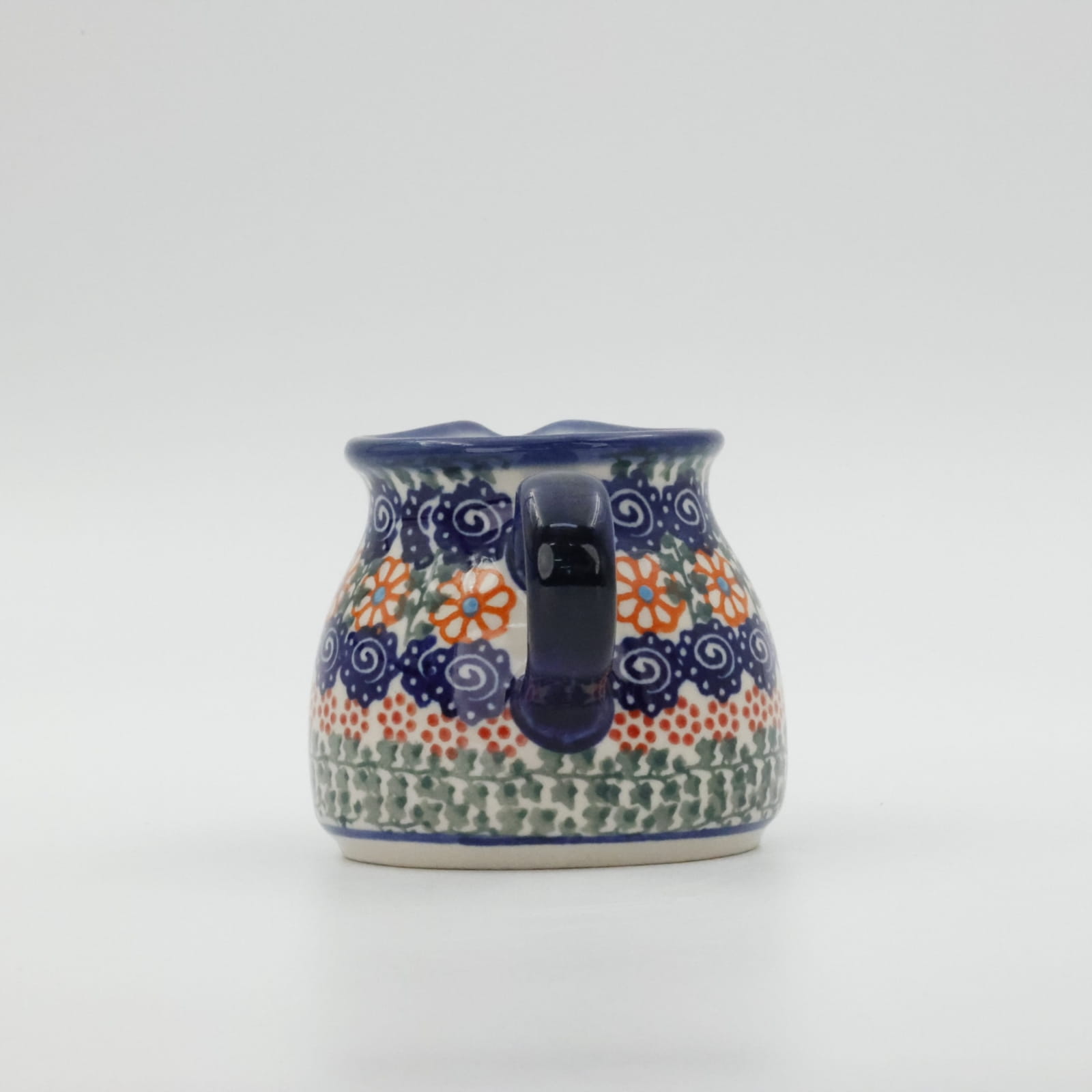 Mlecznik (dzbanek, dzbanuszek) ceramiczny pękaty, ręcznie malowany o pojemności 250 ml, z uchem do wygodnego przenoszenia i dziubkiem do łatwego nalewania mleka.