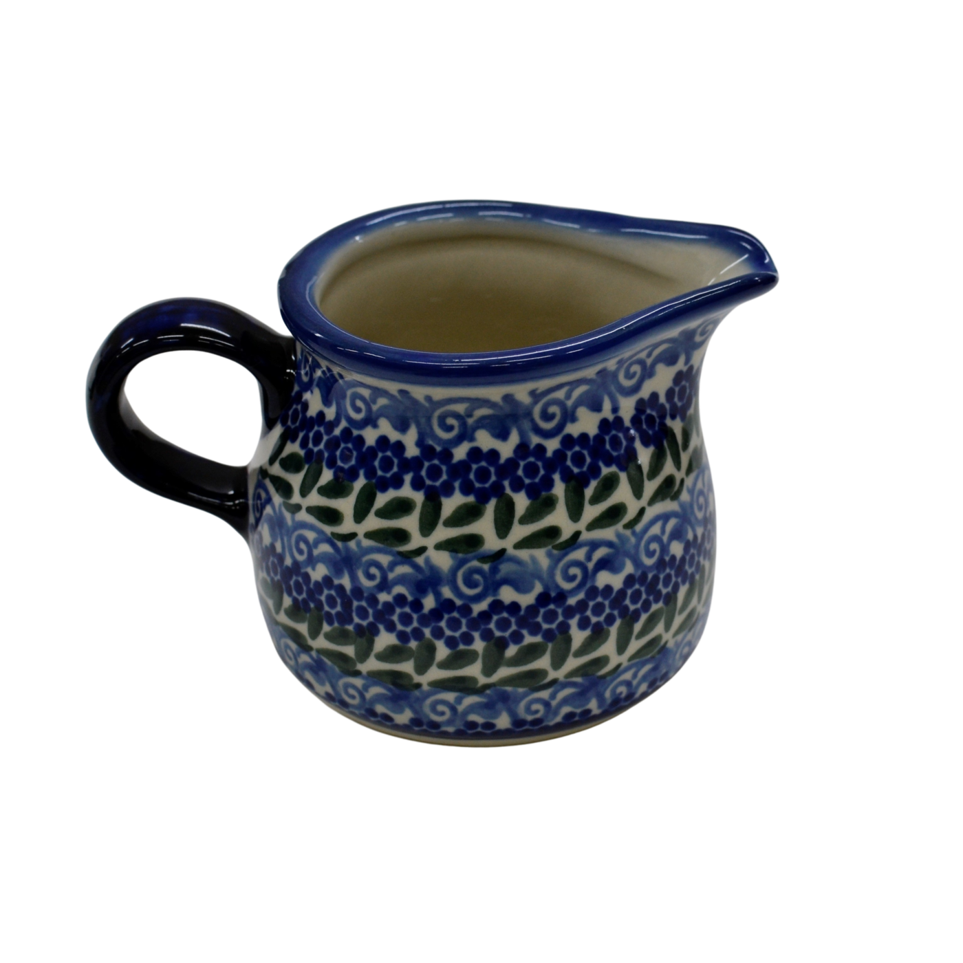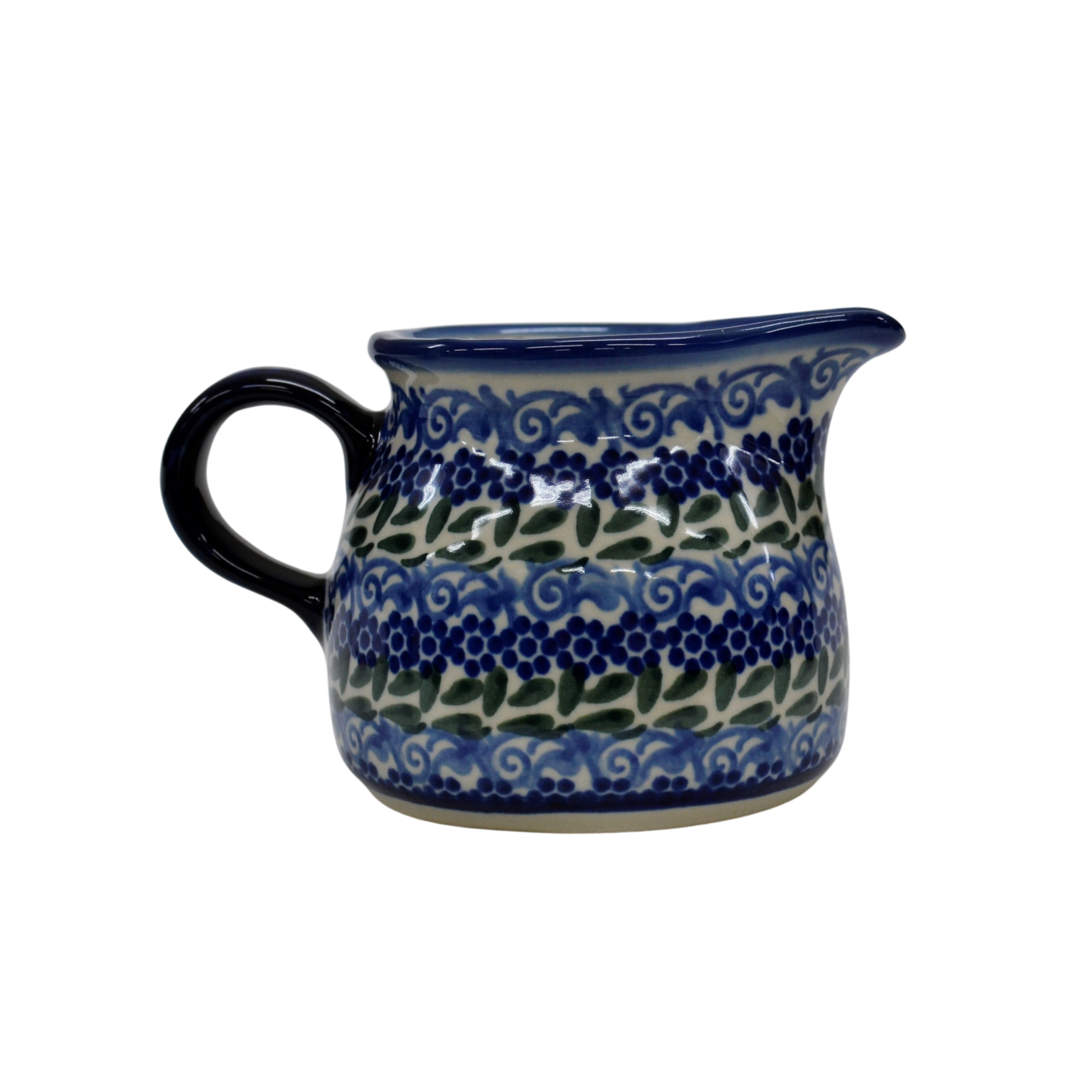 Mlecznik (dzbanek, dzbanuszek) ceramiczny pękaty, ręcznie malowany o pojemności 250 ml, z uchem do wygodnego przenoszenia i dziubkiem do łatwego nalewania mleka.