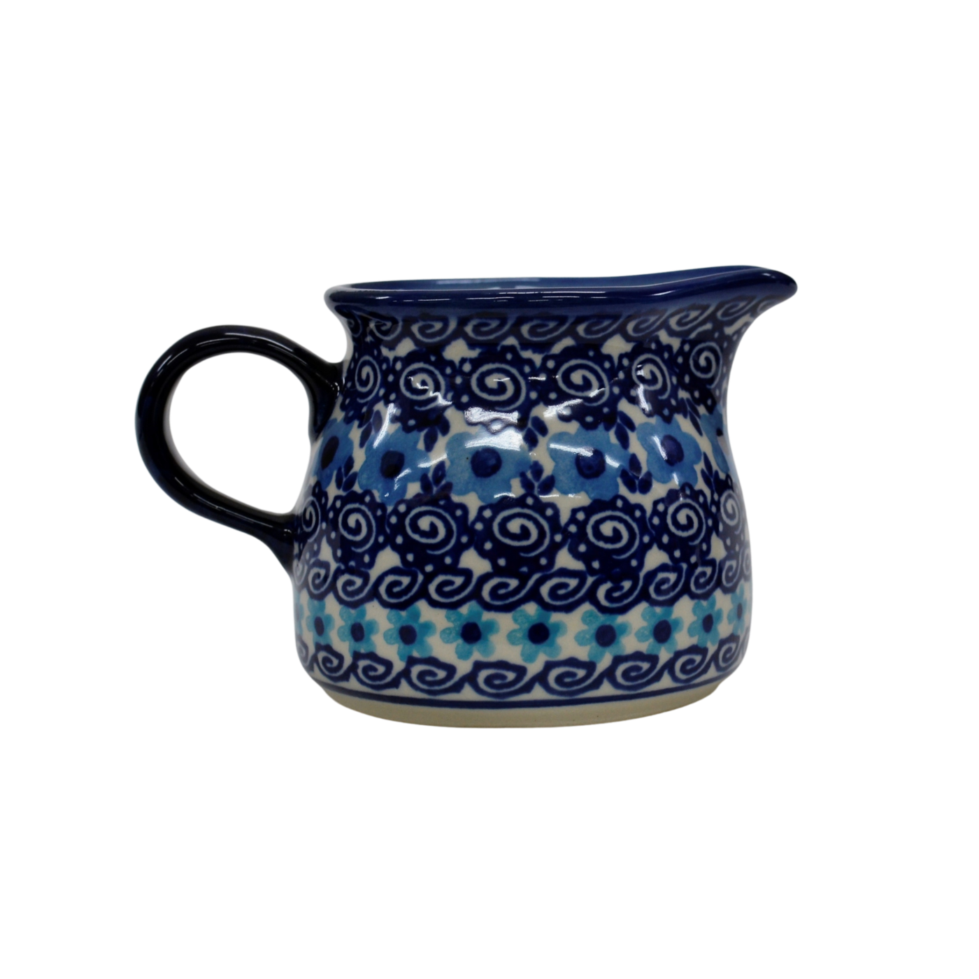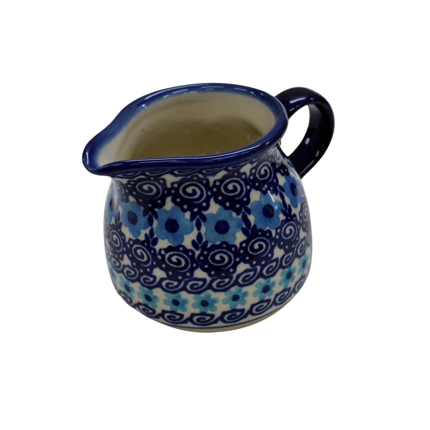 Mlecznik (dzbanek, dzbanuszek) ceramiczny pękaty, ręcznie malowany o pojemności 250 ml, z uchem do wygodnego przenoszenia i dziubkiem do łatwego nalewania mleka.