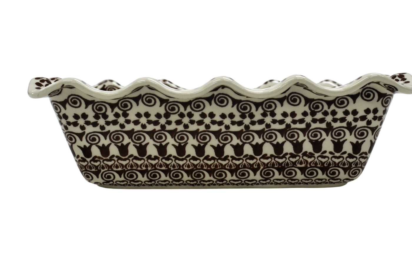 Oryginalny produkt ceramiki bolesławieckiej - ręcznie zdobiona forma ceramiczna do pieczenia chleba i ciast a, pojemności 1 litra , idealna do przygotowywania i zapiekania domowych wypieków, chlebów czy ciast oraz wszelkich pasztetów i potraw mięsnych.