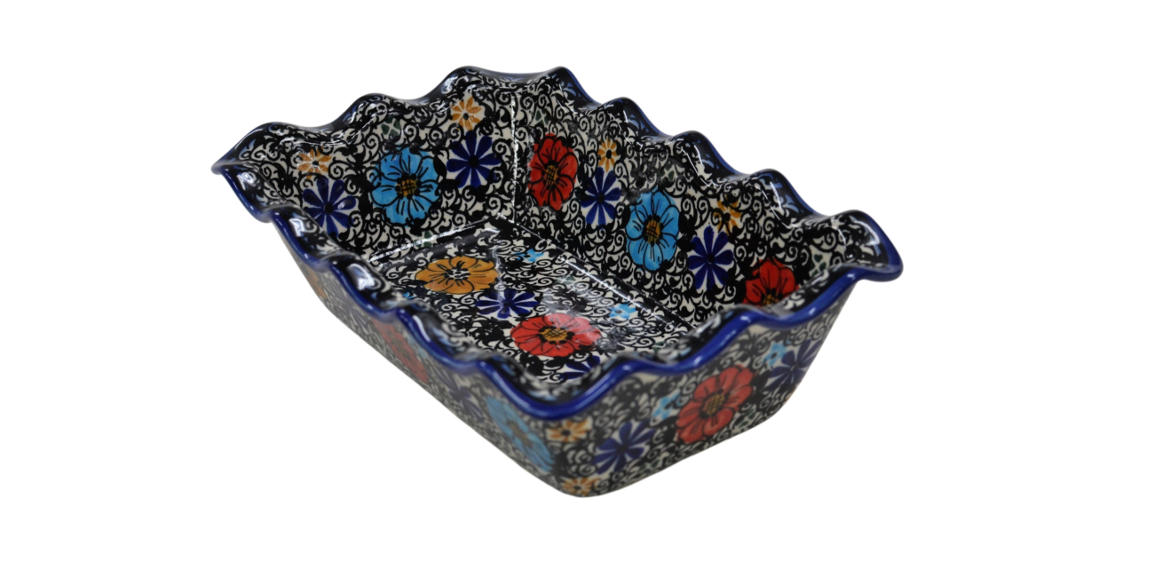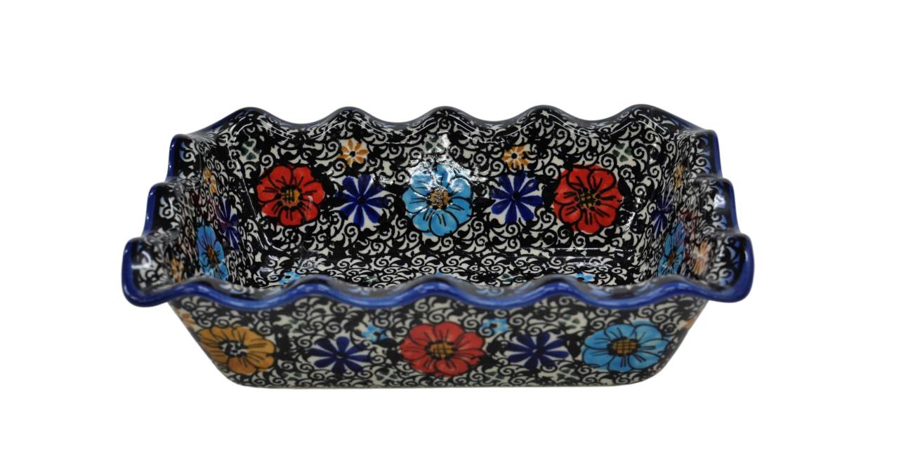 Forma ceramiczna do pieczenia chleba, zapiekania pasztetów jak i przygotowywania pysznych zapiekanek oraz wyrafinowanych dań warzywnych, będzie służyć w Twojej kuchni przez wiele lat. Barwne i oryginalne zdobienia podszkliwne stempelkowe i piękne motywy kwiatowe, nadadzą charakteru serwowanym posiłkom.