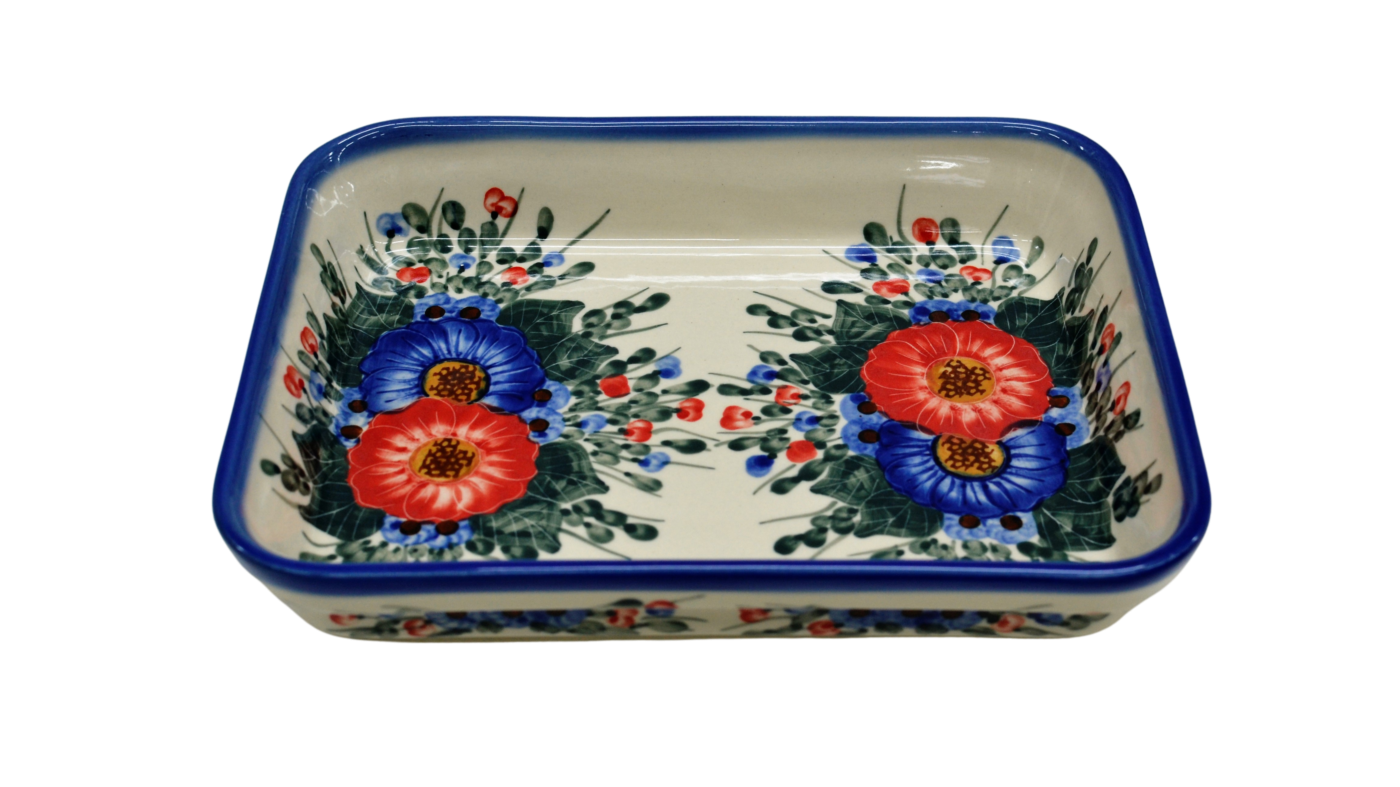 Oryginalny produkt ceramiki artystycznej z Bolesławca, ręcznie dekorowanej, niezmienną metodą od lat – stempelkami. Naczynie ceramiczne do zapiekania – małej wielkości, kuweta, naczynie do pieczenia, idealne do serwowania, pieczenia i zapiekania.