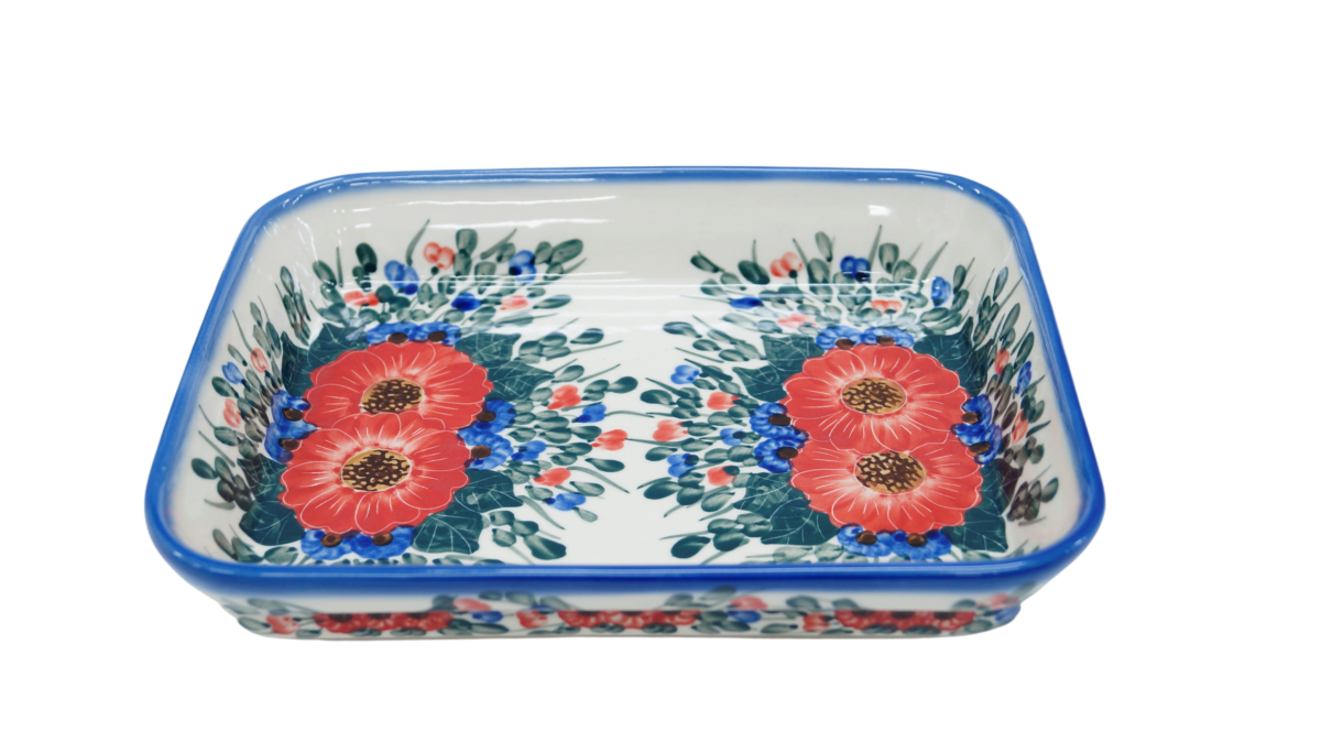 Oryginalny produkt ceramiki artystycznej z Bolesławca, ręcznie dekorowanej, niezmienną metodą od lat – stempelkami. Naczynie ceramiczne do zapiekania – małej wielkości, kuweta, naczynie do pieczenia, idealne do serwowania, pieczenia i zapiekania.