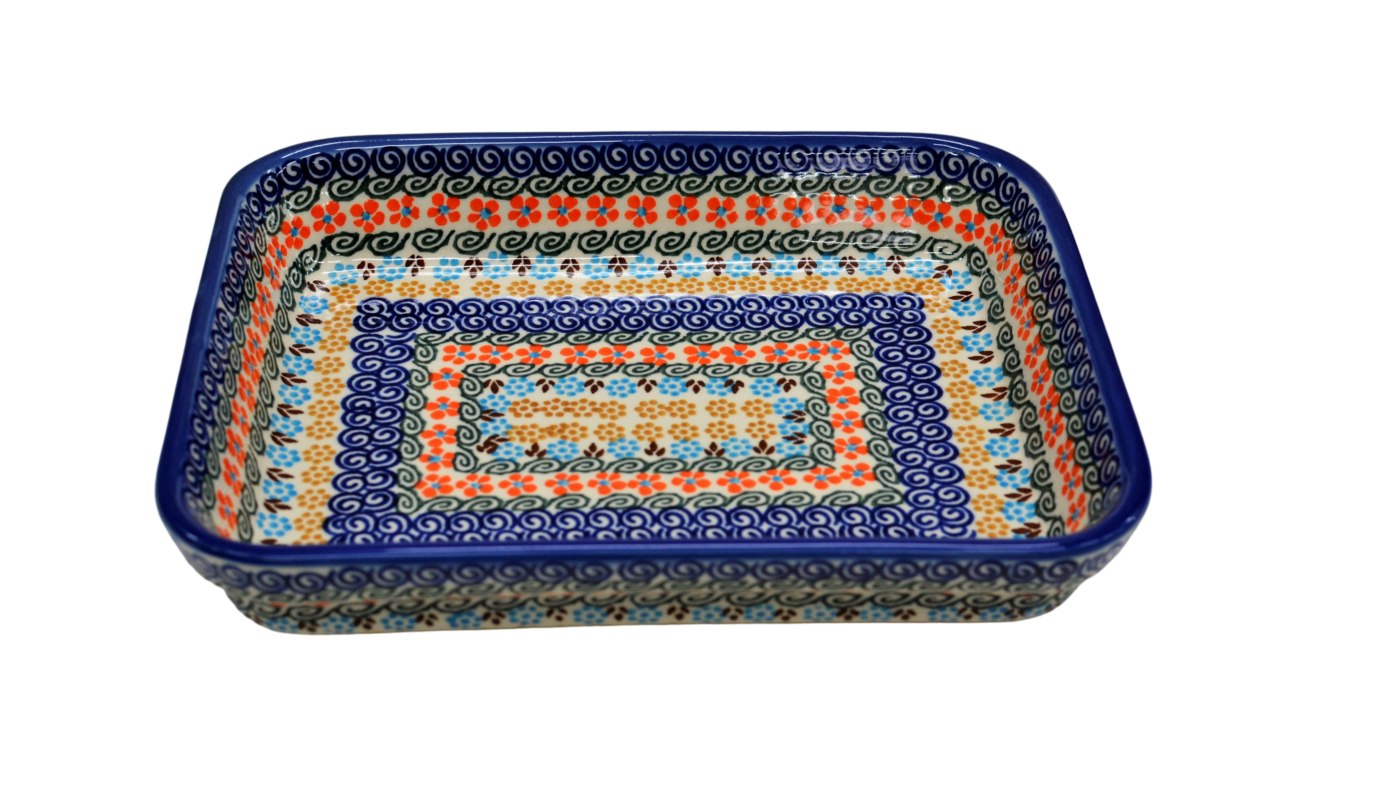 Oryginalny produkt ceramiki artystycznej z Bolesławca, ręcznie dekorowanej, niezmienną metodą od lat – stempelkami. Naczynie ceramiczne do zapiekania – małej wielkości, kuweta, naczynie do pieczenia, idealne do serwowania, pieczenia i zapiekania.