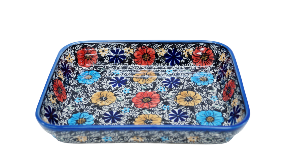 Oryginalny produkt ceramiki artystycznej z Bolesławca, ręcznie dekorowanej, niezmienną metodą od lat – stempelkami. Naczynie ceramiczne do zapiekania – małej wielkości, kuweta, naczynie do pieczenia, idealne do serwowania, pieczenia i zapiekania.