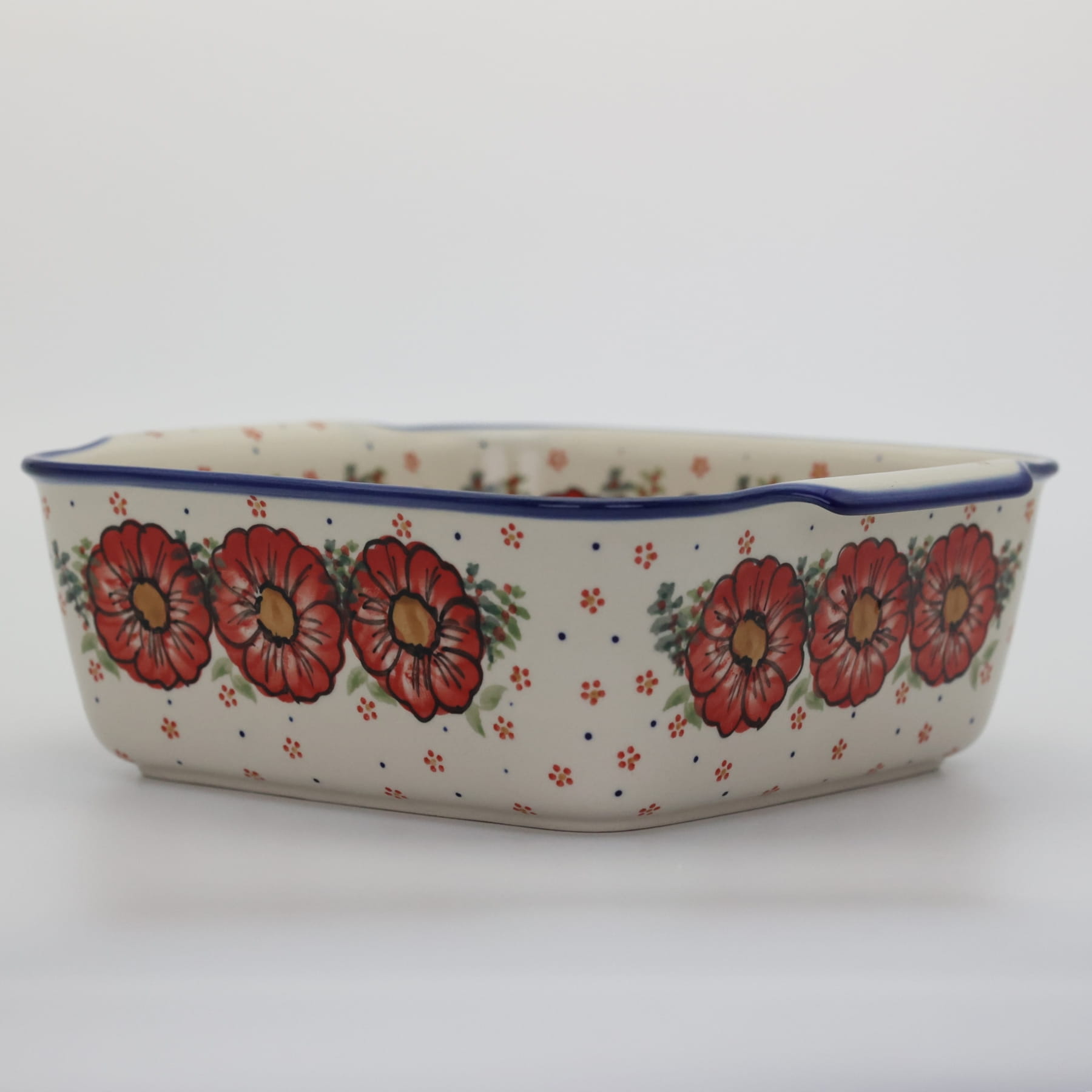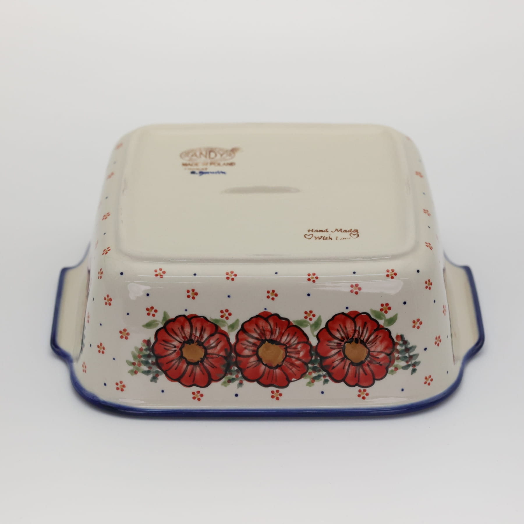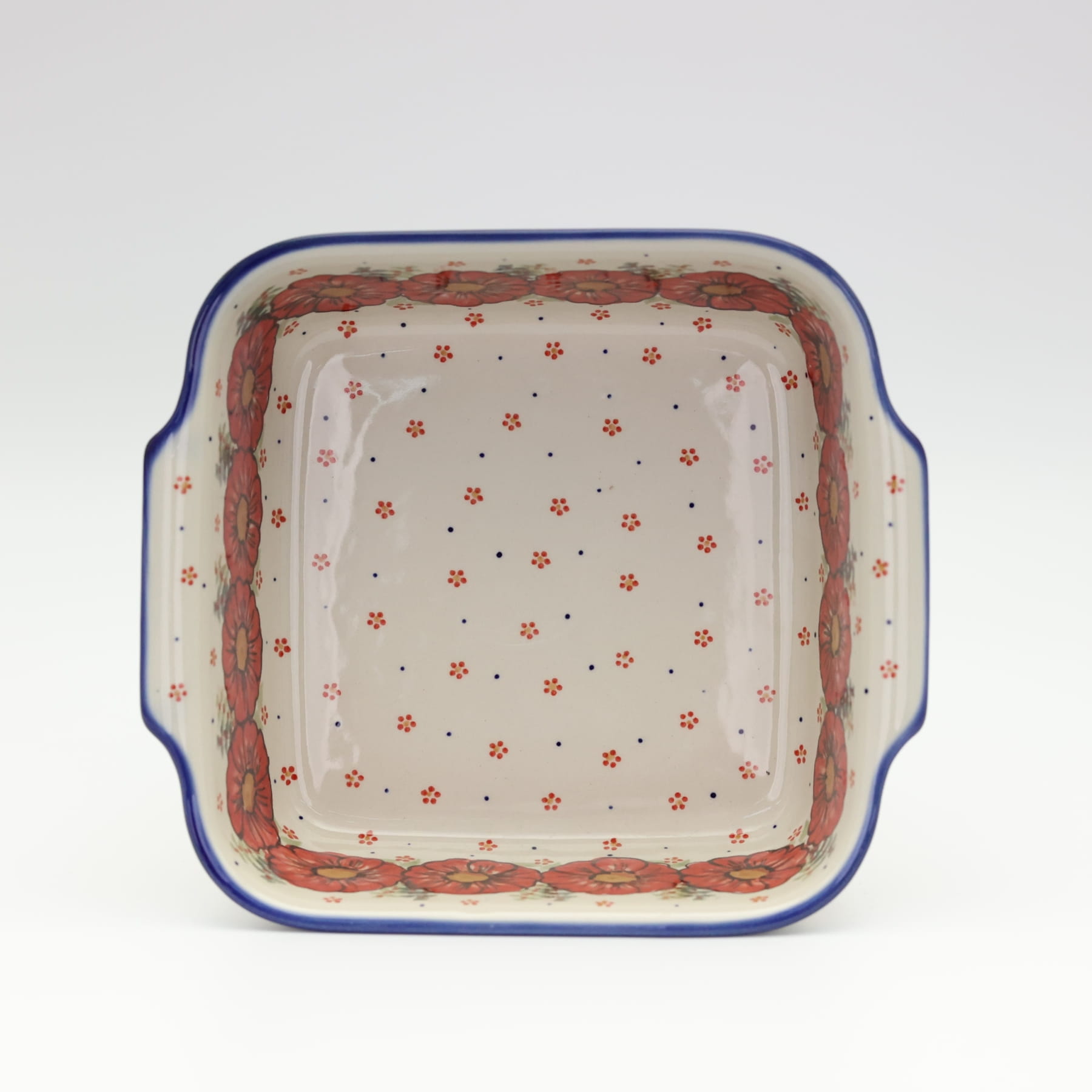 Naczynie kwadratowe duże wzbogaca kolekcję użytkowych naczyń ceramicznych o wszechstronnym zastosowaniu, oryginalna ceramika bolesławiecka, wyprodukowana metodą wytwarzania ceramiki charakterystyczną tylko dla produktów z regionu Bolesławca. Gładka powierzchnia z wytrzymałą powłoką szkliwa i wzmocnionymi krawędziami, odporna na zmywanie w zmywarkach, użytkowanie w mikrofalach i piekarnikach. Ręcznie malowane zdobienia ukryte są pod warstwą przejrzystego szkliwa, która dodaje blasku a przede wszystkim odporności na wysokie temperatury.