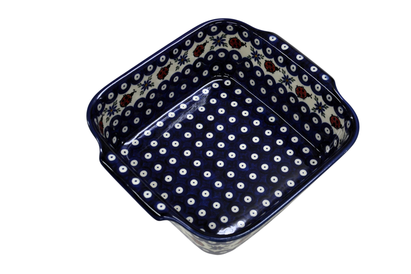 Naczynie kwadratowe duże wzbogaca kolekcję użytkowych naczyń ceramicznych o wszechstronnym zastosowaniu, oryginalna ceramika bolesławiecka, wyprodukowana metodą wytwarzania ceramiki charakterystyczną tylko dla produktów z regionu Bolesławca. Gładka powierzchnia z wytrzymałą powłoką szkliwa i wzmocnionymi krawędziami, odporna na zmywanie w zmywarkach, użytkowanie w mikrofalach i piekarnikach. Ręcznie malowane zdobienia ukryte są pod warstwą przejrzystego szkliwa, która dodaje blasku a przede wszystkim odporności na wysokie temperatury.