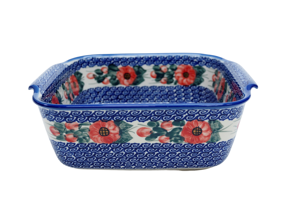 Naczynie kwadratowe duże wzbogaca kolekcję użytkowych naczyń ceramicznych o wszechstronnym zastosowaniu, oryginalna ceramika bolesławiecka, wyprodukowana metodą wytwarzania ceramiki charakterystyczną tylko dla produktów z regionu Bolesławca. Gładka powierzchnia z wytrzymałą powłoką szkliwa i wzmocnionymi krawędziami, odporna na zmywanie w zmywarkach, użytkowanie w mikrofalach i piekarnikach. Ręcznie malowane zdobienia ukryte są pod warstwą przejrzystego szkliwa, która dodaje blasku a przede wszystkim odporności na wysokie temperatury.