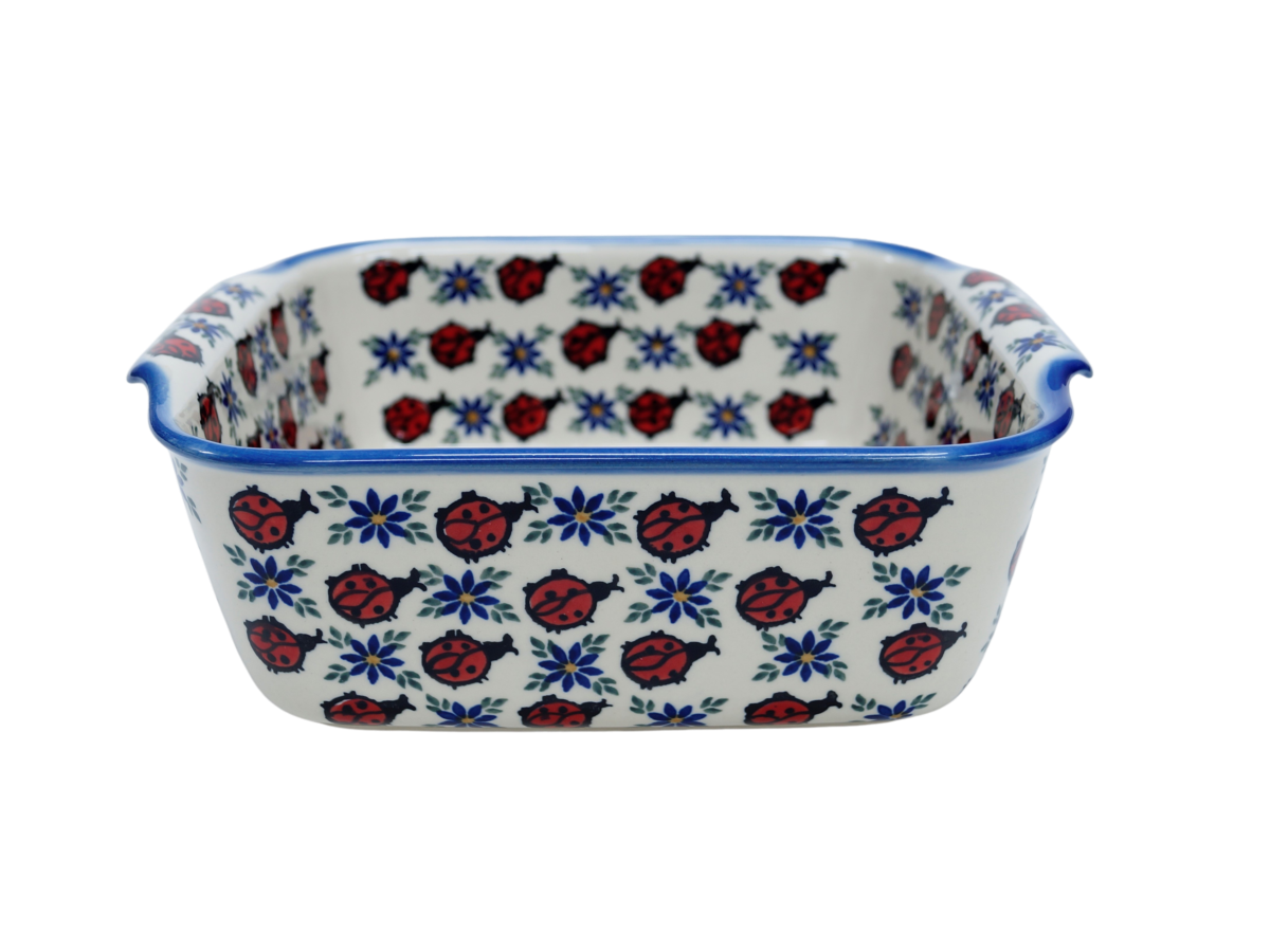Naczynie kwadratowe duże wzbogaca kolekcję użytkowych naczyń ceramicznych o wszechstronnym zastosowaniu, oryginalna ceramika bolesławiecka, wyprodukowana metodą wytwarzania ceramiki charakterystyczną tylko dla produktów z regionu Bolesławca. Gładka powierzchnia z wytrzymałą powłoką szkliwa i wzmocnionymi krawędziami, odporna na zmywanie w zmywarkach, użytkowanie w mikrofalach i piekarnikach. Ręcznie malowane zdobienia ukryte są pod warstwą przejrzystego szkliwa, która dodaje blasku a przede wszystkim odporności na wysokie temperatury.