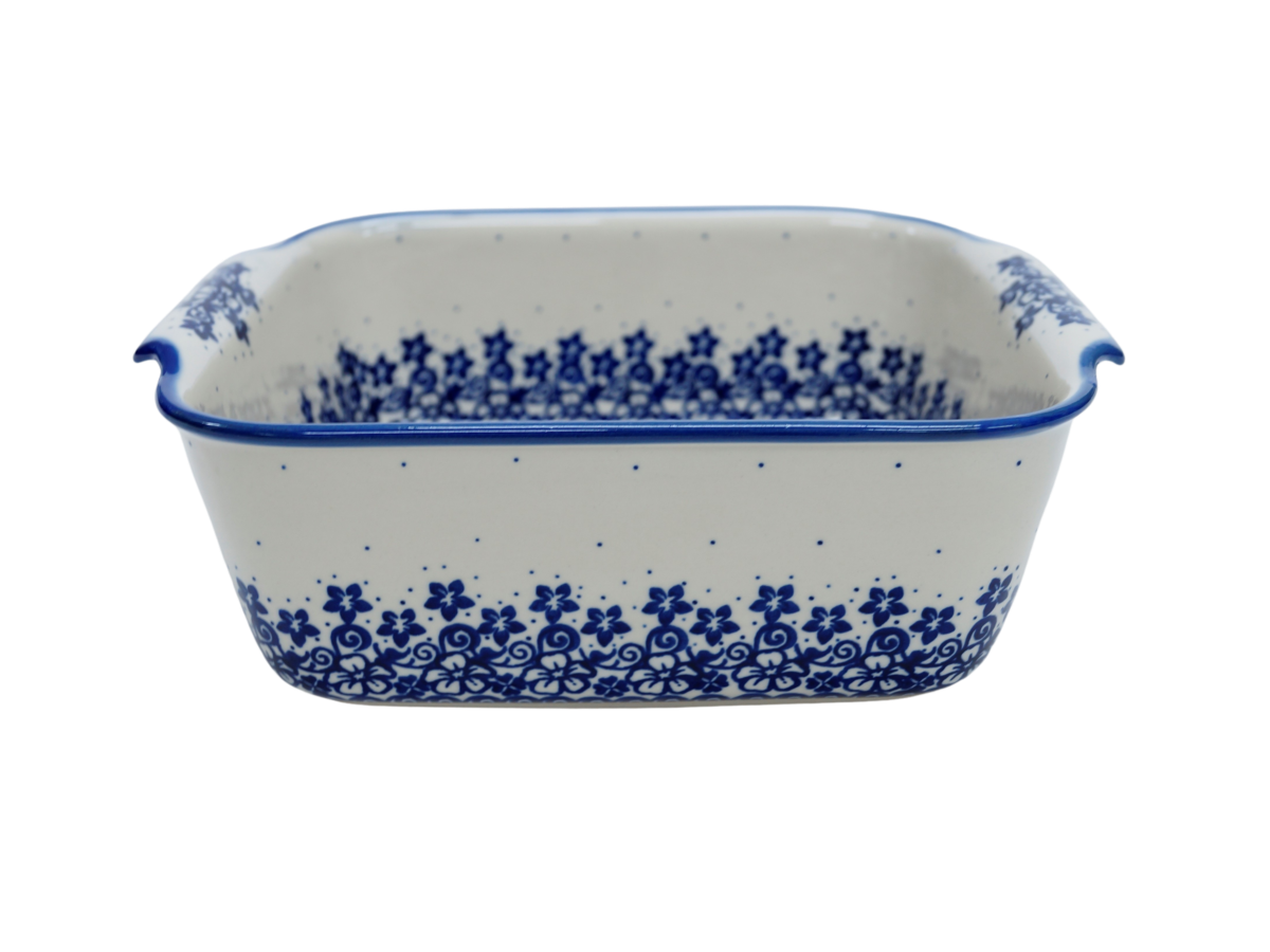 Naczynie kwadratowe duże wzbogaca kolekcję użytkowych naczyń ceramicznych o wszechstronnym zastosowaniu, oryginalna ceramika bolesławiecka, wyprodukowana metodą wytwarzania ceramiki charakterystyczną tylko dla produktów z regionu Bolesławca. Gładka powierzchnia z wytrzymałą powłoką szkliwa i wzmocnionymi krawędziami, odporna na zmywanie w zmywarkach, użytkowanie w mikrofalach i piekarnikach. Ręcznie malowane zdobienia ukryte są pod warstwą przejrzystego szkliwa, która dodaje blasku a przede wszystkim odporności na wysokie temperatury.