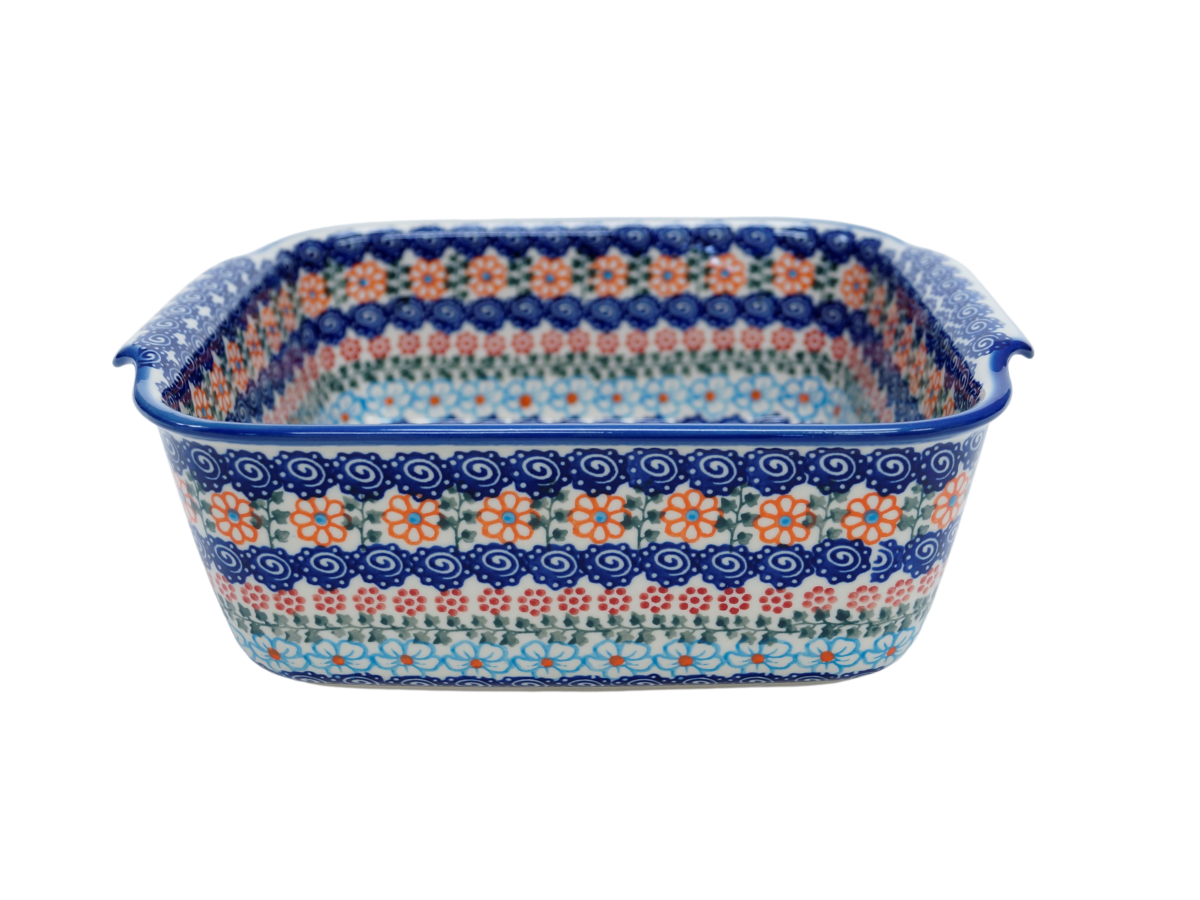 Naczynie kwadratowe duże wzbogaca kolekcję użytkowych naczyń ceramicznych o wszechstronnym zastosowaniu, oryginalna ceramika bolesławiecka, wyprodukowana metodą wytwarzania ceramiki charakterystyczną tylko dla produktów z regionu Bolesławca. Gładka powierzchnia z wytrzymałą powłoką szkliwa i wzmocnionymi krawędziami, odporna na zmywanie w zmywarkach, użytkowanie w mikrofalach i piekarnikach. Ręcznie malowane zdobienia ukryte są pod warstwą przejrzystego szkliwa, która dodaje blasku a przede wszystkim odporności na wysokie temperatury.