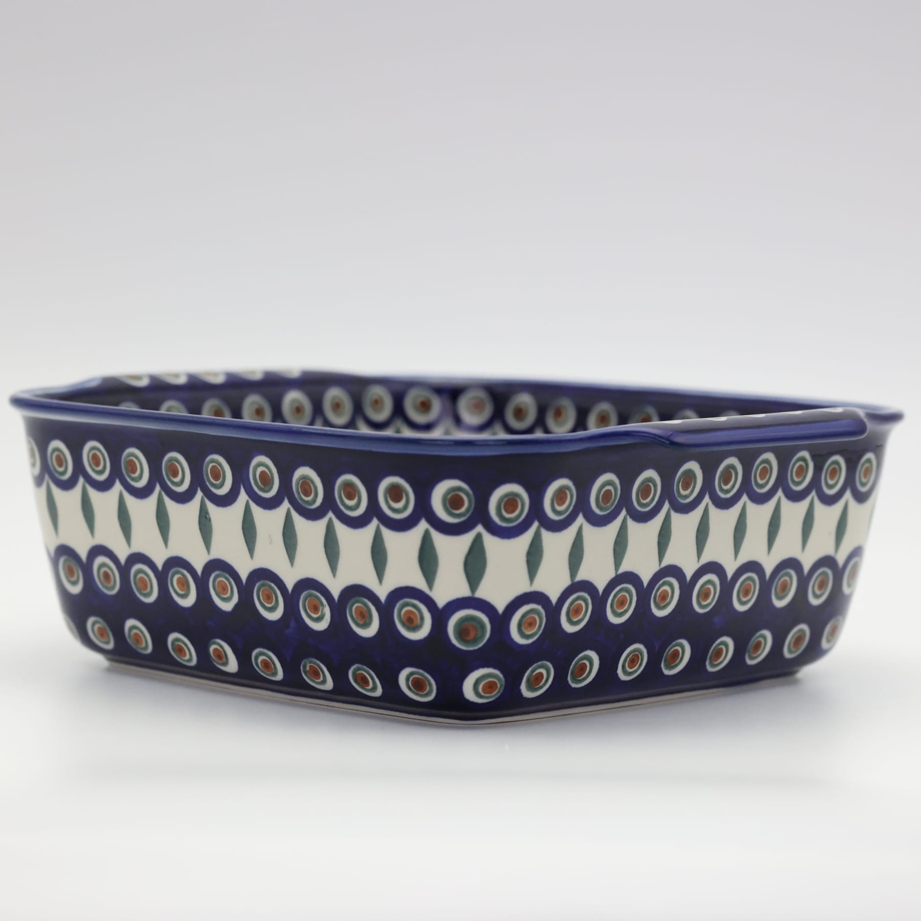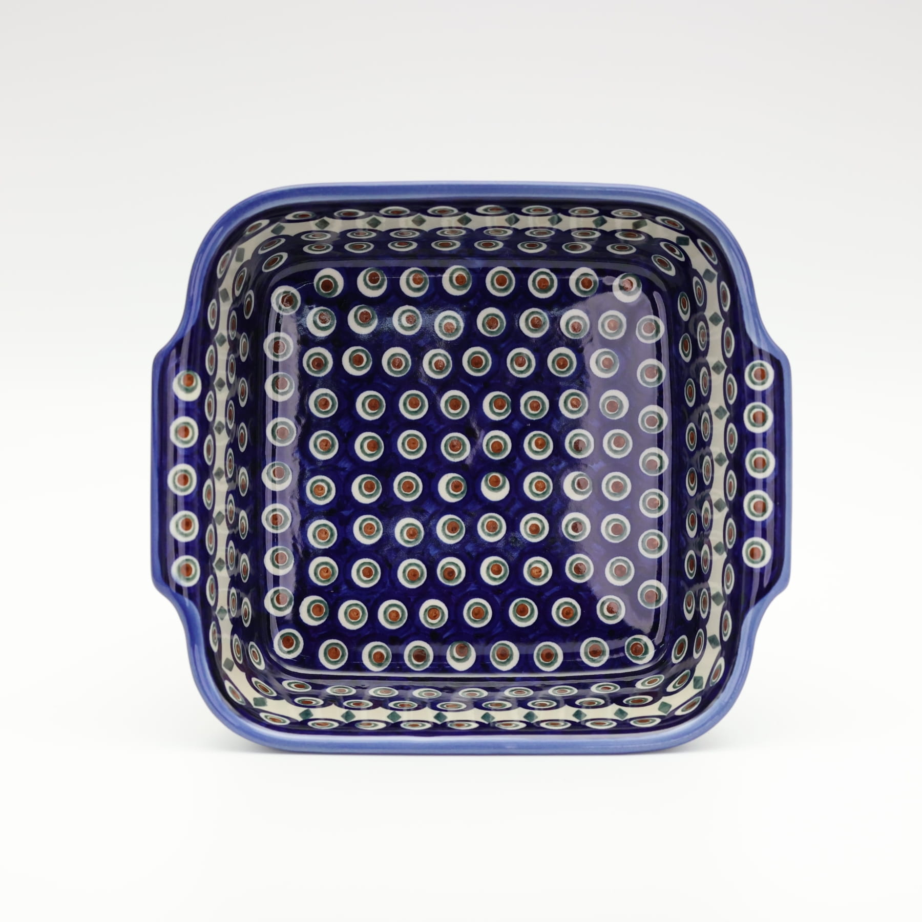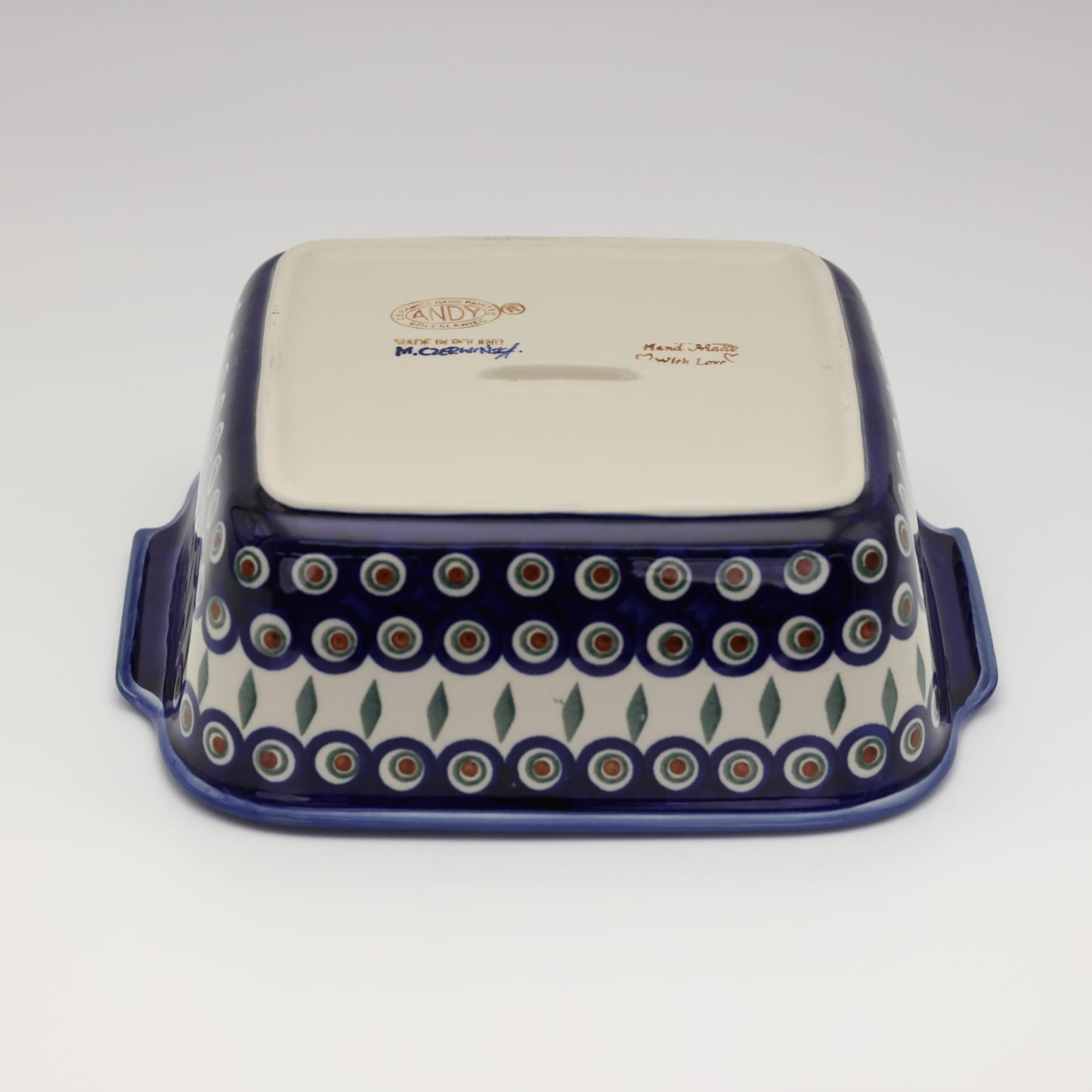 Naczynie kwadratowe duże wzbogaca kolekcję użytkowych naczyń ceramicznych o wszechstronnym zastosowaniu, oryginalna ceramika bolesławiecka, wyprodukowana metodą wytwarzania ceramiki charakterystyczną tylko dla produktów z regionu Bolesławca. Gładka powierzchnia z wytrzymałą powłoką szkliwa i wzmocnionymi krawędziami, odporna na zmywanie w zmywarkach, użytkowanie w mikrofalach i piekarnikach. Ręcznie malowane zdobienia ukryte są pod warstwą przejrzystego szkliwa, która dodaje blasku a przede wszystkim odporności na wysokie temperatury.