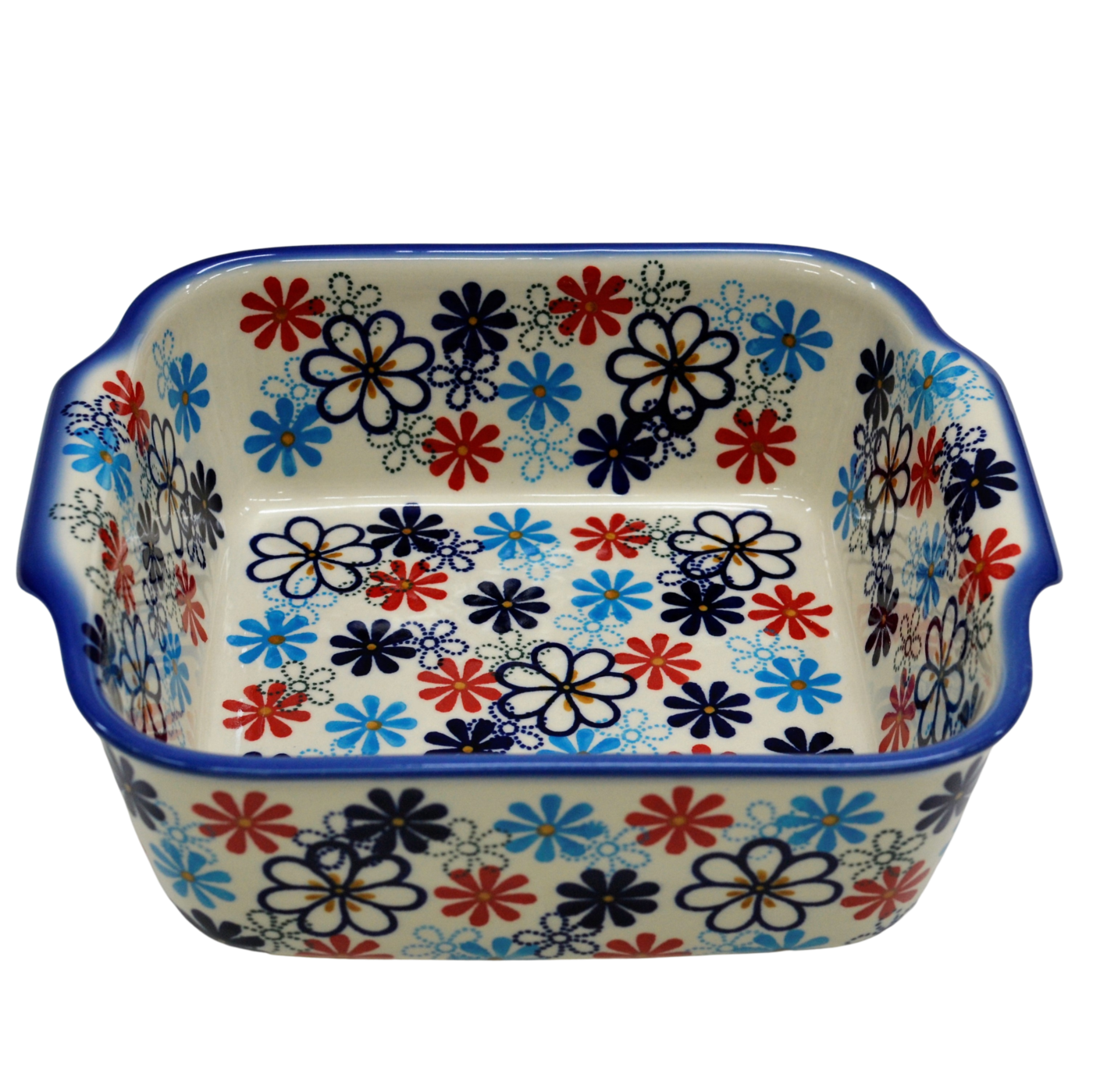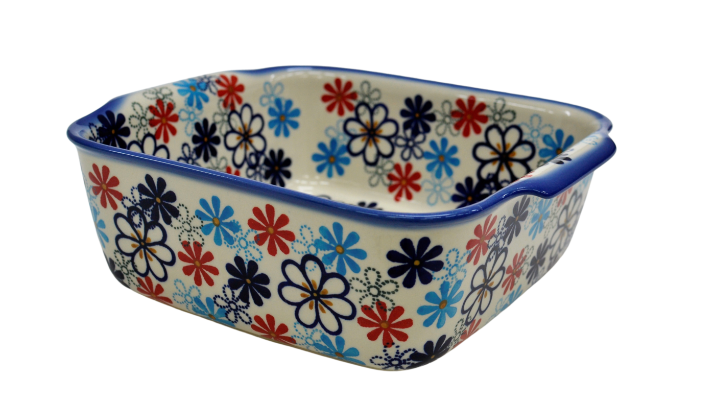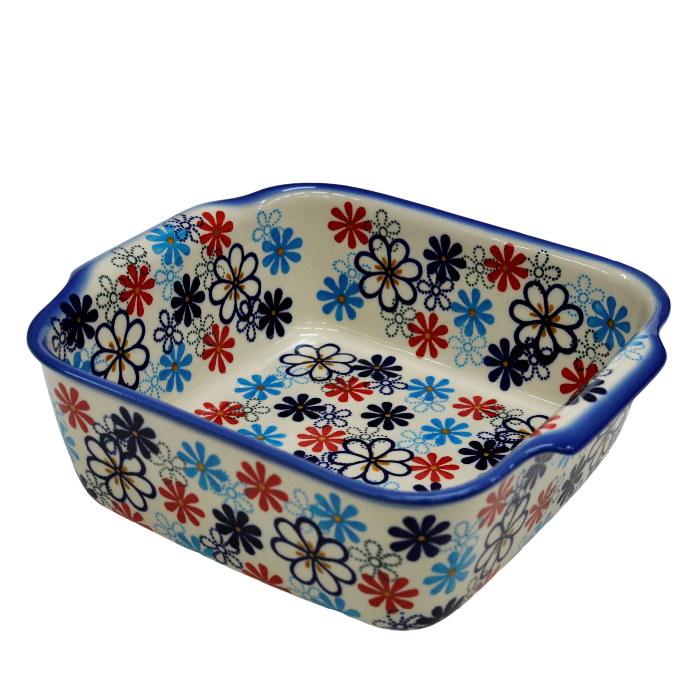Naczynie kwadratowe duże wzbogaca kolekcję użytkowych naczyń ceramicznych o wszechstronnym zastosowaniu, oryginalna ceramika bolesławiecka, wyprodukowana metodą wytwarzania ceramiki charakterystyczną tylko dla produktów z regionu Bolesławca. Gładka powierzchnia z wytrzymałą powłoką szkliwa i wzmocnionymi krawędziami, odporna na zmywanie w zmywarkach, użytkowanie w mikrofalach i piekarnikach. Ręcznie malowane zdobienia ukryte są pod warstwą przejrzystego szkliwa, która dodaje blasku a przede wszystkim odporności na wysokie temperatury.
