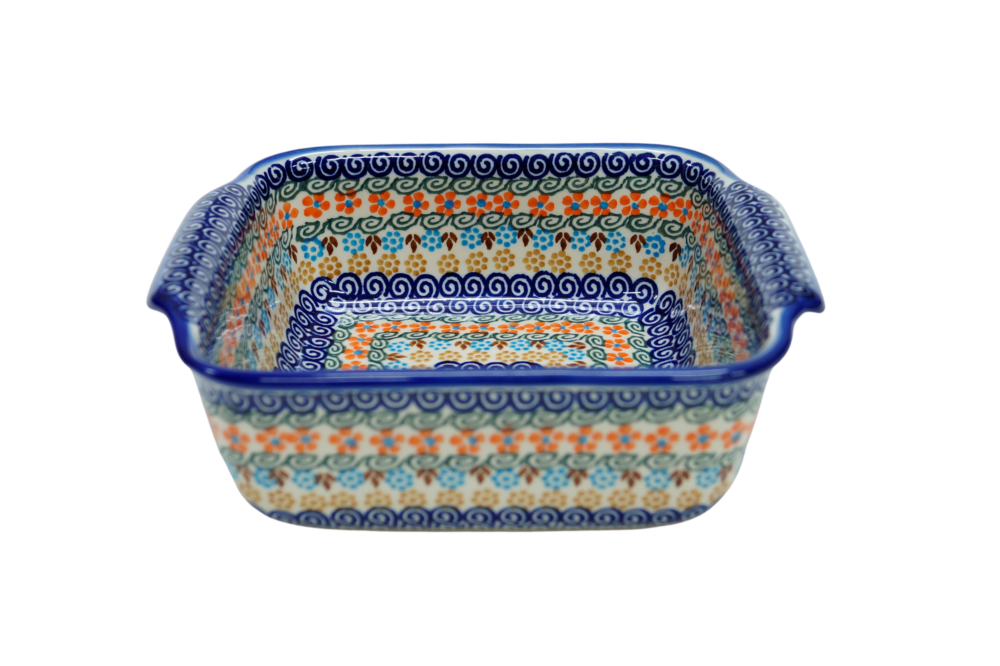 Naczynie kwadratowe duże wzbogaca kolekcję użytkowych naczyń ceramicznych o wszechstronnym zastosowaniu, oryginalna ceramika bolesławiecka, wyprodukowana metodą wytwarzania ceramiki charakterystyczną tylko dla produktów z regionu Bolesławca. Gładka powierzchnia z wytrzymałą powłoką szkliwa i wzmocnionymi krawędziami, odporna na zmywanie w zmywarkach, użytkowanie w mikrofalach i piekarnikach. Ręcznie malowane zdobienia ukryte są pod warstwą przejrzystego szkliwa, która dodaje blasku a przede wszystkim odporności na wysokie temperatury.