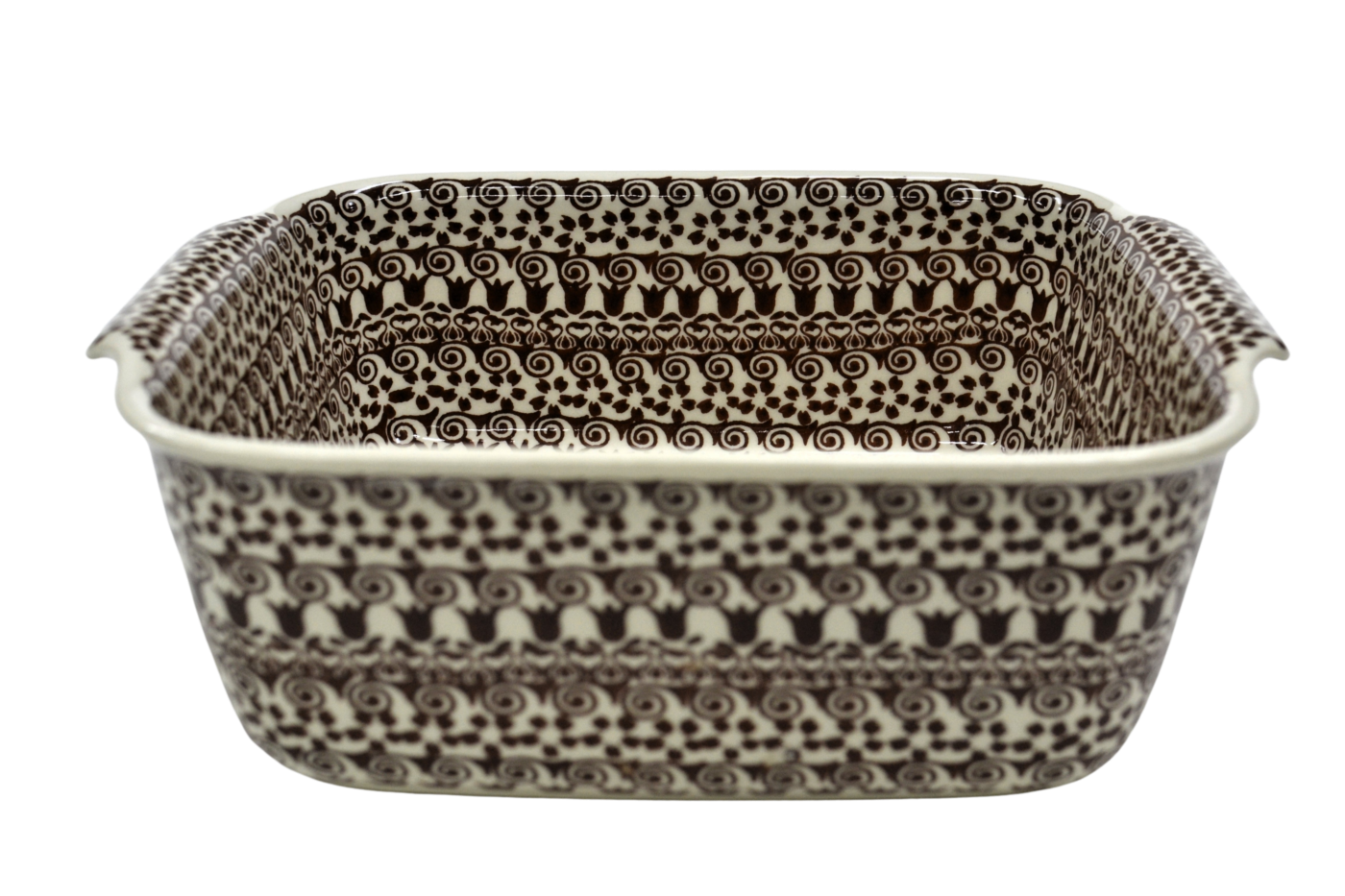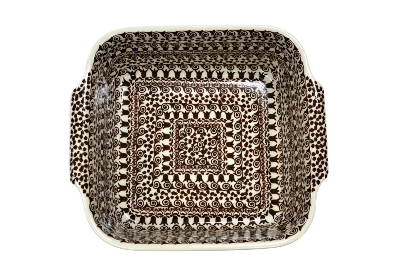 Naczynie kwadratowe duże wzbogaca kolekcję użytkowych naczyń ceramicznych o wszechstronnym zastosowaniu, oryginalna ceramika bolesławiecka, wyprodukowana metodą wytwarzania ceramiki charakterystyczną tylko dla produktów z regionu Bolesławca. Gładka powierzchnia z wytrzymałą powłoką szkliwa i wzmocnionymi krawędziami, odporna na zmywanie w zmywarkach, użytkowanie w mikrofalach i piekarnikach. Ręcznie malowane zdobienia ukryte są pod warstwą przejrzystego szkliwa, która dodaje blasku a przede wszystkim odporności na wysokie temperatury.