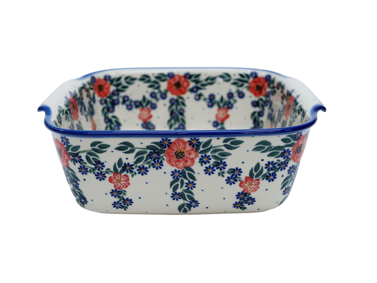 Naczynie kwadratowe duże wzbogaca kolekcję użytkowych naczyń ceramicznych o wszechstronnym zastosowaniu, oryginalna ceramika bolesławiecka, wyprodukowana metodą wytwarzania ceramiki charakterystyczną tylko dla produktów z regionu Bolesławca. Gładka powierzchnia z wytrzymałą powłoką szkliwa i wzmocnionymi krawędziami, odporna na zmywanie w zmywarkach, użytkowanie w mikrofalach i piekarnikach. Ręcznie malowane zdobienia ukryte są pod warstwą przejrzystego szkliwa, która dodaje blasku a przede wszystkim odporności na wysokie temperatury.