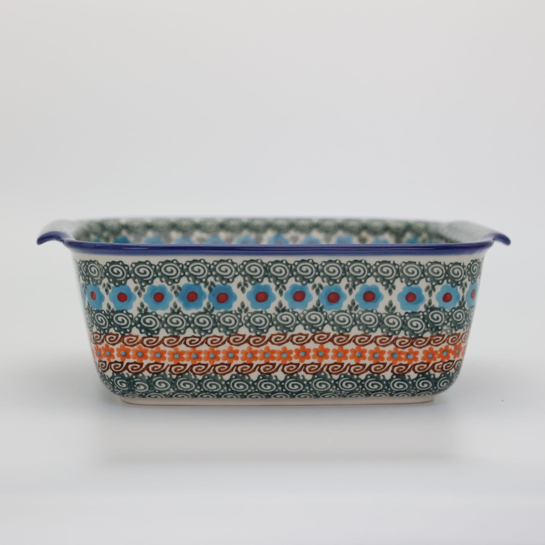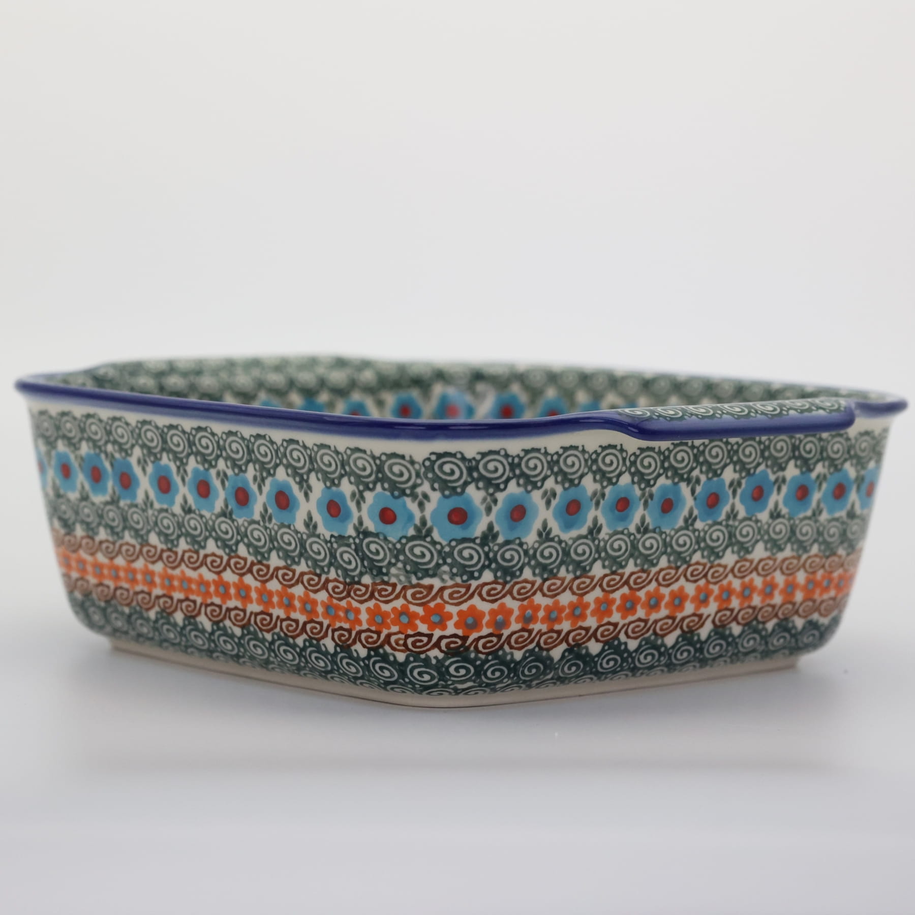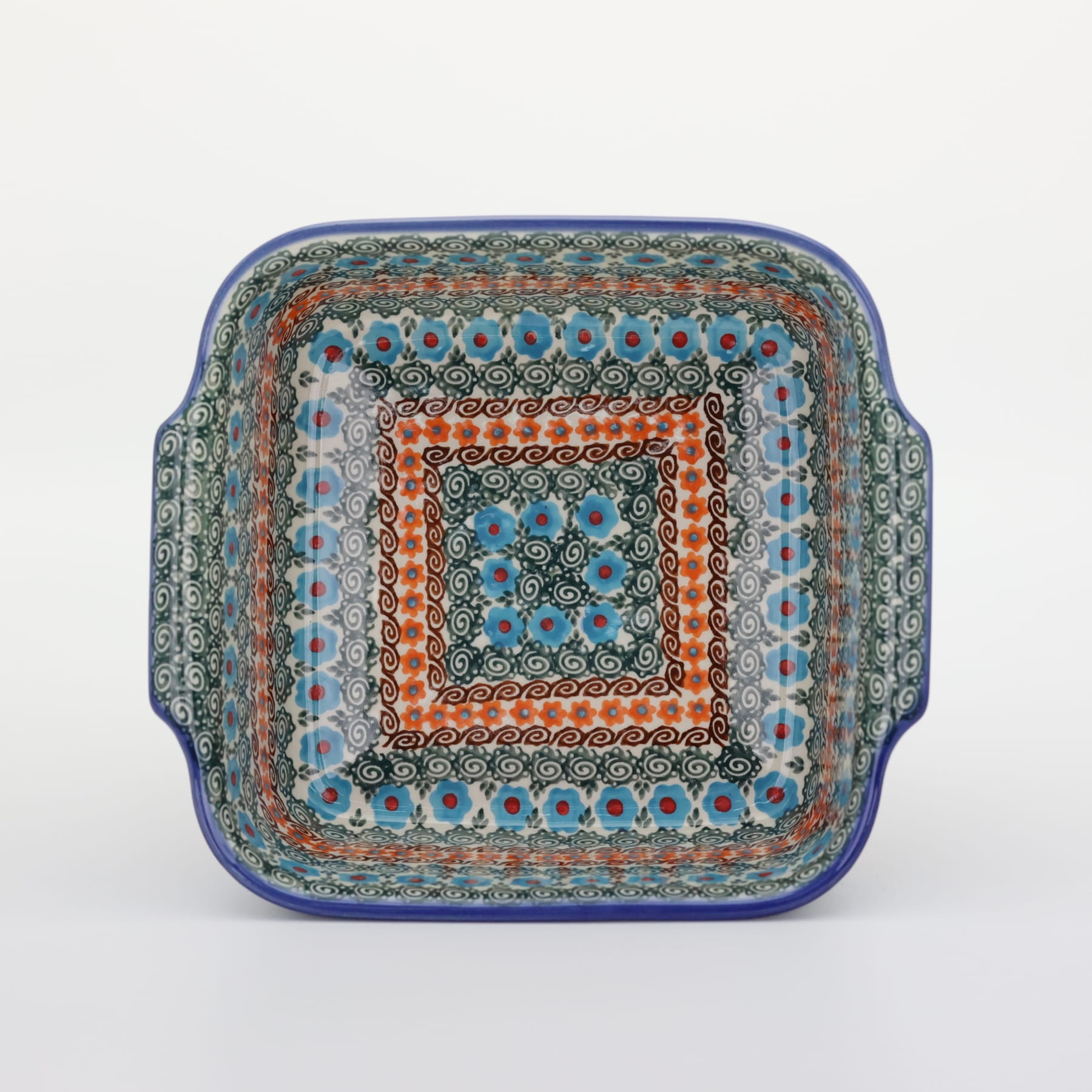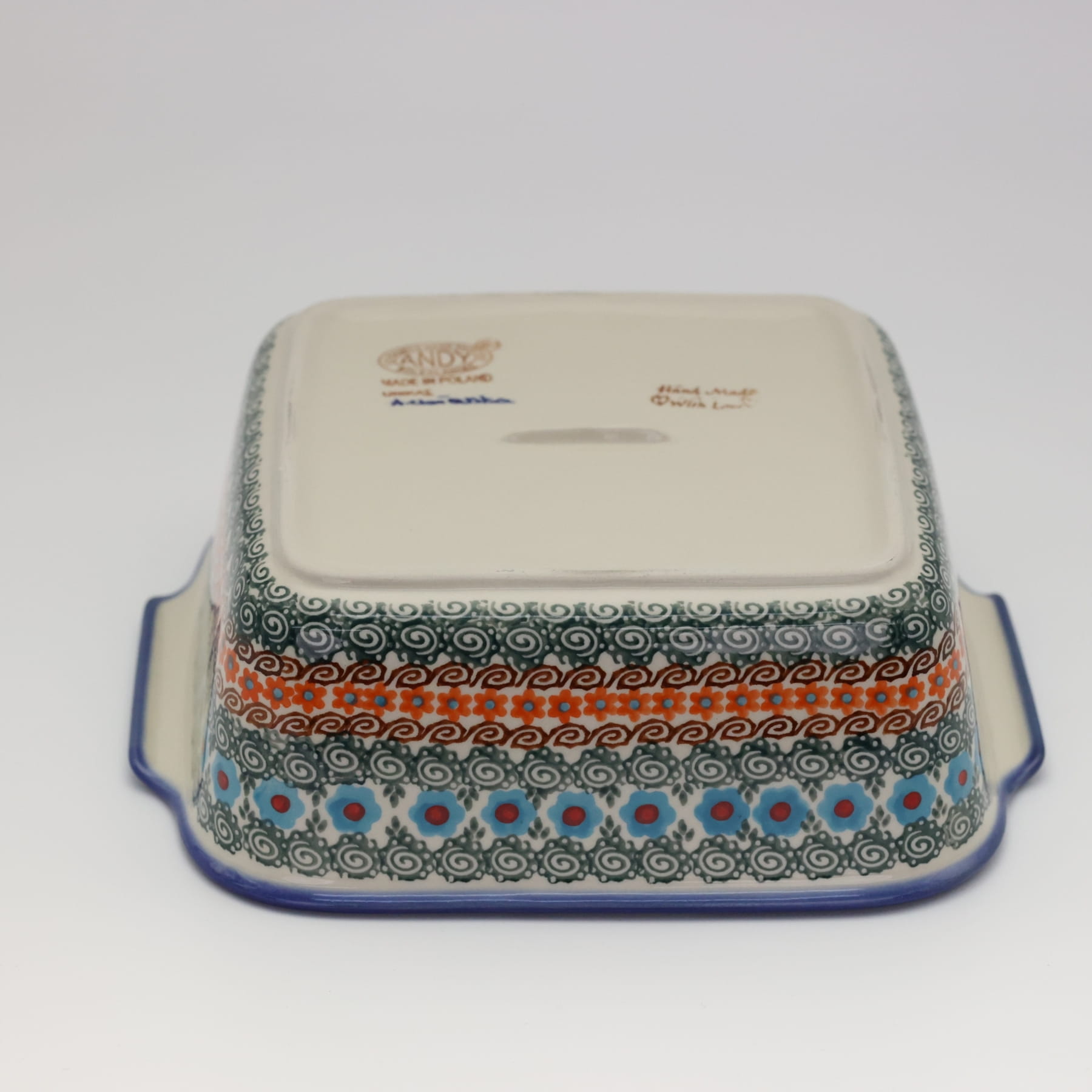 Naczynie kwadratowe duże wzbogaca kolekcję użytkowych naczyń ceramicznych o wszechstronnym zastosowaniu, oryginalna ceramika bolesławiecka, wyprodukowana metodą wytwarzania ceramiki charakterystyczną tylko dla produktów z regionu Bolesławca. Gładka powierzchnia z wytrzymałą powłoką szkliwa i wzmocnionymi krawędziami, odporna na zmywanie w zmywarkach, użytkowanie w mikrofalach i piekarnikach. Ręcznie malowane zdobienia ukryte są pod warstwą przejrzystego szkliwa, która dodaje blasku a przede wszystkim odporności na wysokie temperatury.