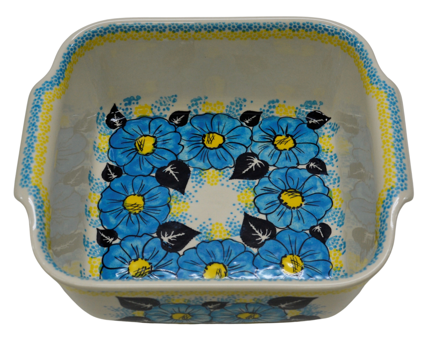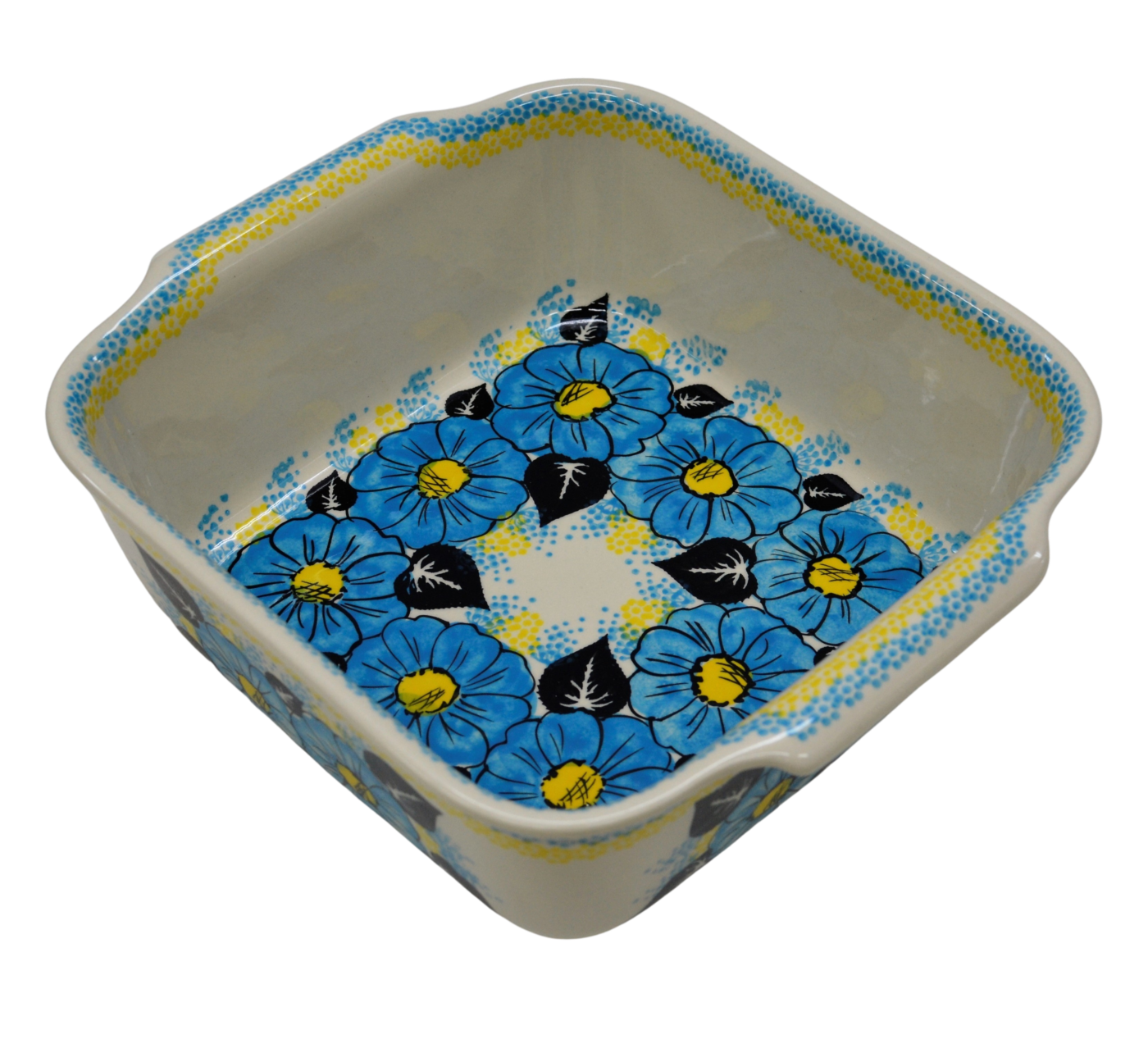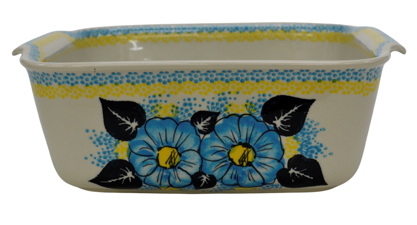 Naczynie kwadratowe duże wzbogaca kolekcję użytkowych naczyń ceramicznych o wszechstronnym zastosowaniu, oryginalna ceramika bolesławiecka, wyprodukowana metodą wytwarzania ceramiki charakterystyczną tylko dla produktów z regionu Bolesławca. Gładka powierzchnia z wytrzymałą powłoką szkliwa i wzmocnionymi krawędziami, odporna na zmywanie w zmywarkach, użytkowanie w mikrofalach i piekarnikach. Ręcznie malowane zdobienia ukryte są pod warstwą przejrzystego szkliwa, która dodaje blasku a przede wszystkim odporności na wysokie temperatury.