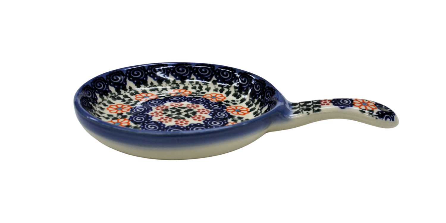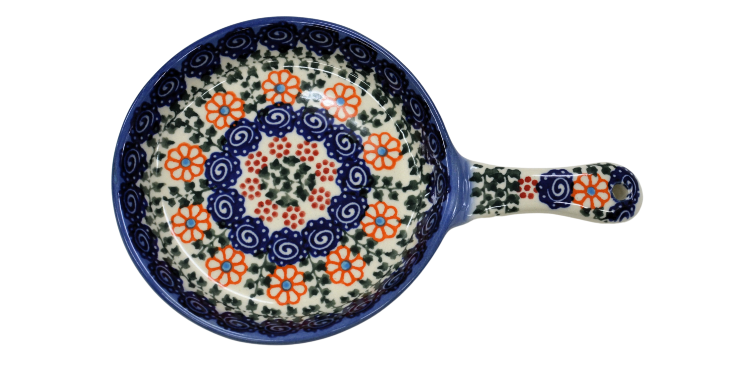 Ceramiczna patelnia mała, wymalowana w tradycyjne bolesławieckie wzory. Naczynie służące do podawania jajecznicy, jajek sadzonych, sałatek, surówek czy świeżo upieczonych kiełbasek lub tostów z serem i szynką. Patelnia może wisieć na ścianie jako dekoracja, polskie rękodzieło.