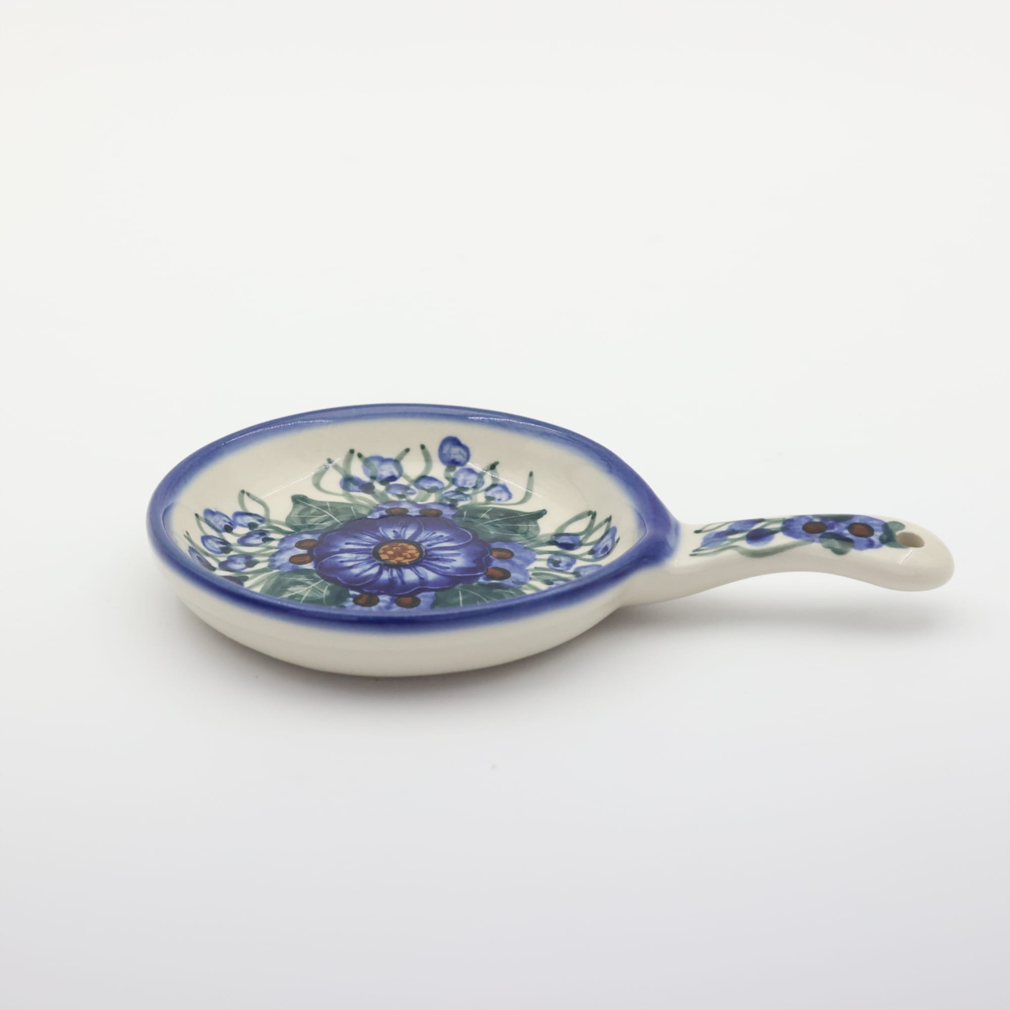 Ceramiczna patelnia mała, wymalowana w tradycyjne bolesławieckie wzory. Naczynie służące do podawania jajecznicy, jajek sadzonych, sałatek, surówek czy świeżo upieczonych kiełbasek lub tostów z serem i szynką. Patelnia może wisieć na ścianie jako dekoracja, polskie rękodzieło.