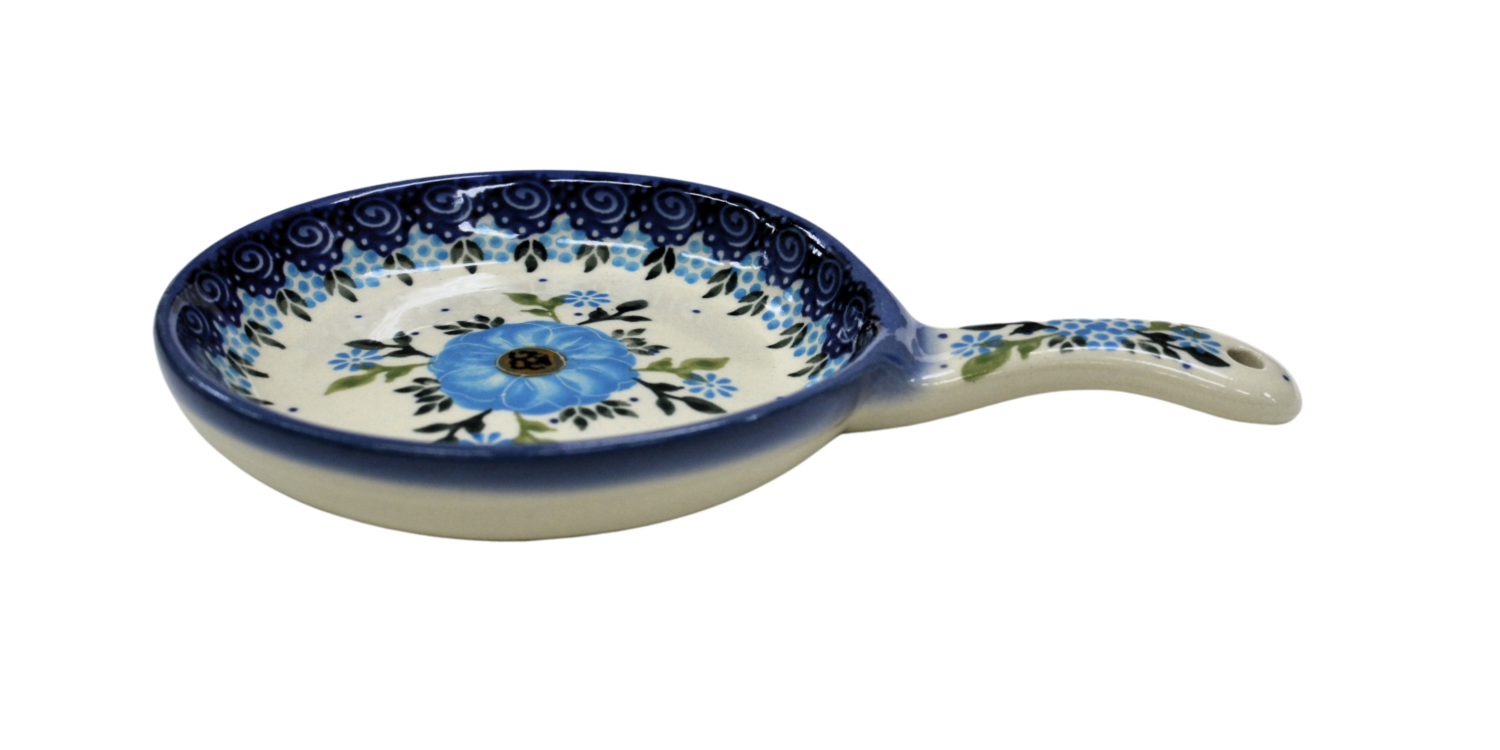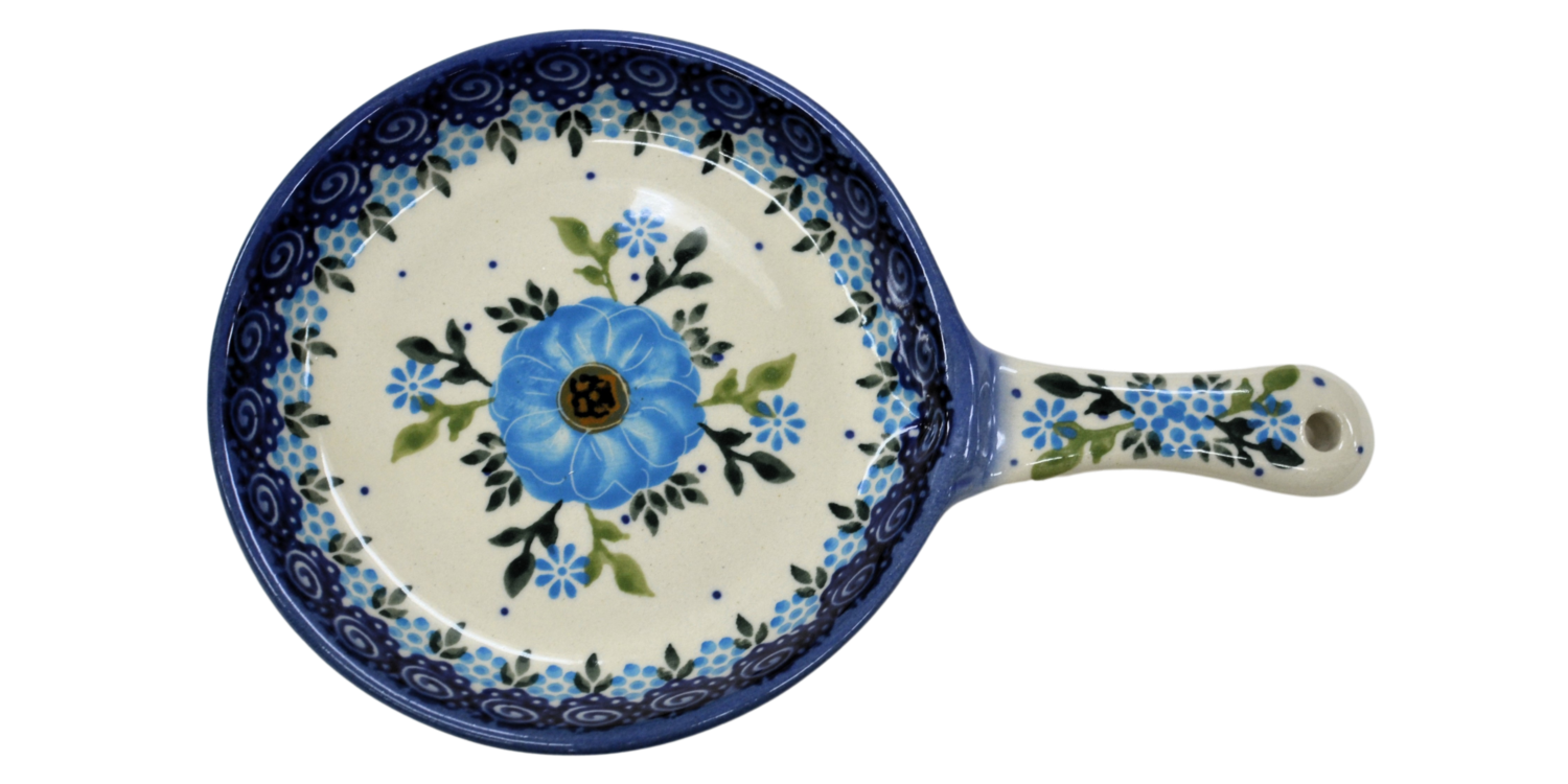 Ceramiczna patelnia mała, wymalowana w tradycyjne bolesławieckie wzory. Naczynie służące do podawania jajecznicy, jajek sadzonych, sałatek, surówek czy świeżo upieczonych kiełbasek lub tostów z serem i szynką. Patelnia może wisieć na ścianie jako dekoracja, polskie rękodzieło.