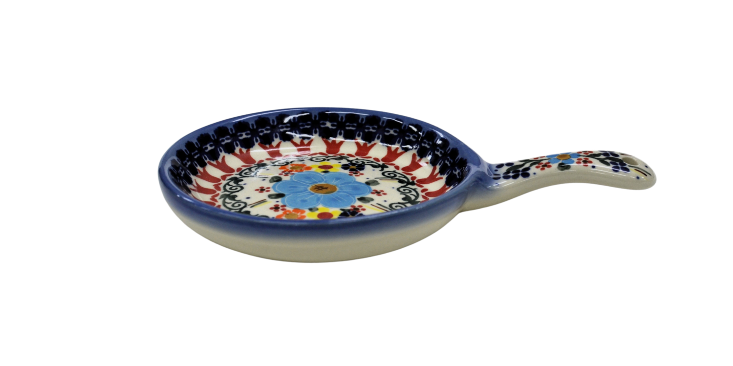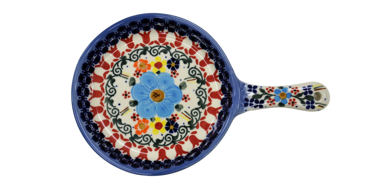 Ceramiczna patelnia mała, wymalowana w tradycyjne bolesławieckie wzory. Naczynie służące do podawania jajecznicy, jajek sadzonych, sałatek, surówek czy świeżo upieczonych kiełbasek lub tostów z serem i szynką. Patelnia może wisieć na ścianie jako dekoracja, polskie rękodzieło.