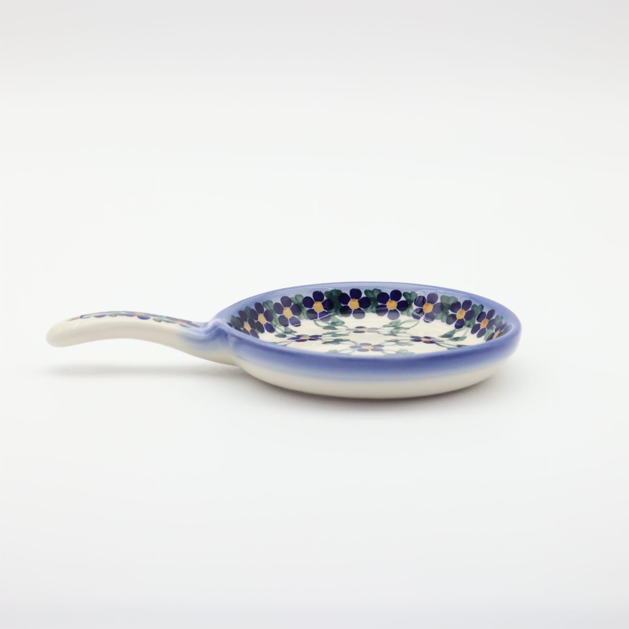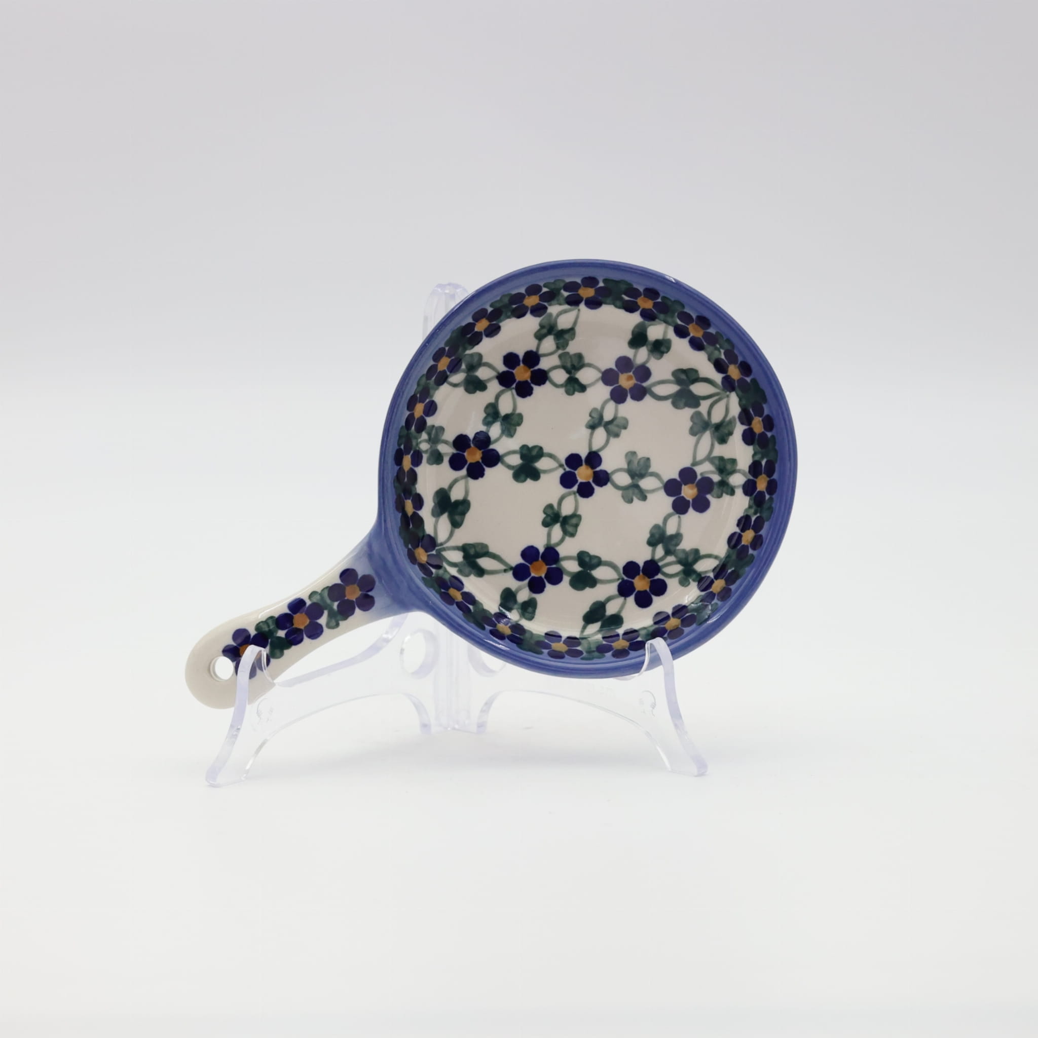 Ceramiczna patelnia mała, wymalowana w tradycyjne bolesławieckie wzory. Naczynie służące do podawania jajecznicy, jajek sadzonych, sałatek, surówek czy świeżo upieczonych kiełbasek lub tostów z serem i szynką. Patelnia może wisieć na ścianie jako dekoracja, polskie rękodzieło.