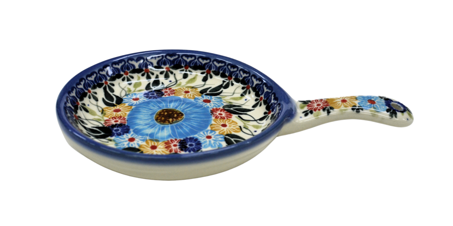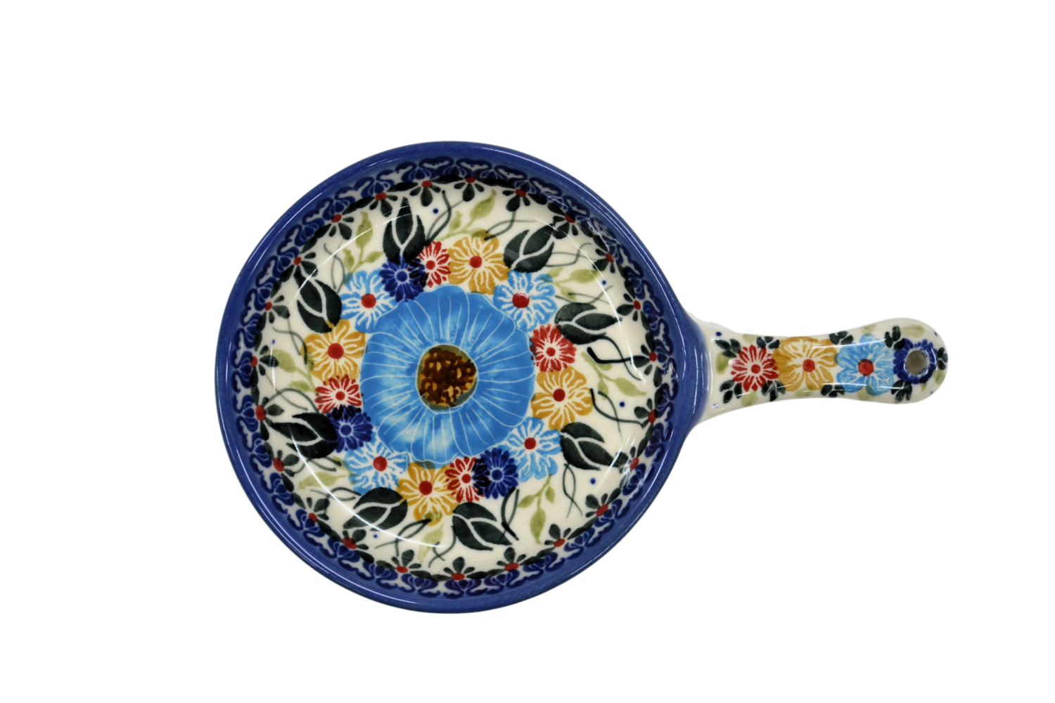 Ceramiczna patelnia mała, wymalowana w tradycyjne bolesławieckie wzory. Naczynie służące do podawania jajecznicy, jajek sadzonych, sałatek, surówek czy świeżo upieczonych kiełbasek lub tostów z serem i szynką. Patelnia może wisieć na ścianie jako dekoracja, polskie rękodzieło.