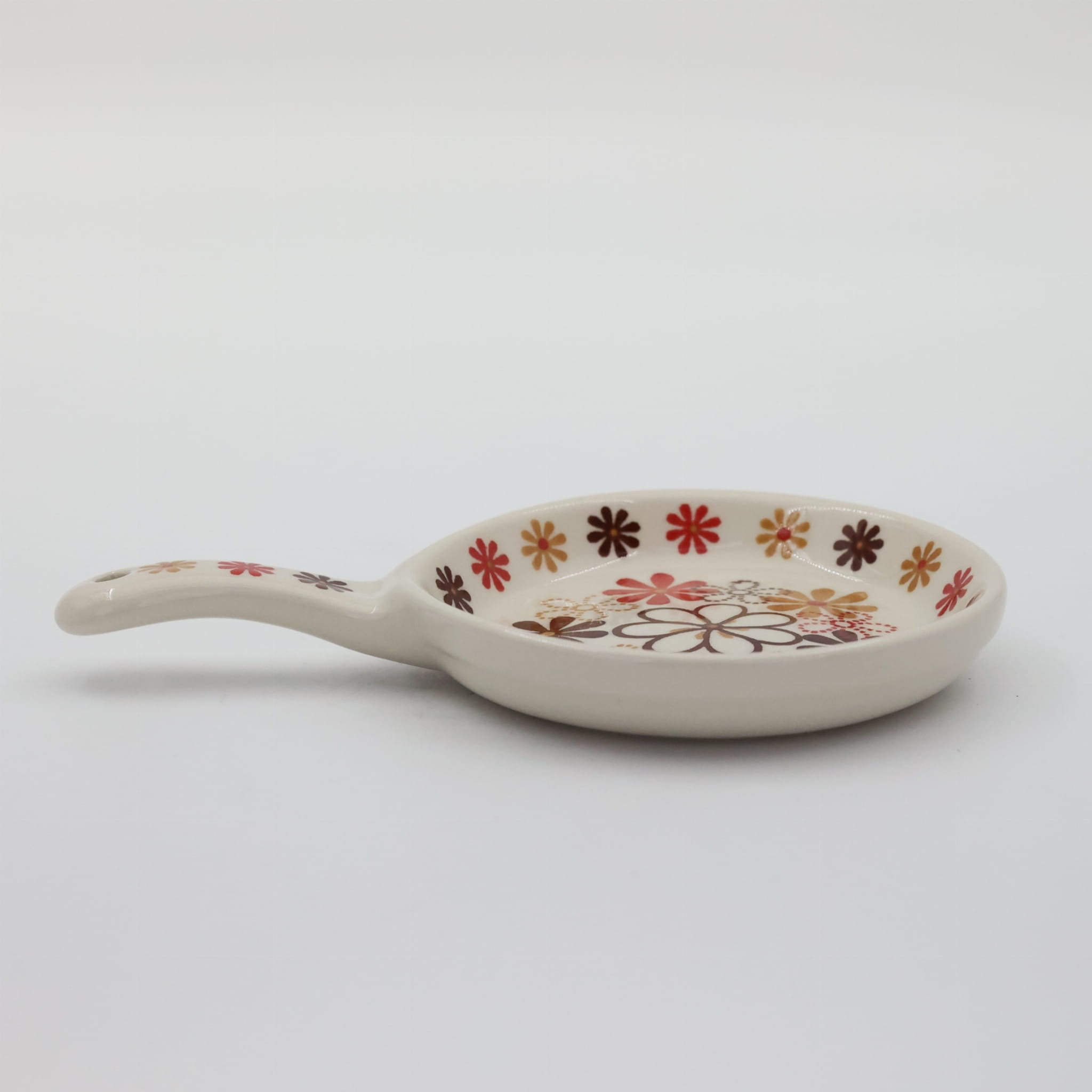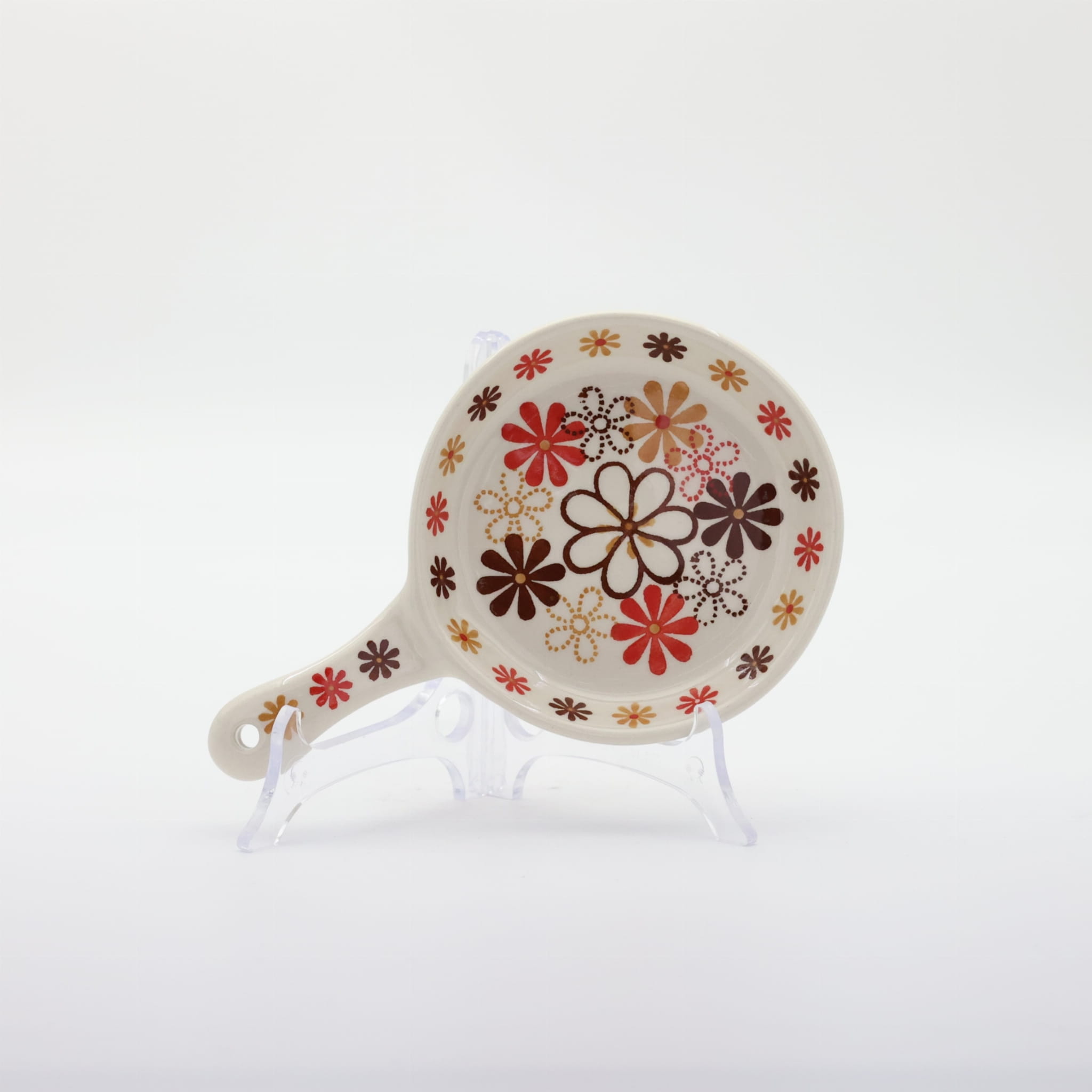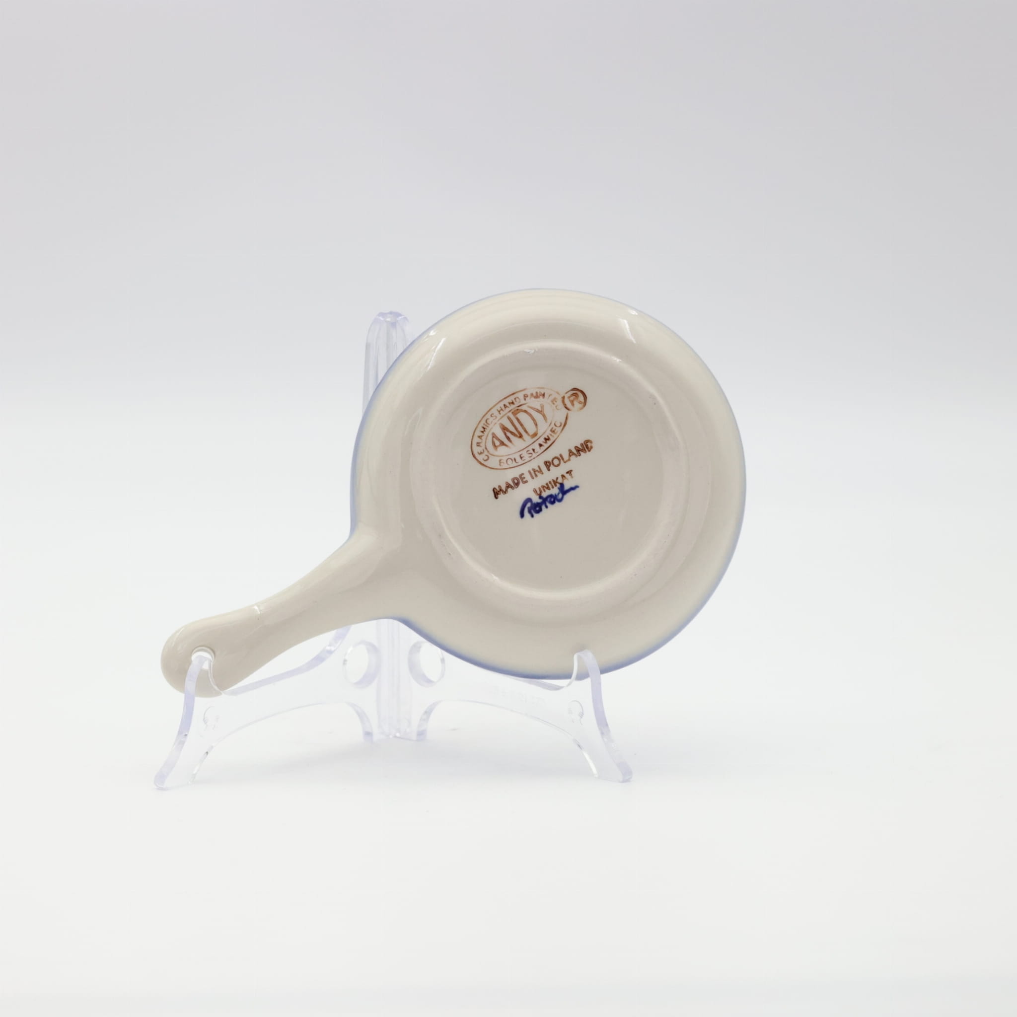 Ceramiczna patelnia mała, wymalowana w tradycyjne bolesławieckie wzory. Naczynie służące do podawania jajecznicy, jajek sadzonych, sałatek, surówek czy świeżo upieczonych kiełbasek lub tostów z serem i szynką. Patelnia może wisieć na ścianie jako dekoracja, polskie rękodzieło.