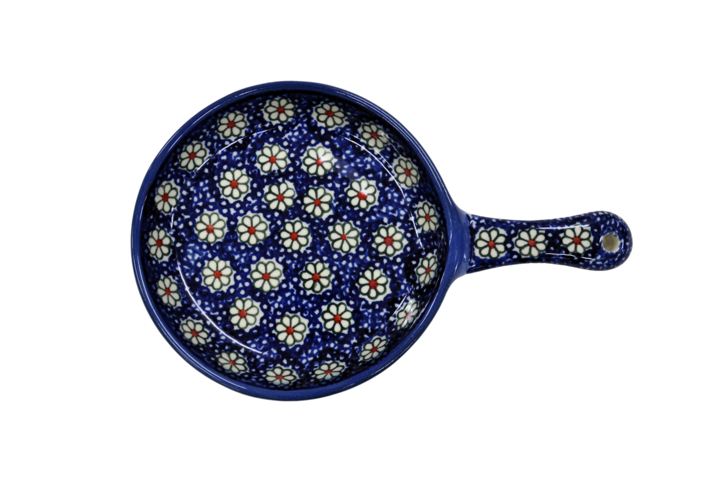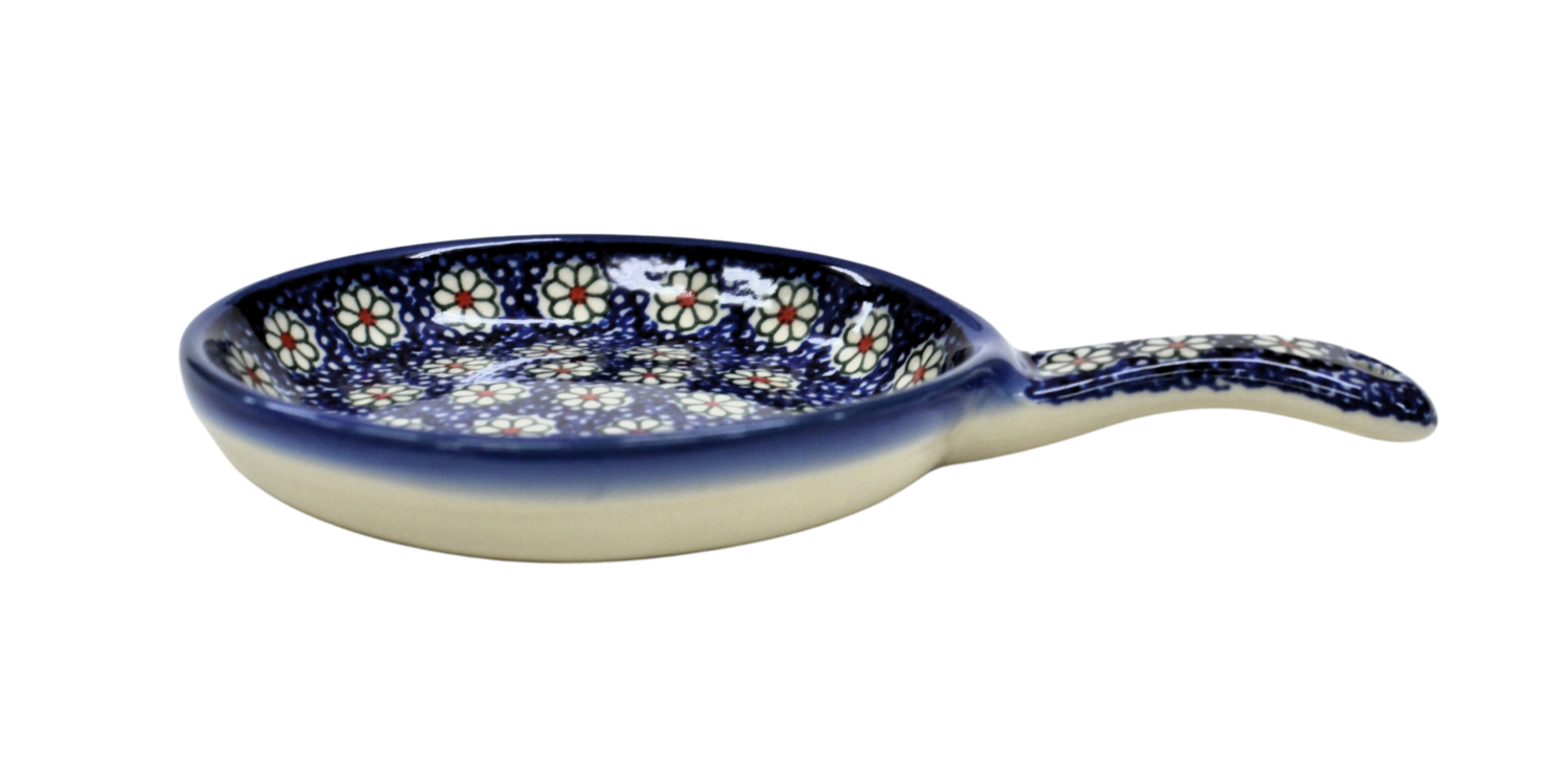 Ceramiczna patelnia mała, wymalowana w tradycyjne bolesławieckie wzory. Naczynie służące do podawania jajecznicy, jajek sadzonych, sałatek, surówek czy świeżo upieczonych kiełbasek lub tostów z serem i szynką. Patelnia może wisieć na ścianie jako dekoracja, polskie rękodzieło.