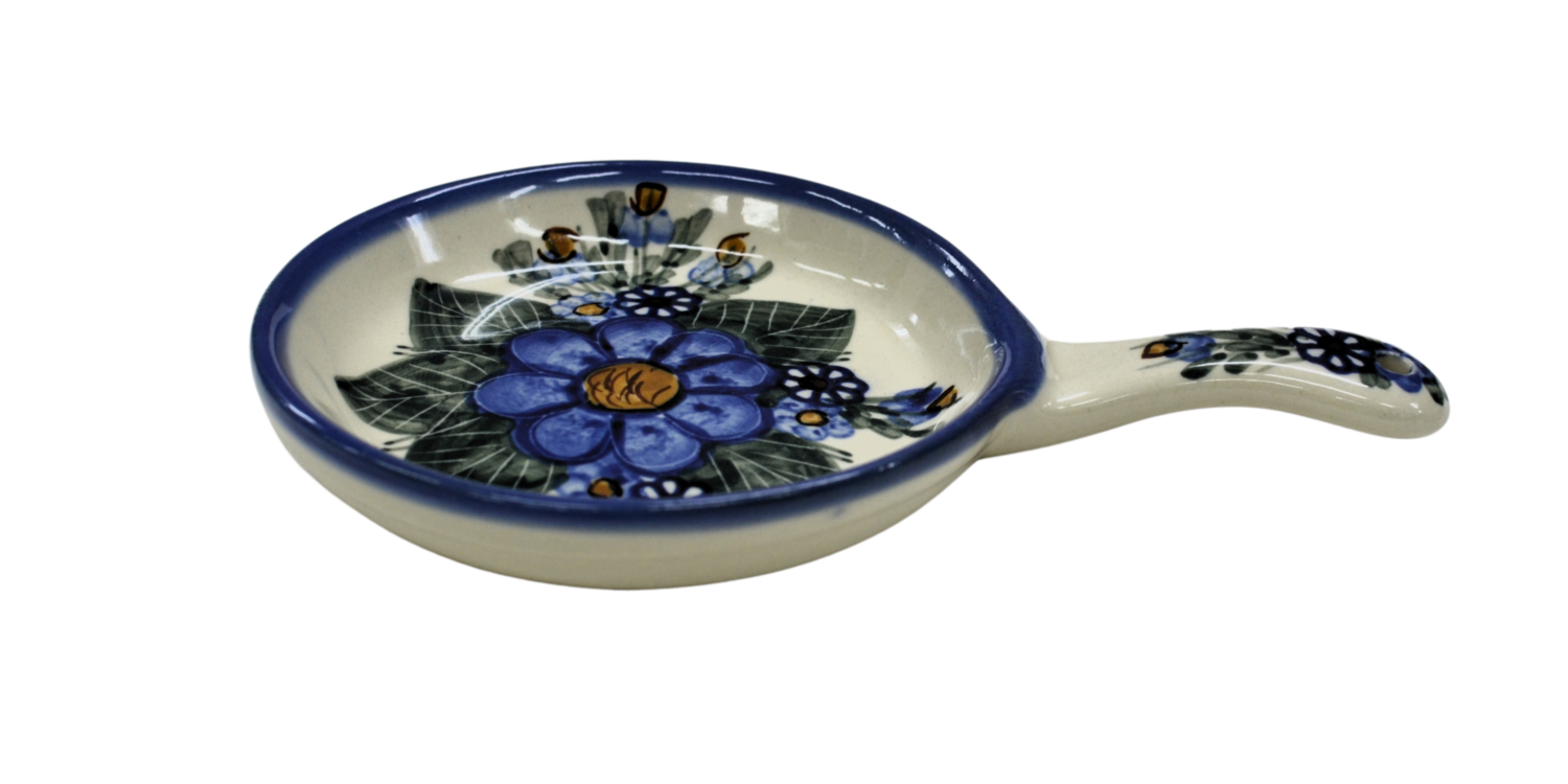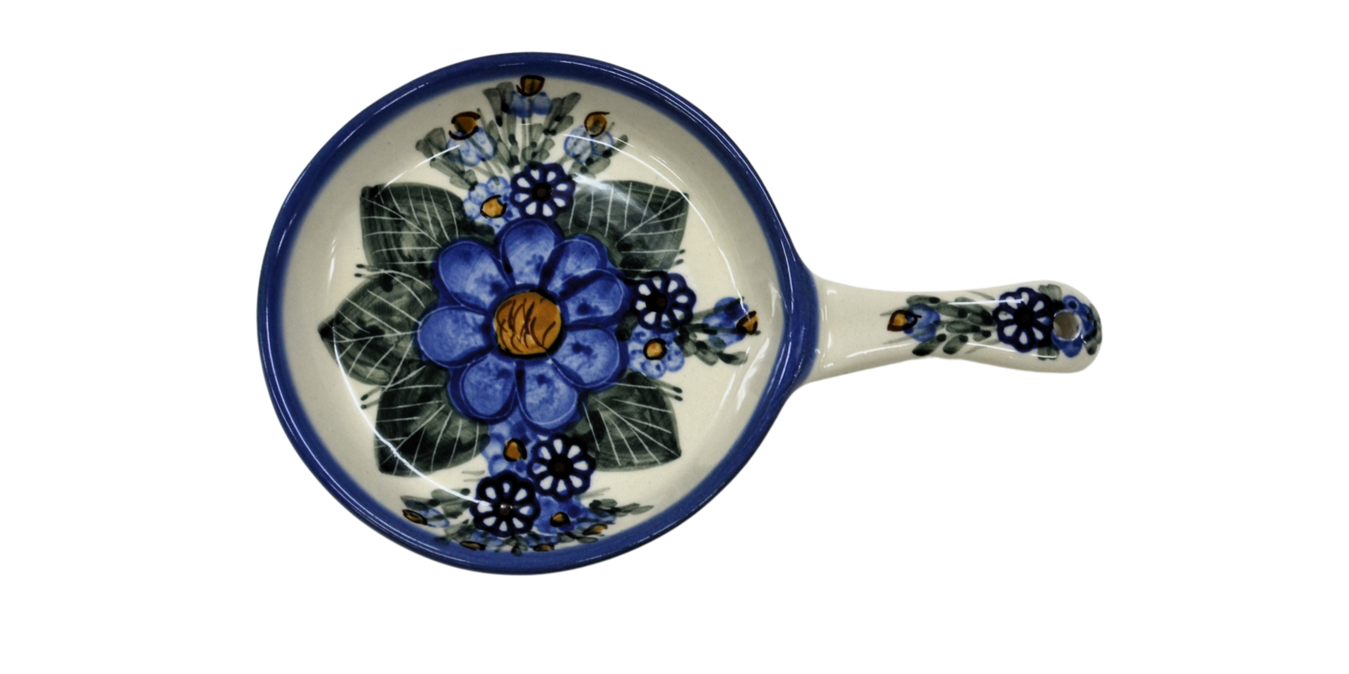 Ceramiczna patelnia mała, wymalowana w tradycyjne bolesławieckie wzory. Naczynie służące do podawania jajecznicy, jajek sadzonych, sałatek, surówek czy świeżo upieczonych kiełbasek lub tostów z serem i szynką. Patelnia może wisieć na ścianie jako dekoracja, polskie rękodzieło.