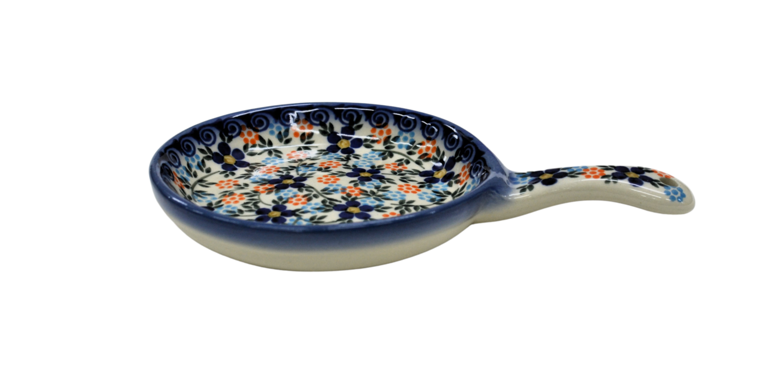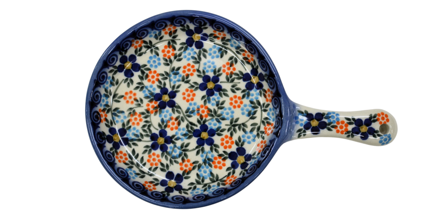 Ceramiczna patelnia mała, wymalowana w tradycyjne bolesławieckie wzory. Naczynie służące do podawania jajecznicy, jajek sadzonych, sałatek, surówek czy świeżo upieczonych kiełbasek lub tostów z serem i szynką. Patelnia może wisieć na ścianie jako dekoracja, polskie rękodzieło.
