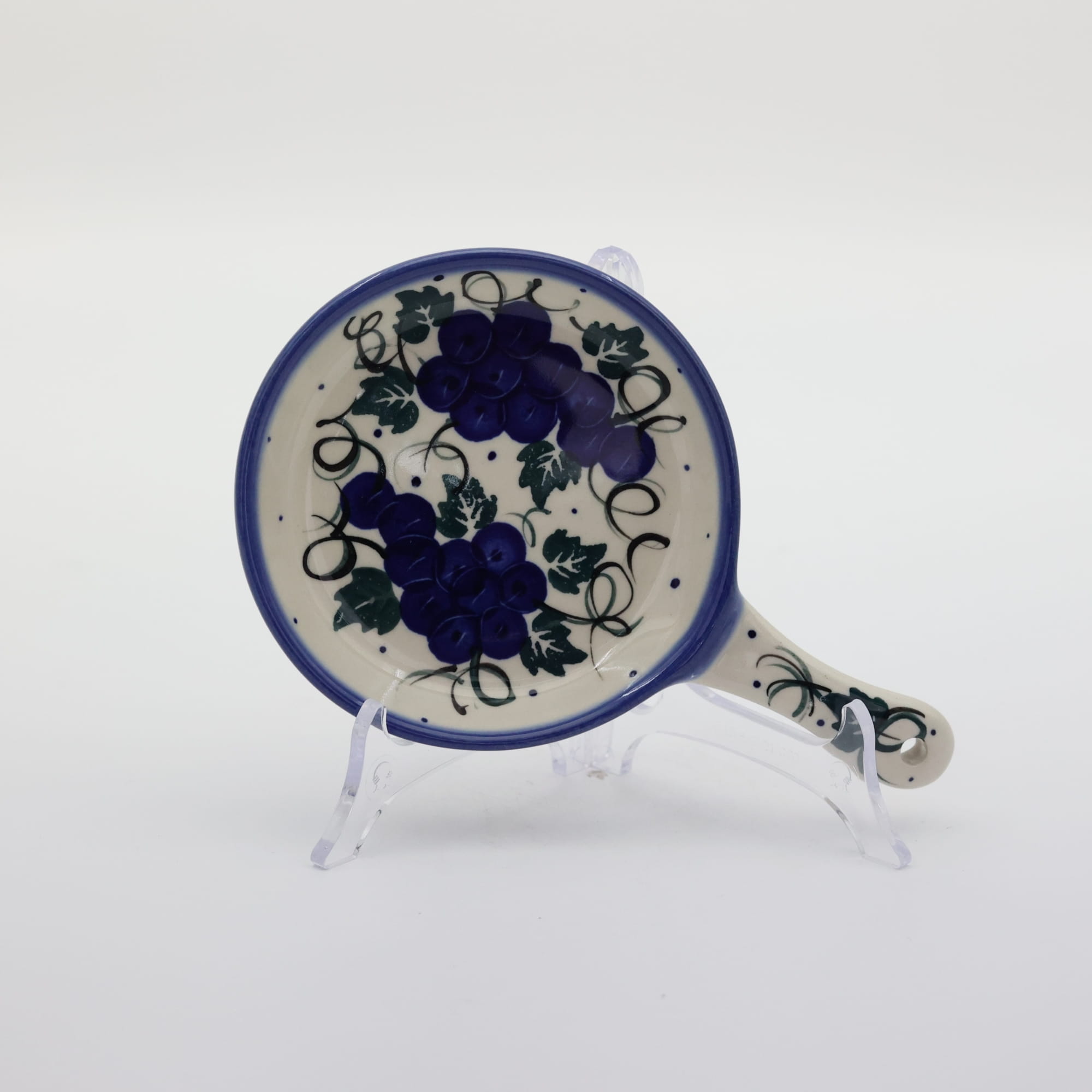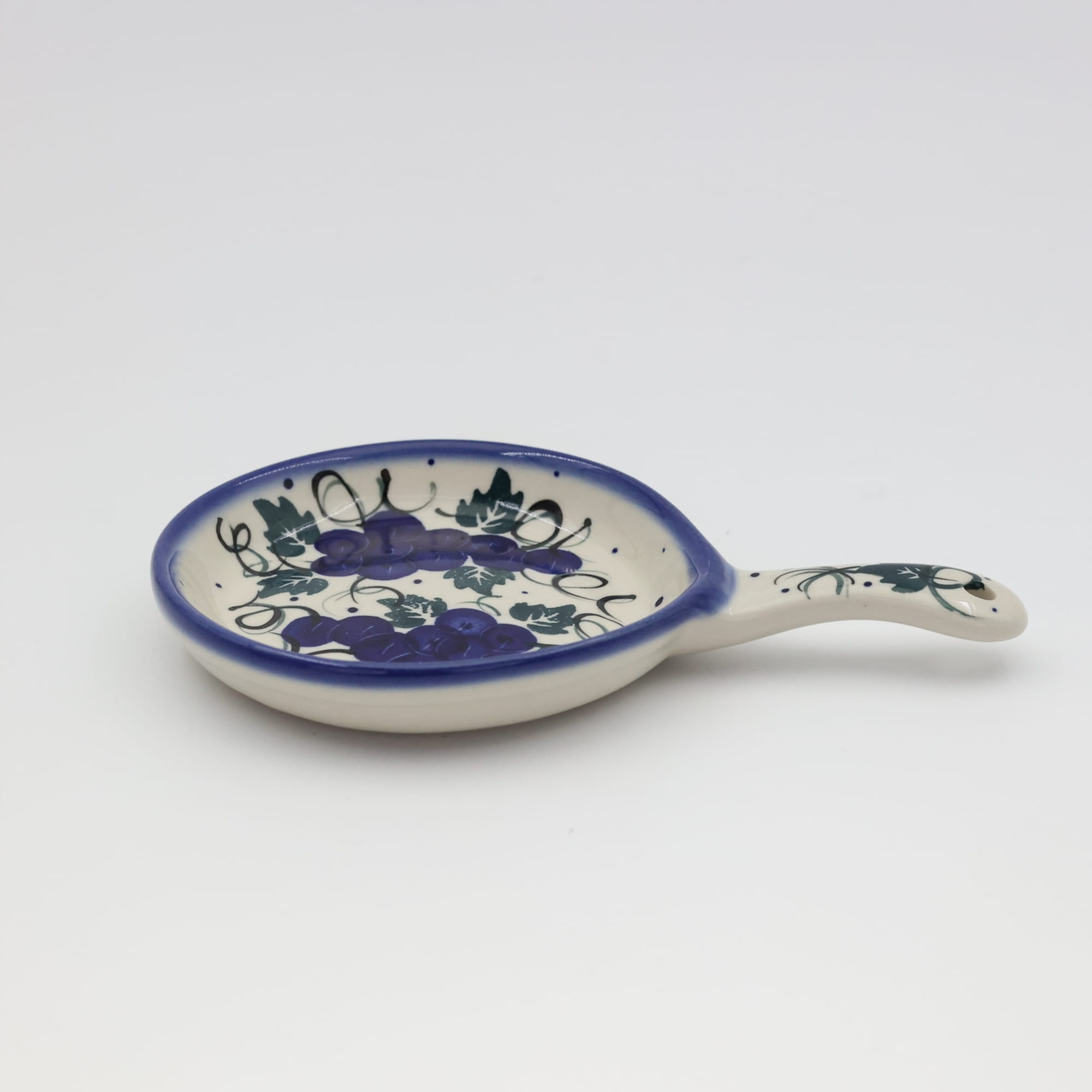 Ceramiczna patelnia mała, wymalowana w tradycyjne bolesławieckie wzory. Naczynie służące do podawania jajecznicy, jajek sadzonych, sałatek, surówek czy świeżo upieczonych kiełbasek lub tostów z serem i szynką. Patelnia może wisieć na ścianie jako dekoracja, polskie rękodzieło.