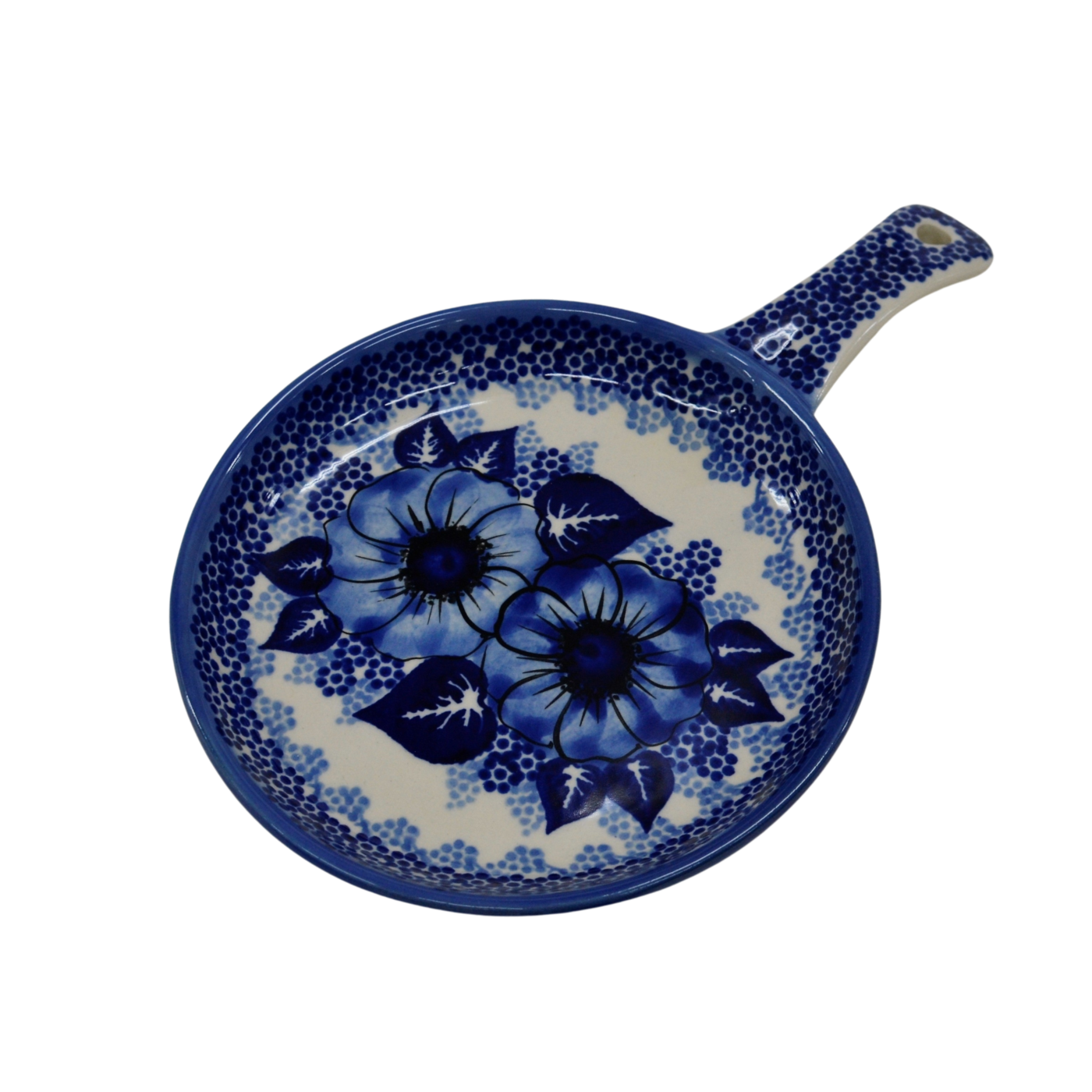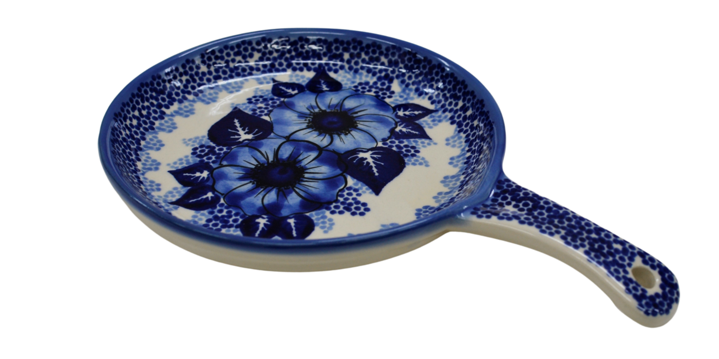Ceramiczna patelnia duża, wymalowana w tradycyjne bolesławieckie wzory. Naczynie służące do podawania jajecznicy, jajek sadzonych, sałatek, surówek czy świeżo upieczonych kiełbasek lub tostów z serem i szynką.