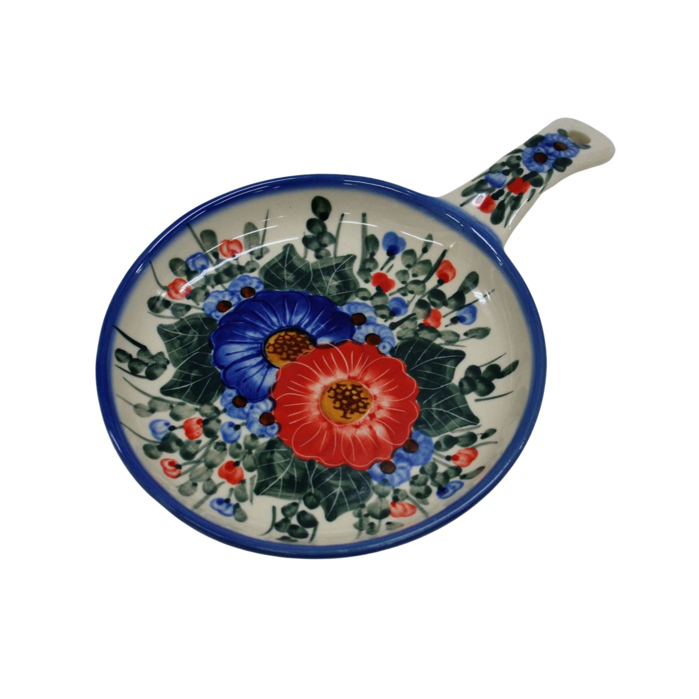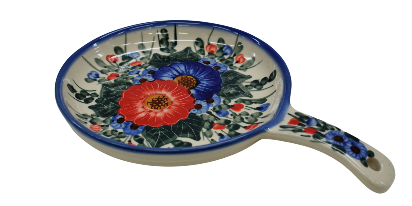 Ceramiczna patelnia duża, wymalowana w tradycyjne bolesławieckie wzory. Naczynie służące do podawania jajecznicy, jajek sadzonych, sałatek, surówek czy świeżo upieczonych kiełbasek lub tostów z serem i szynką.
