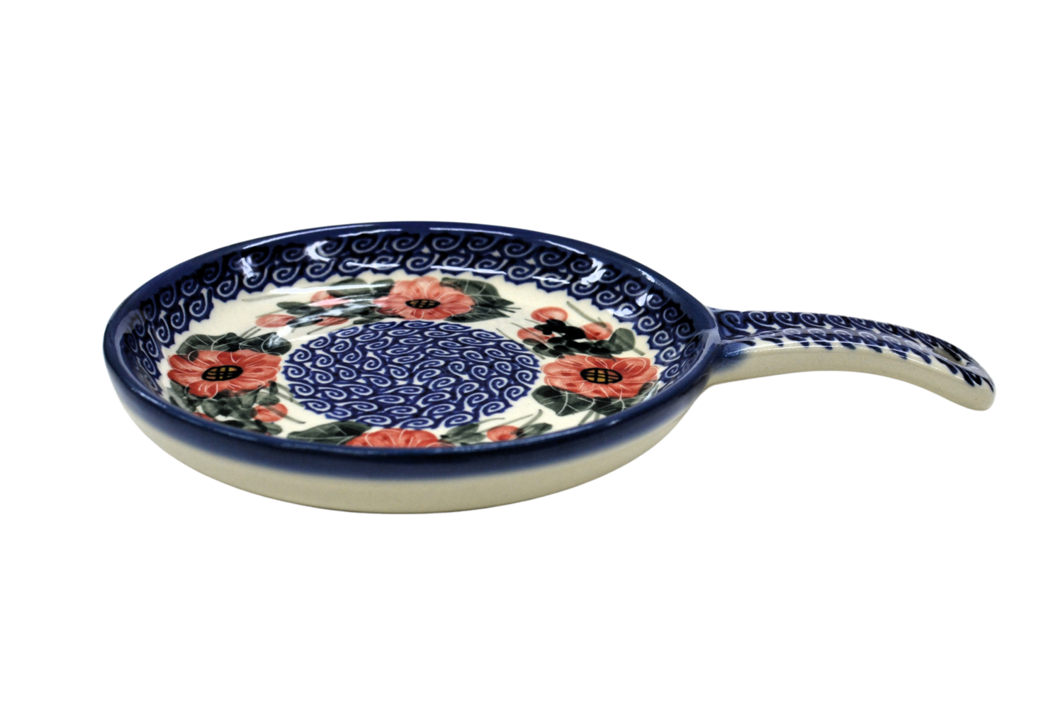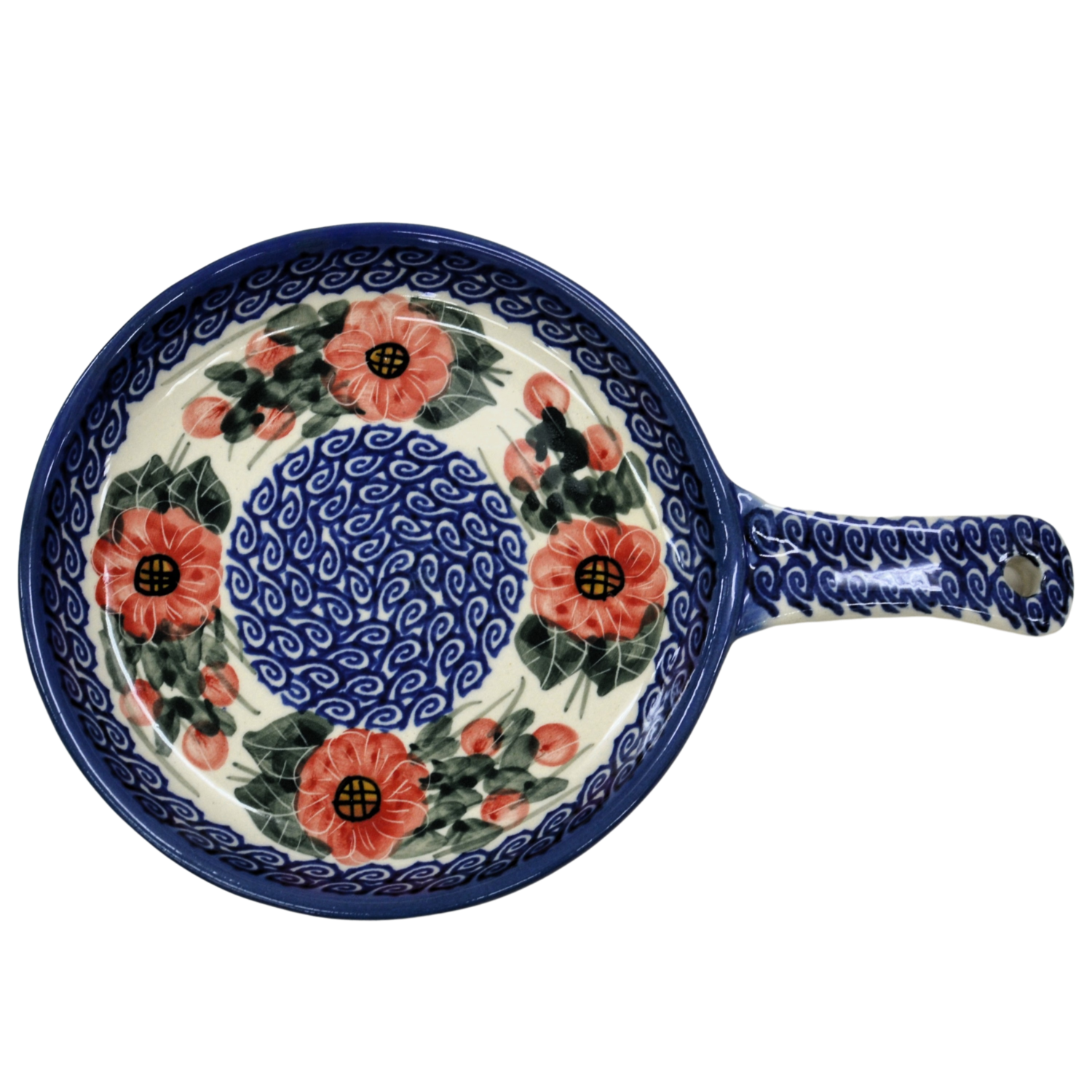 Ceramiczna patelnia duża, wymalowana w tradycyjne bolesławieckie wzory. Naczynie służące do podawania jajecznicy, jajek sadzonych, sałatek, surówek czy świeżo upieczonych kiełbasek lub tostów z serem i szynką.