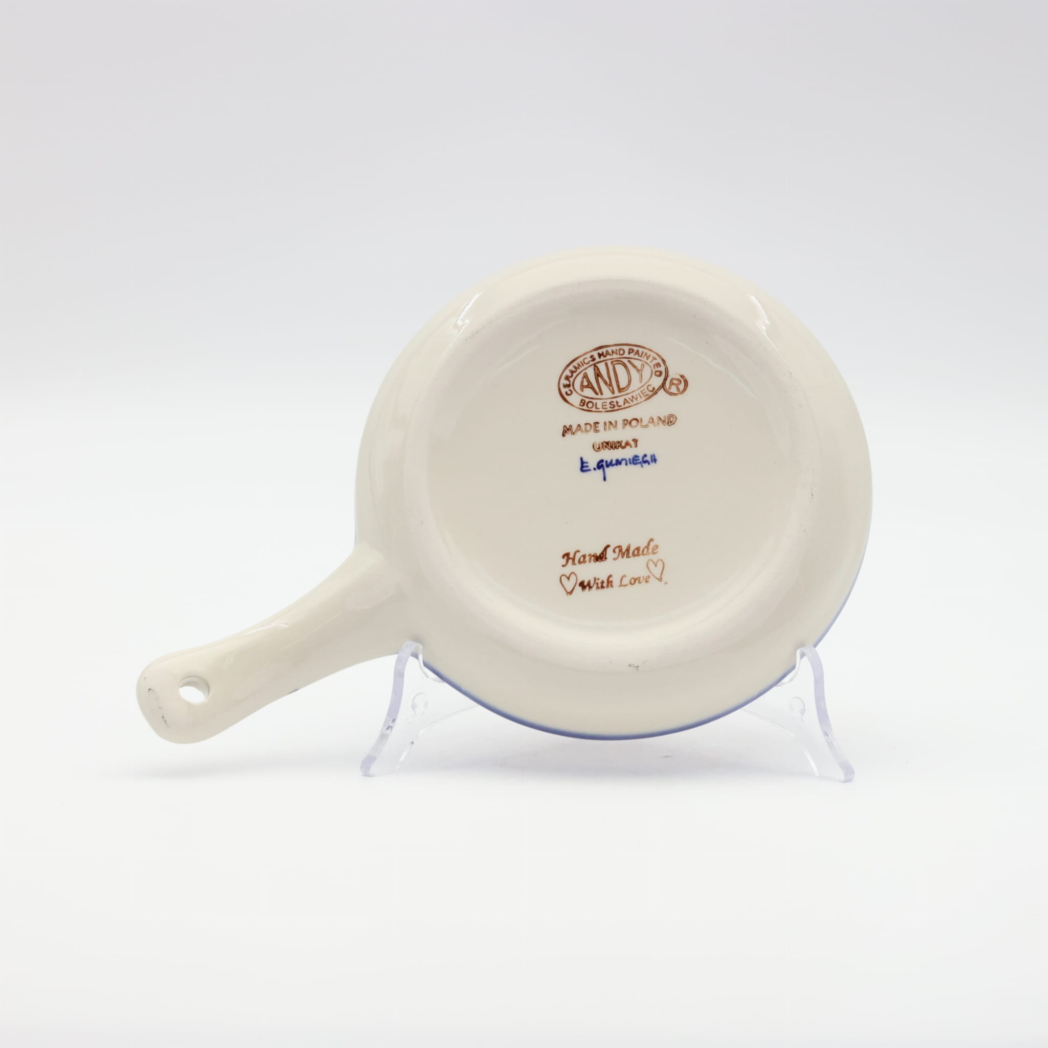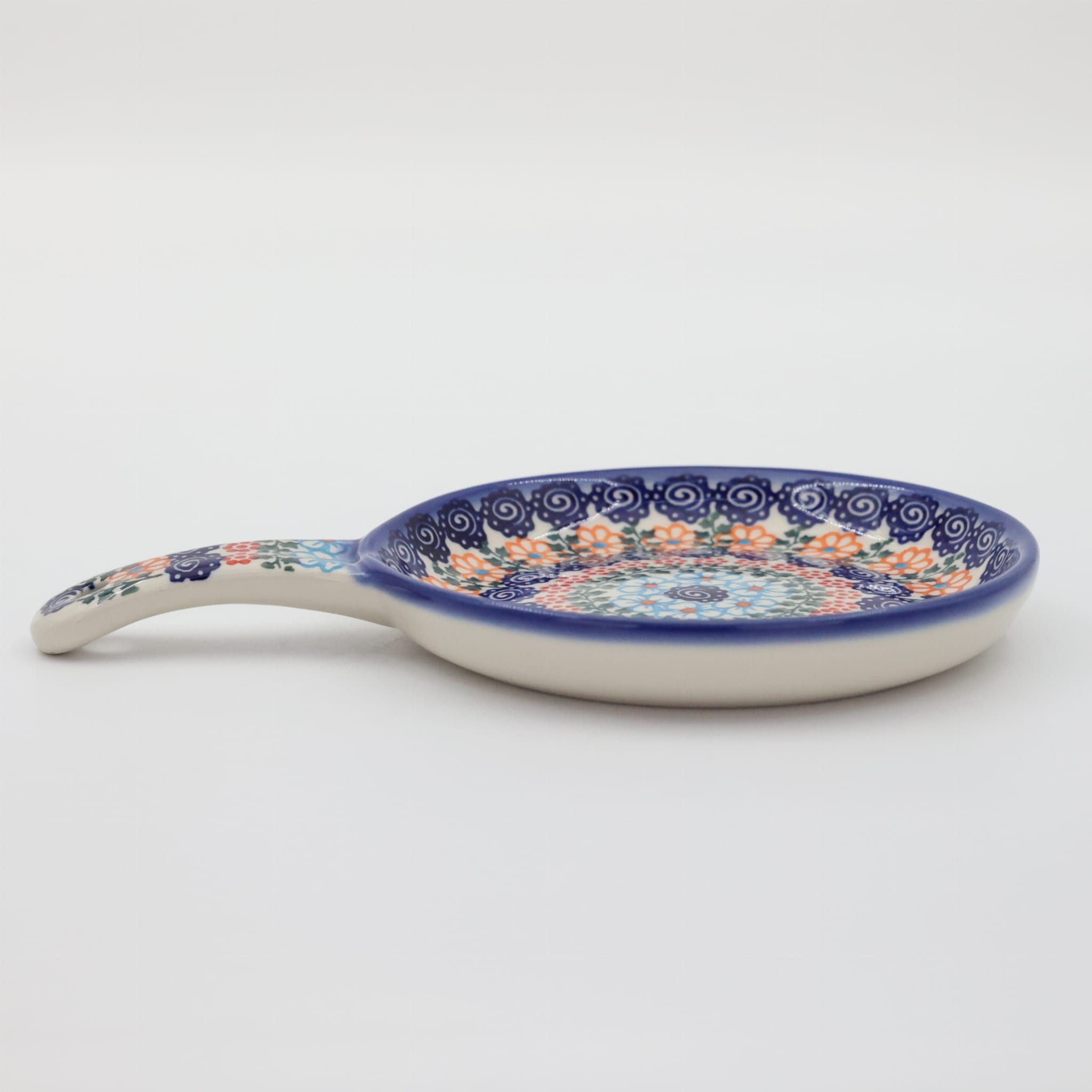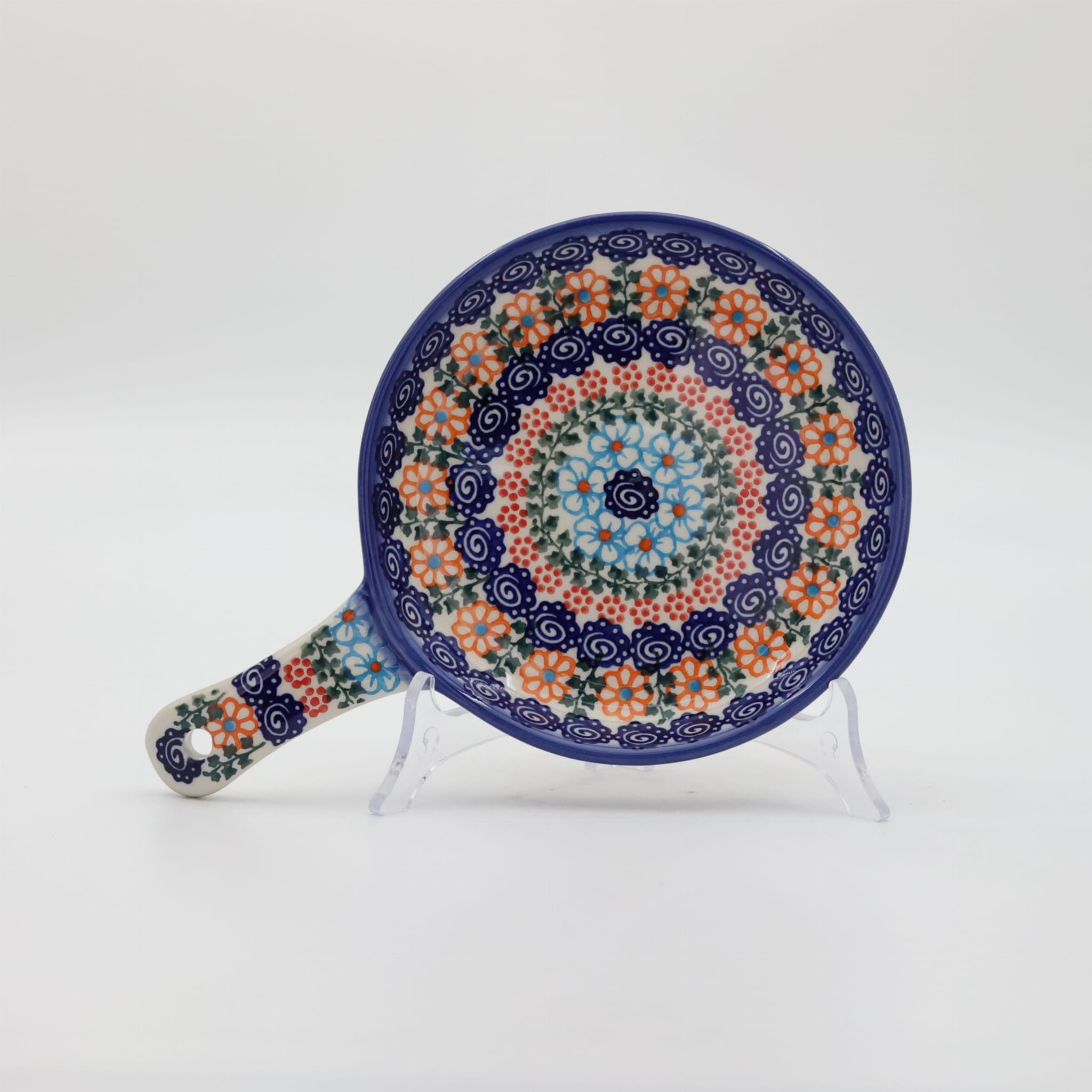 Ceramiczna patelnia duża, wymalowana w tradycyjne bolesławieckie wzory. Naczynie służące do podawania jajecznicy, jajek sadzonych, sałatek, surówek czy świeżo upieczonych kiełbasek lub tostów z serem i szynką.