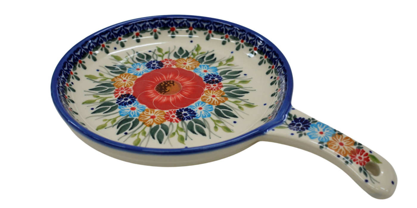 Ceramiczna patelnia duża, wymalowana w tradycyjne bolesławieckie wzory. Naczynie służące do podawania jajecznicy, jajek sadzonych, sałatek, surówek czy świeżo upieczonych kiełbasek lub tostów z serem i szynką.