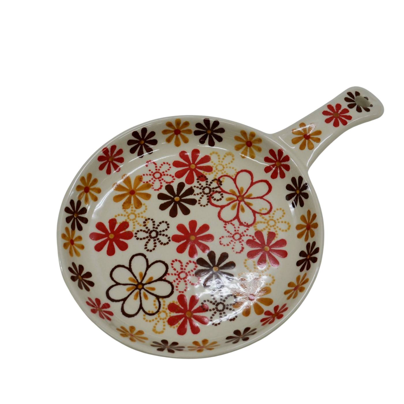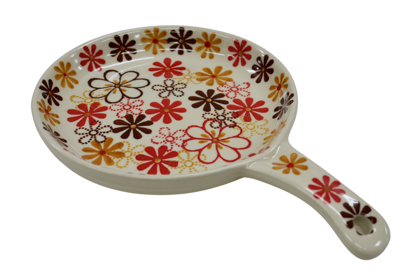 Ceramiczna patelnia duża, wymalowana w tradycyjne bolesławieckie wzory. Naczynie służące do podawania jajecznicy, jajek sadzonych, sałatek, surówek czy świeżo upieczonych kiełbasek lub tostów z serem i szynką.