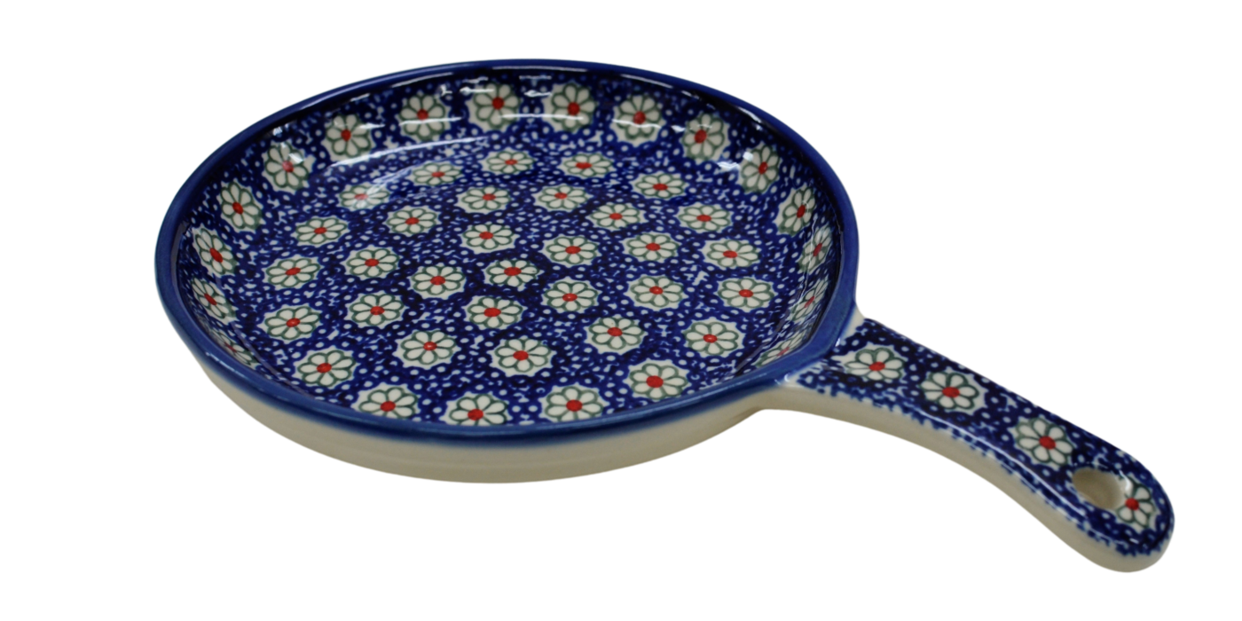 Ceramiczna patelnia duża, wymalowana w tradycyjne bolesławieckie wzory. Naczynie służące do podawania jajecznicy, jajek sadzonych, sałatek, surówek czy świeżo upieczonych kiełbasek lub tostów z serem i szynką.