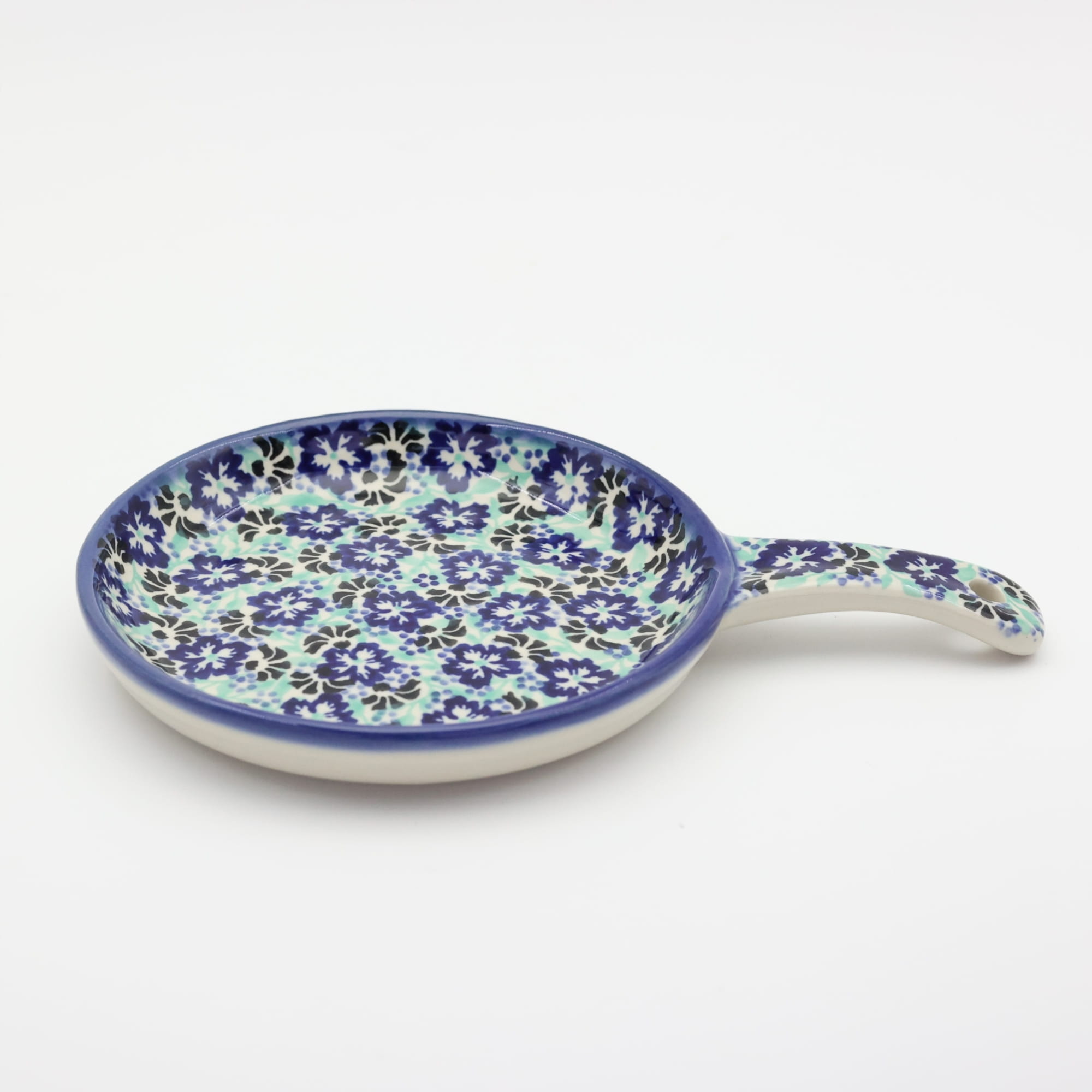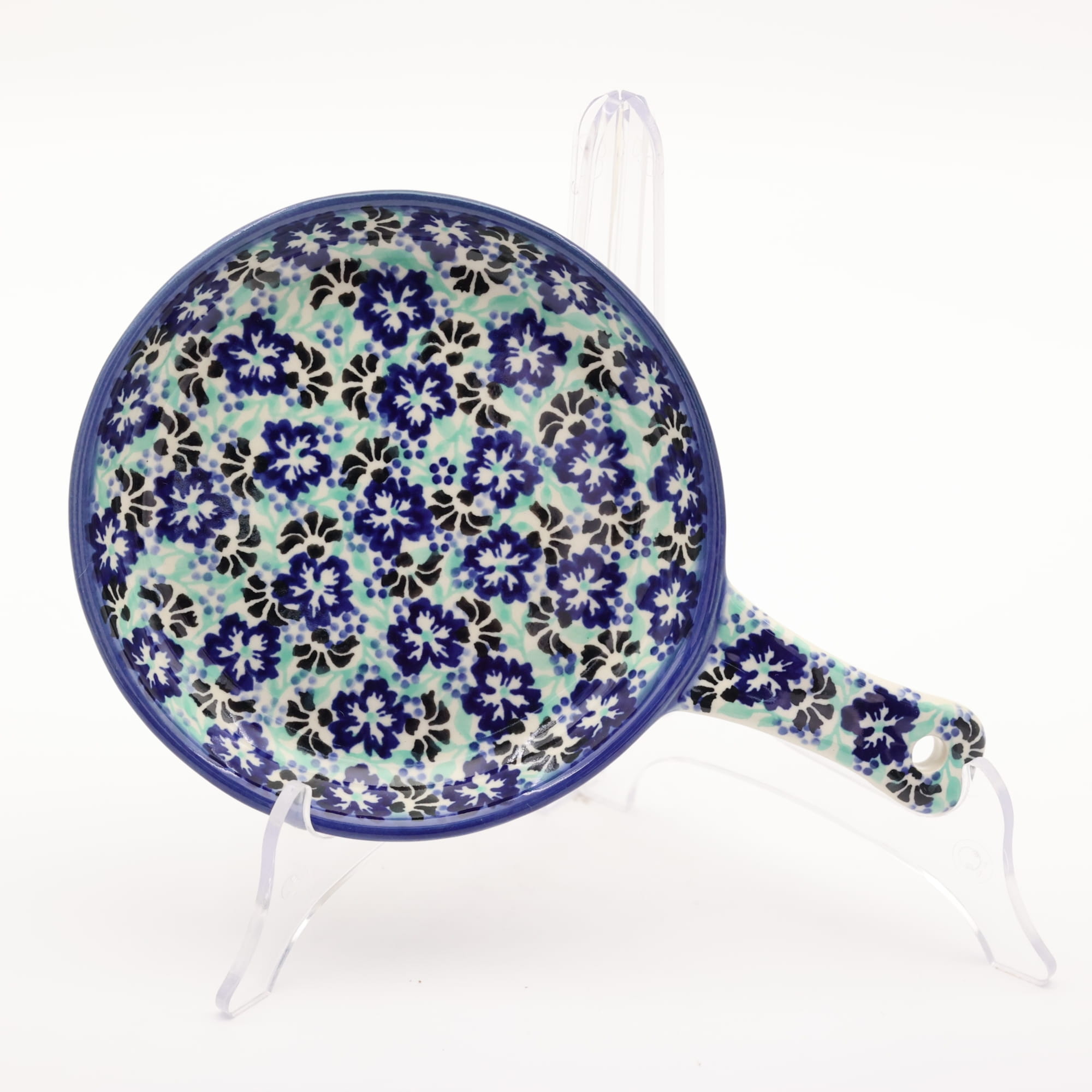 Ceramiczna patelnia duża, wymalowana w tradycyjne bolesławieckie wzory. Naczynie służące do podawania jajecznicy, jajek sadzonych, sałatek, surówek czy świeżo upieczonych kiełbasek lub tostów z serem i szynką.