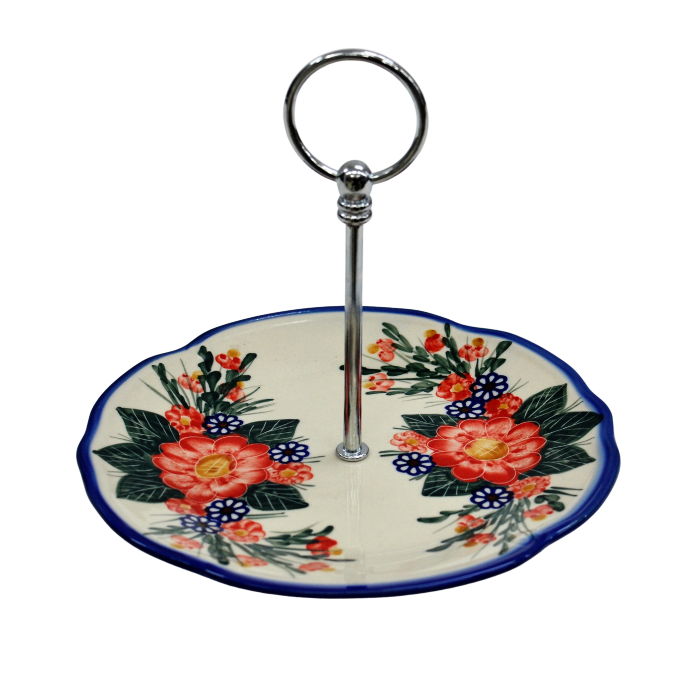 Patera (etażerka) wzbogaci artystyczne nakrycie stołu i pięknie wyeksponuje najsłodszy deser. Patera jest łatwa w przenoszeniu i ustawianiu w dowolnie wybranym miejscu dzięki uchwytowi ze stali nierdzewnej. Ciastka, desery, owoce, ciasteczka czy torty podane na bolesławieckim naczyniu zachwycą Twoich gości.
