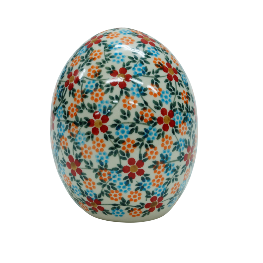 Wspaniały dekoracyjny produkt w okresie wiosny i świąt wielkanocnych. Ceramiczne jajko - średniej wielkości pisanka o wysokości 13 cm, ręcznie malowana w motywy ceramiki bolesławieckiej. Tuż obok dekoracji świątecznych takich jak: zajączki, króliczki, kurki, koguciki czy bukiety wiosennych kwiatów stanie się idealnym pomysłem na oryginalną ozdobę domu czy ogrodu.