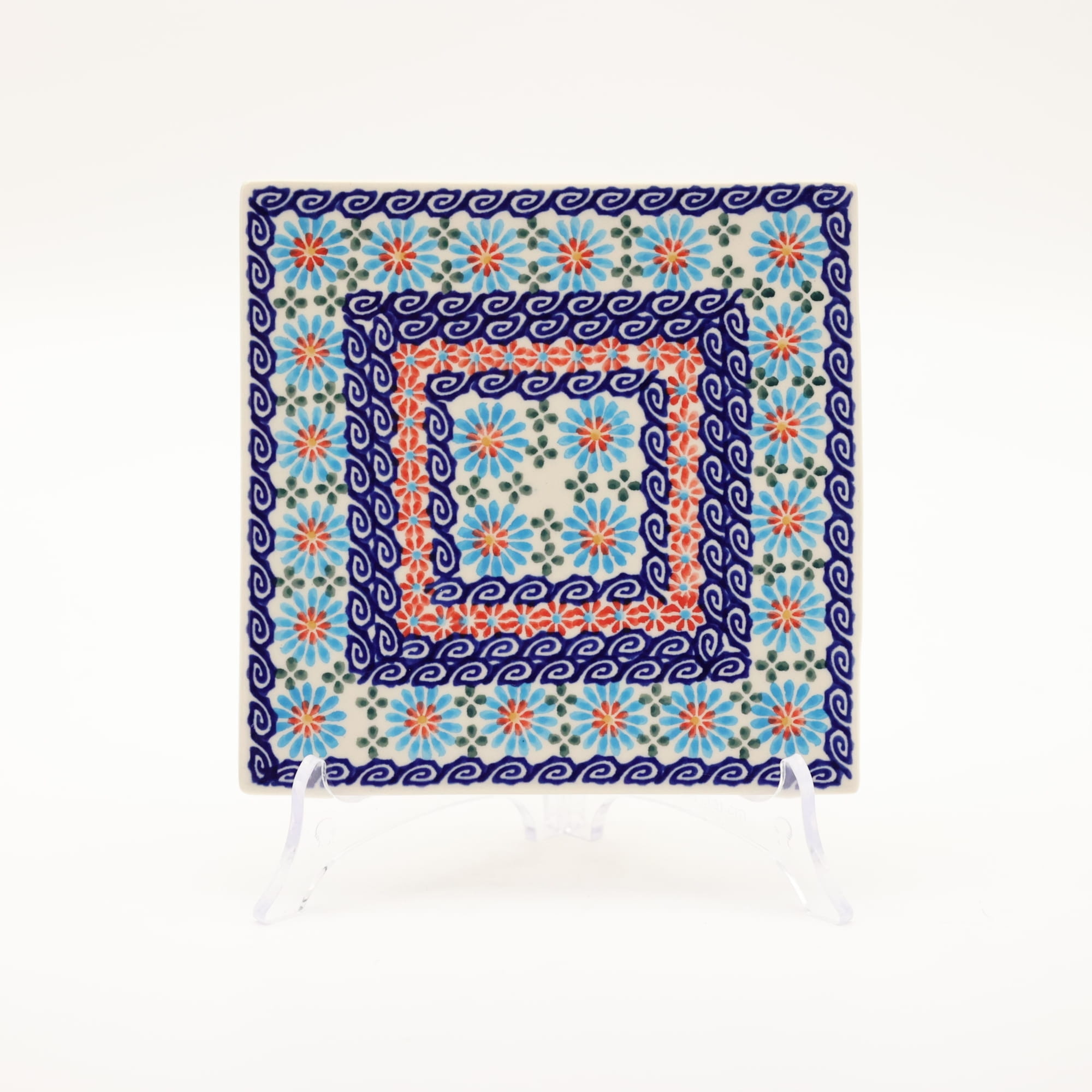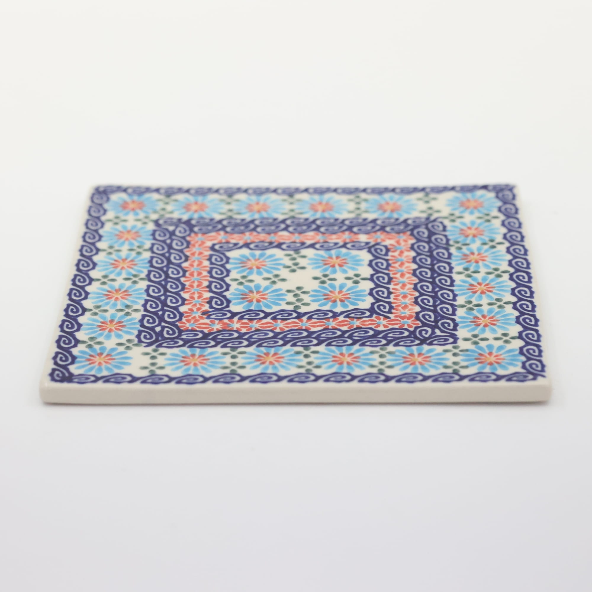 Ceramiczna podstawka, płytka pod garnek, może służyć jako tak zwany „hot plate” lub deska do krojenia. Kwadratowy kształt pozwala również wykonać z nich elementy dekoracyjne ściany, wielu naszych klientów użyło ich jako płytki ceramiczne – dekor do wykończenia ścian kuchni. Tak, to prawda, nasza oryginalna ceramika bolesławiecka ma wiele zastosowań. Płytka jest ręcznie malowana przez nieprawdopodobnie zdolnych zdobników ceramiki artystycznej przy użyciu rąk, bez żadnych procesów wspomagających przez maszyny.