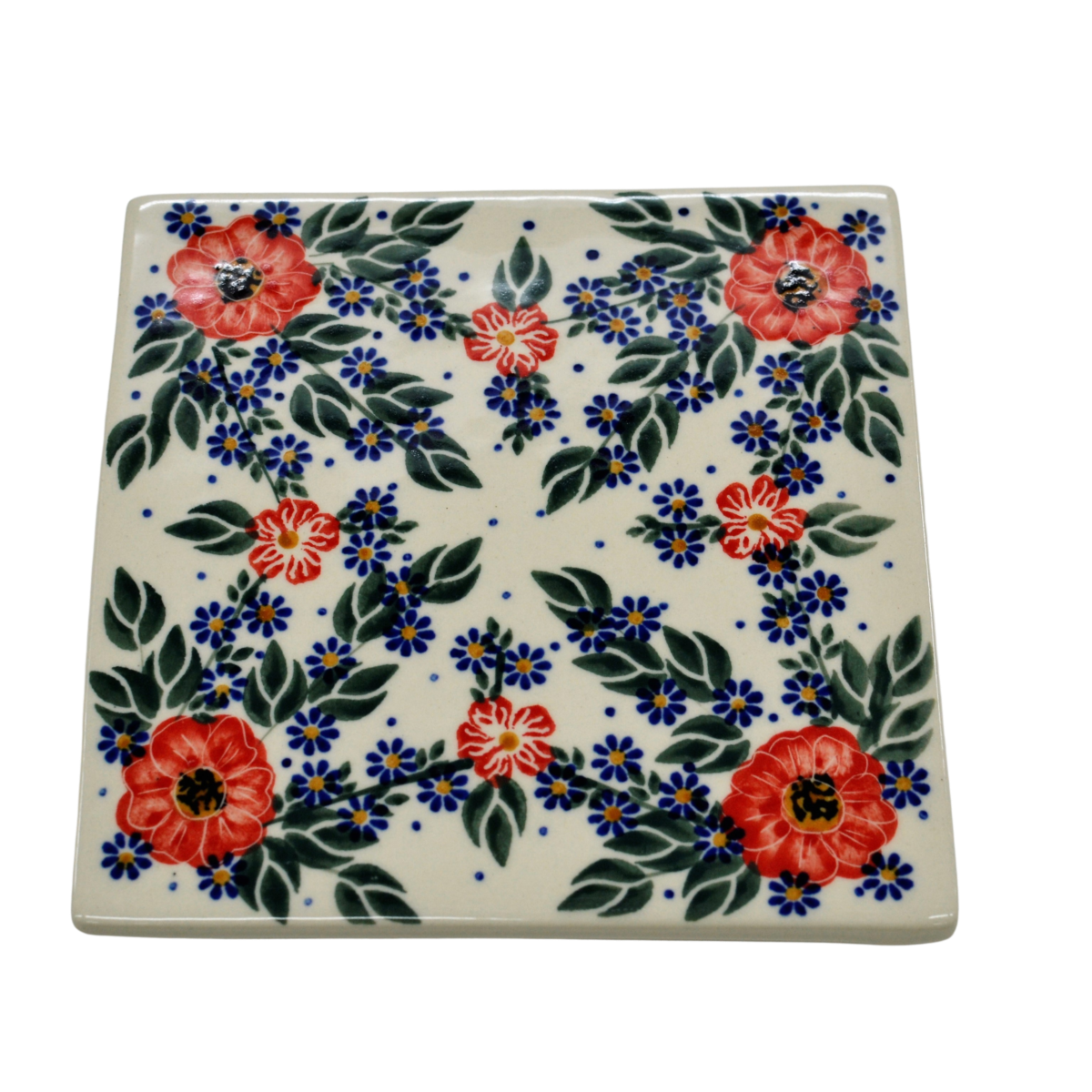 Ceramiczna podstawka, płytka pod garnek, może służyć jako tak zwany „hot plate” lub deska do krojenia. Kwadratowy kształt pozwala również wykonać z nich elementy dekoracyjne ściany, wielu naszych klientów użyło ich jako płytki ceramiczne – dekor do wykończenia ścian kuchni. Tak, to prawda, nasza oryginalna ceramika bolesławiecka ma wiele zastosowań. Płytka jest ręcznie malowana przez nieprawdopodobnie zdolnych zdobników ceramiki artystycznej przy użyciu rąk, bez żadnych procesów wspomagających przez maszyny.