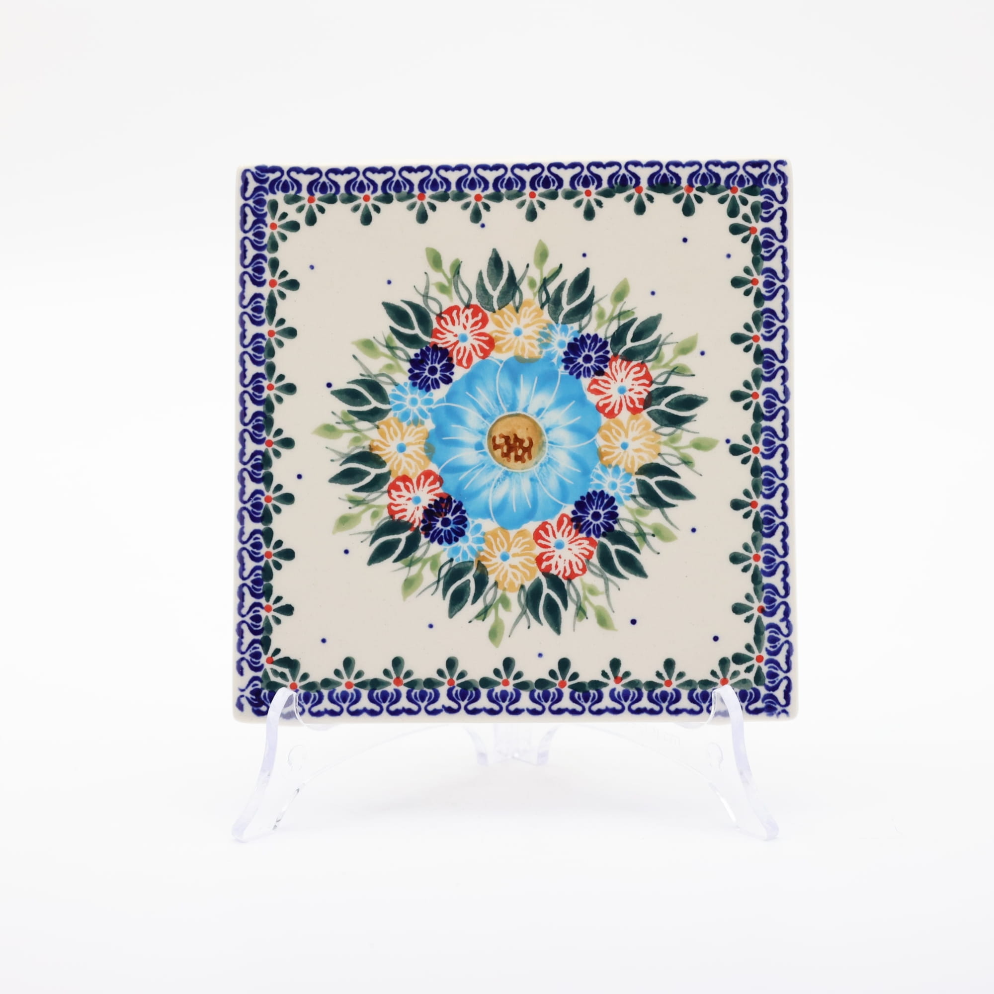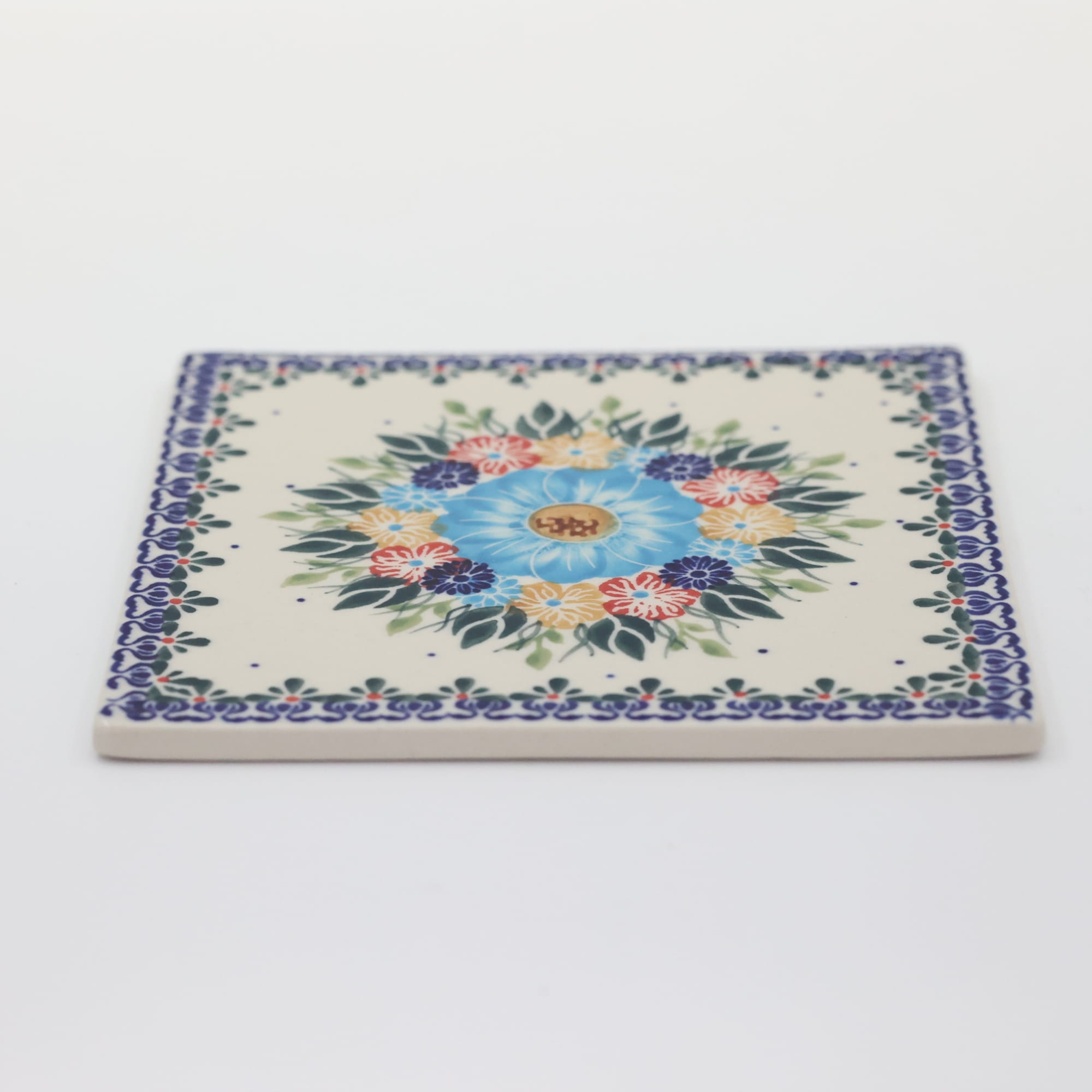 Ceramiczna podstawka, płytka pod garnek, może służyć jako tak zwany „hot plate” lub deska do krojenia. Kwadratowy kształt pozwala również wykonać z nich elementy dekoracyjne ściany, wielu naszych klientów użyło ich jako płytki ceramiczne – dekor do wykończenia ścian kuchni. Tak, to prawda, nasza oryginalna ceramika bolesławiecka ma wiele zastosowań. Płytka jest ręcznie malowana przez nieprawdopodobnie zdolnych zdobników ceramiki artystycznej przy użyciu rąk, bez żadnych procesów wspomagających przez maszyny.