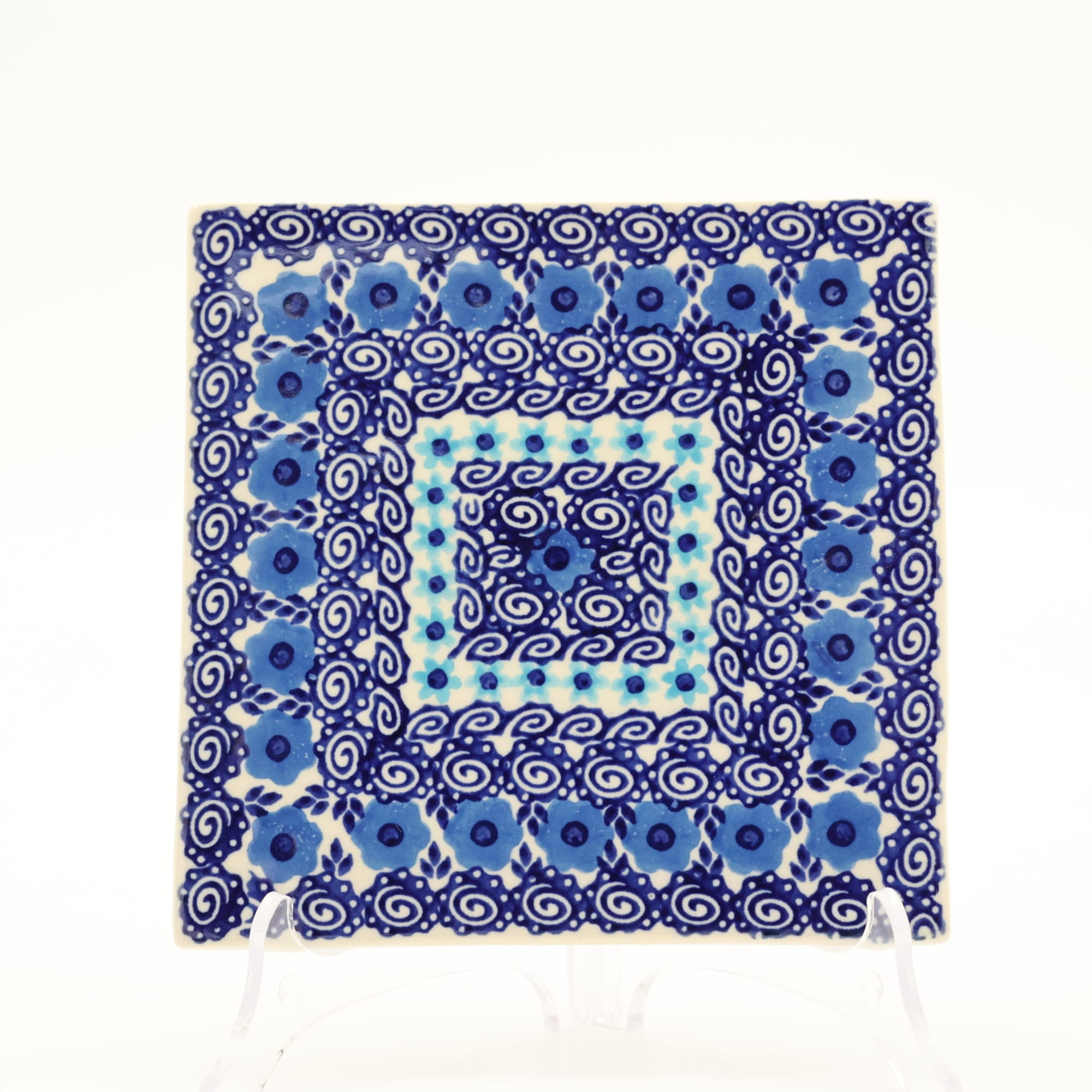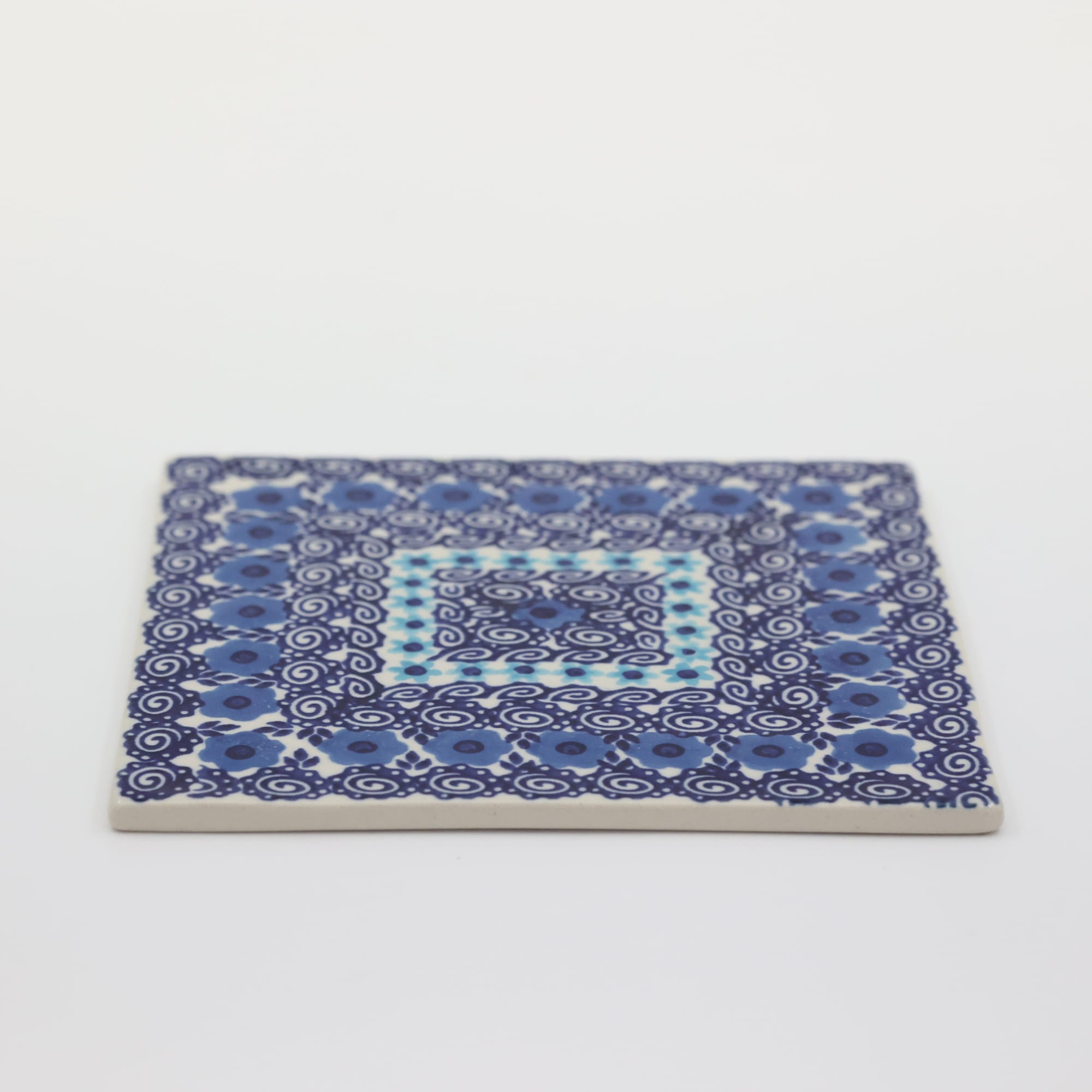 Ceramiczna podstawka, płytka pod garnek, może służyć jako tak zwany „hot plate” lub deska do krojenia. Kwadratowy kształt pozwala również wykonać z nich elementy dekoracyjne ściany, wielu naszych klientów użyło ich jako płytki ceramiczne – dekor do wykończenia ścian kuchni. Tak, to prawda, nasza oryginalna ceramika bolesławiecka ma wiele zastosowań. Płytka jest ręcznie malowana przez nieprawdopodobnie zdolnych zdobników ceramiki artystycznej przy użyciu rąk, bez żadnych procesów wspomagających przez maszyny.
